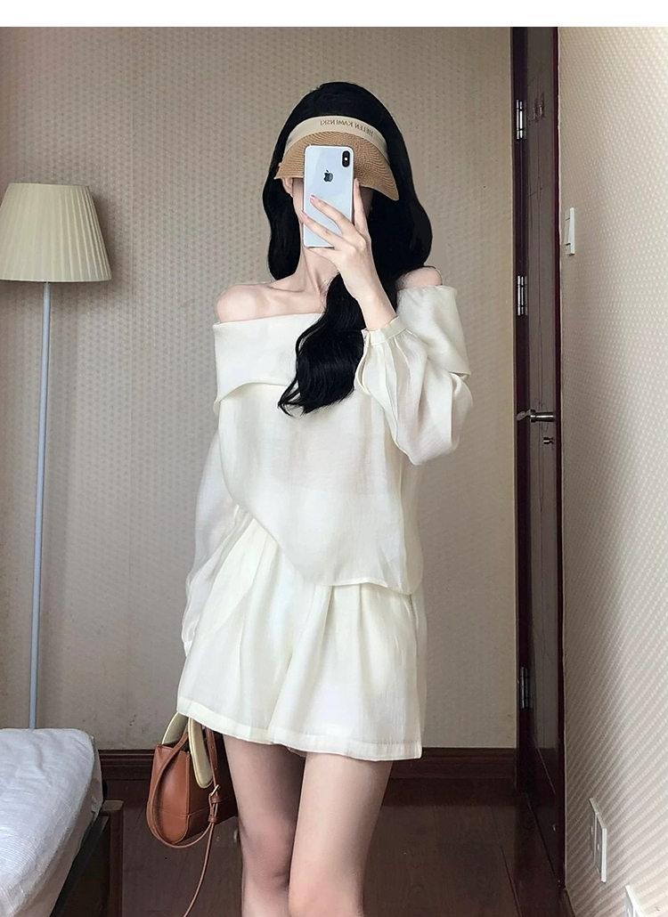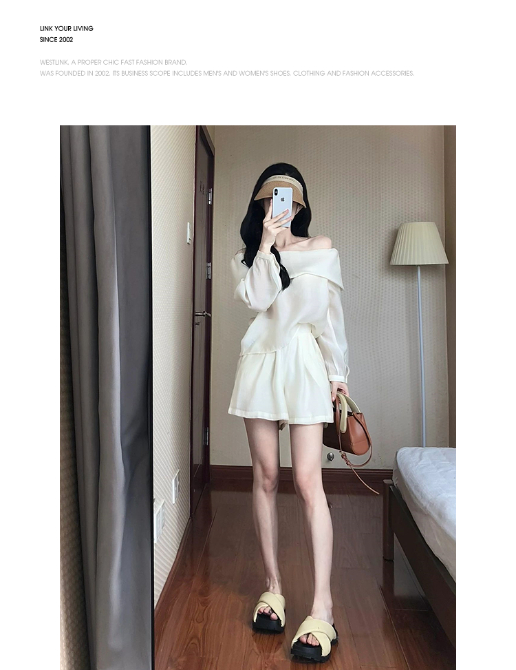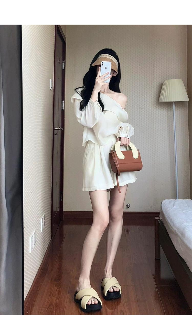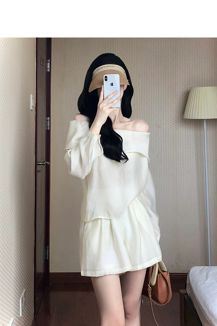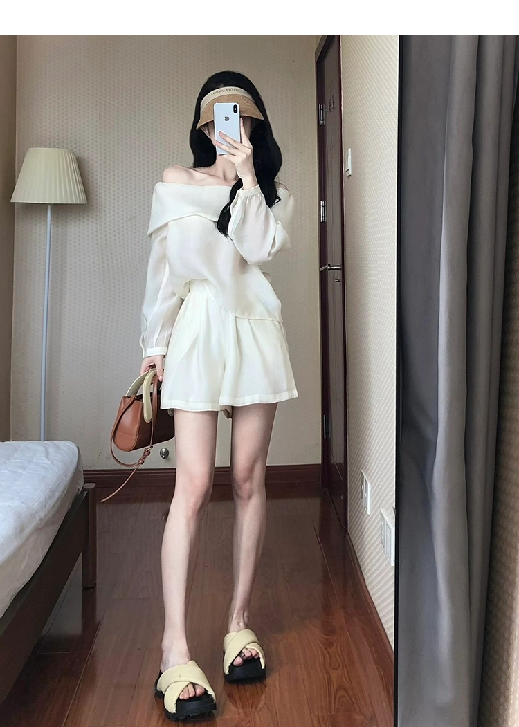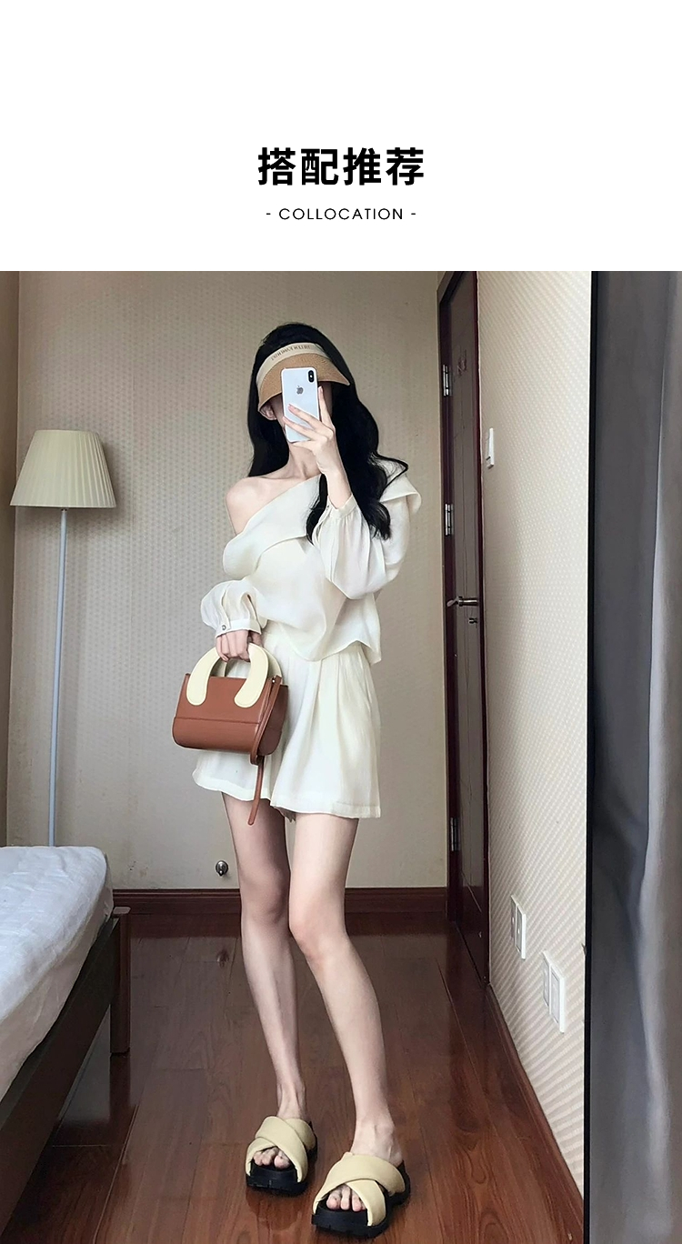 西遇宽松五分裤套装女夏季新款杏色一字肩薄款上衣两件套SS050680