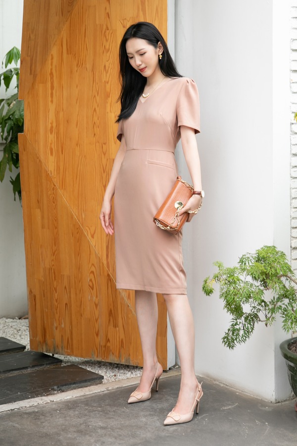 Le Malene 简约分割V领泡泡袖修身连衣裙 12897