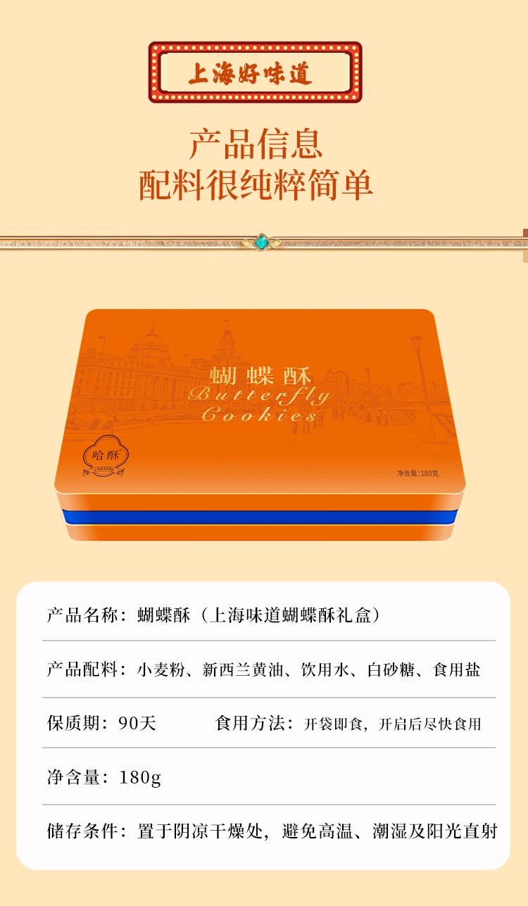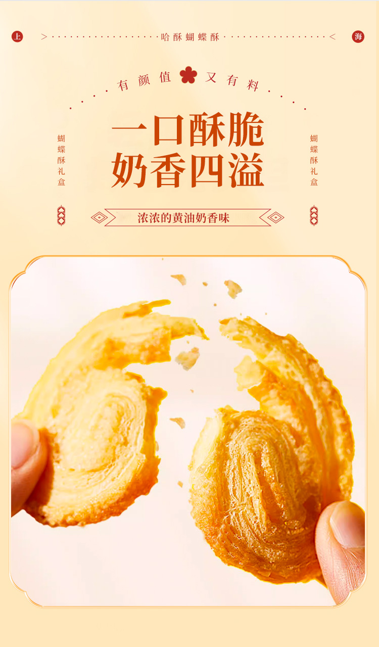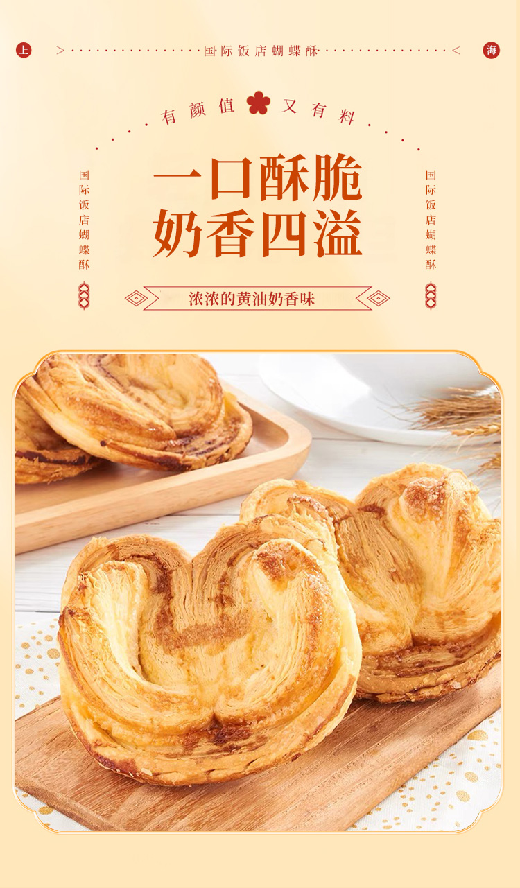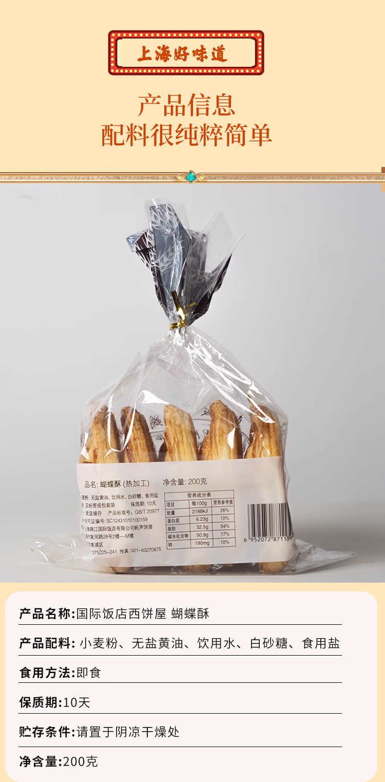 【现制现售商品,保质期较短,请确认后再下单】商品酥脆,运输途中有轻微掉渣为正常现象,介意勿拍哦~非质量问题不退换。国际饭店蝴蝶酥保质期10天,蝴蝶酥礼盒保质期90天