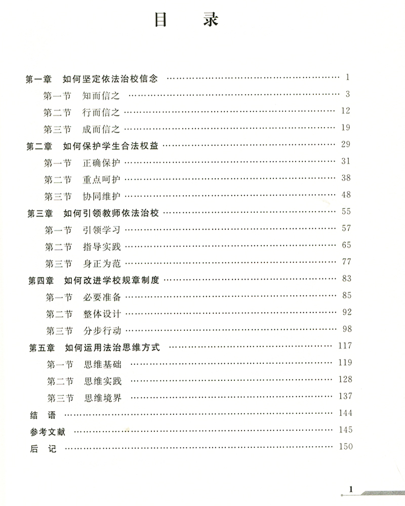 本选题分为前言、正文、文献、附录、后记五个部分。正文共5章,包括坚定依法治校信念、改进学校规章制度、引领教师依法执教、保护学生合法权益、提升法治思维品质。沿着“信念起步,经由改进-引领-保护的实践过程,直至养成良好的法治思维品质”的逻辑路线,呈现一条中小学管理者提升自身法治素养的完整路径,沿着这条路径,探讨学校管理中的问题与现象,提炼依法治校的经验和智慧,寻找解决矛盾的规律、策略与方法,促成理论向实际的转化,最终达成依法治校是为实现教育使命的价值认同。