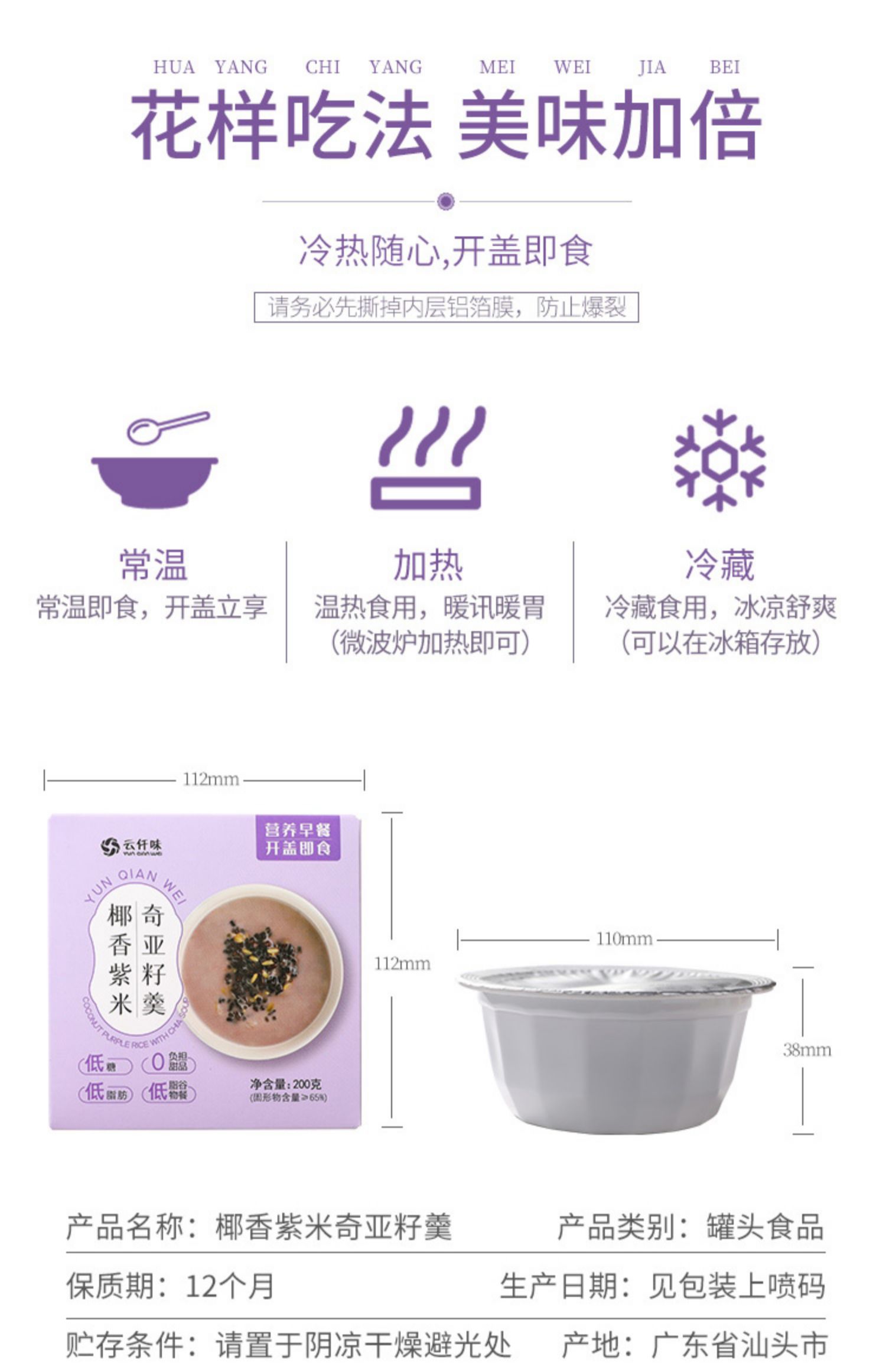 云仟味牌椰香紫米奇亚籽羹200g/盒
