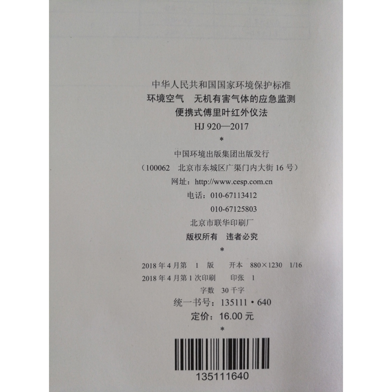 HJ 920—2017环境空气 无机有害气体的应急监测便携式傅里叶红外仪法 国家标准GB 环境保护 环境科学 135111640