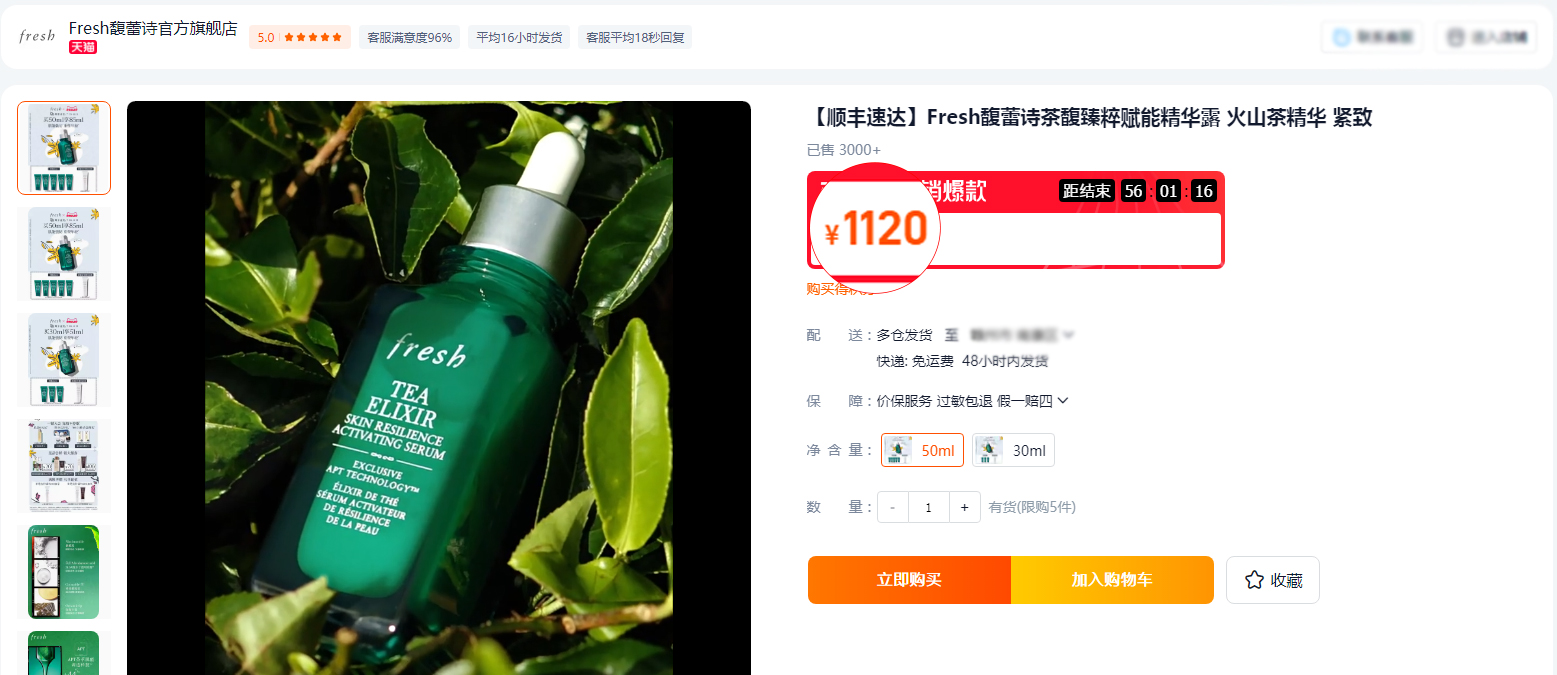 【品名】Fresh馥蕾诗茶馥臻粹赋能精华露 火山茶精华 紧致 50ml