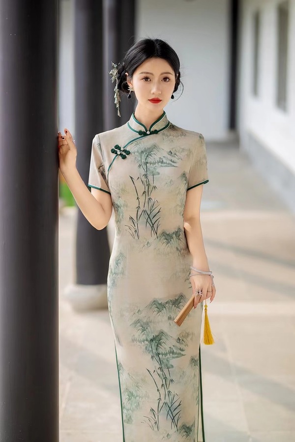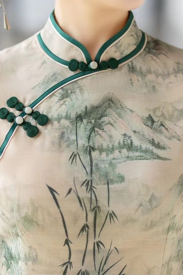 ELLA JADE 气质绿色竹叶旗袍连衣裙 20052