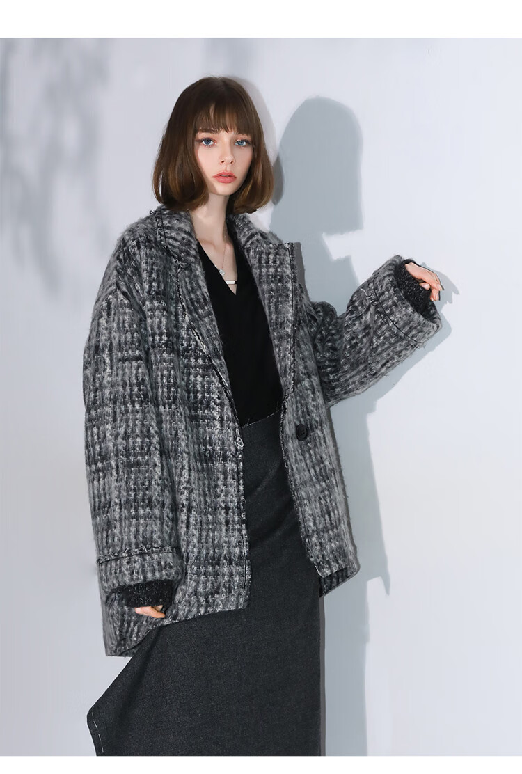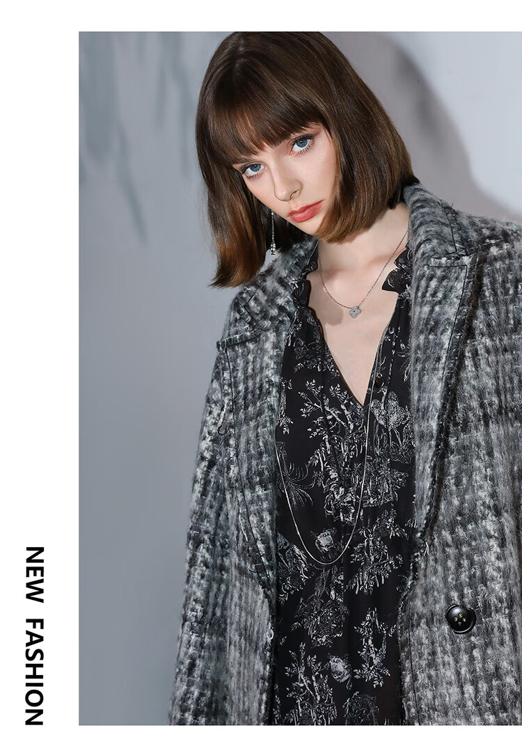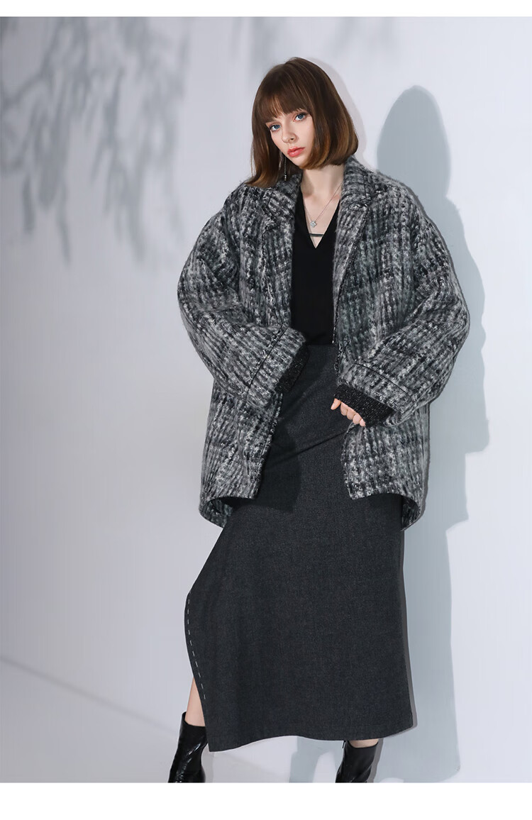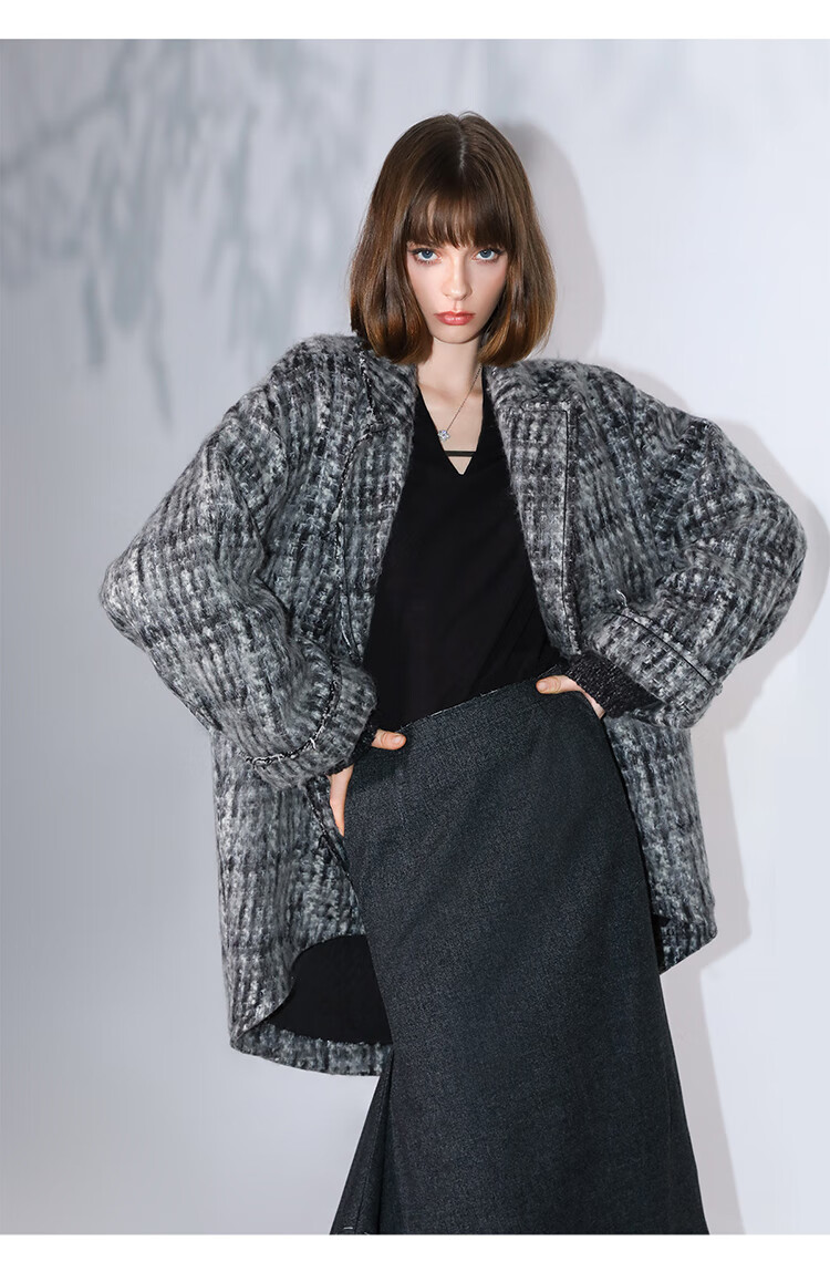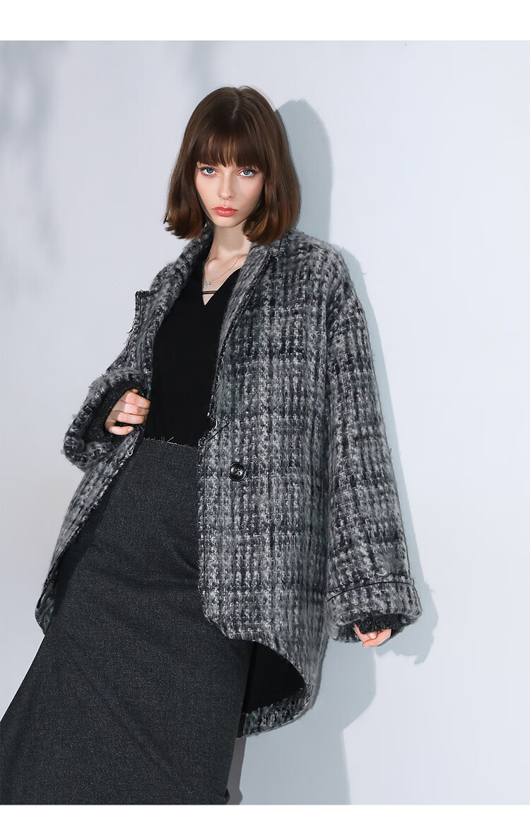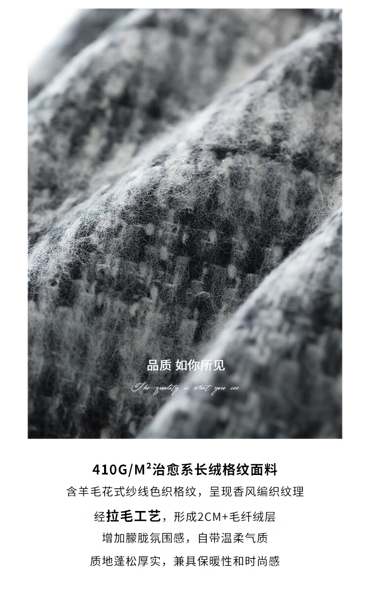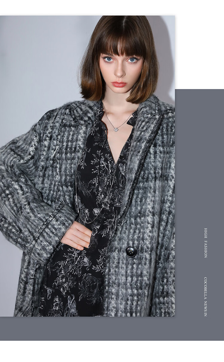 COCOBELLA[MIU系穿搭]毛绒格纹羊毛大衣女秋冬毛呢外套WL3005
