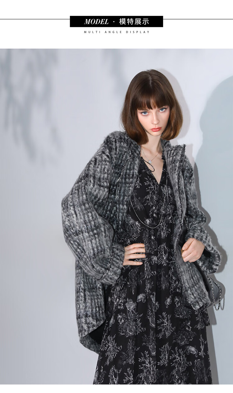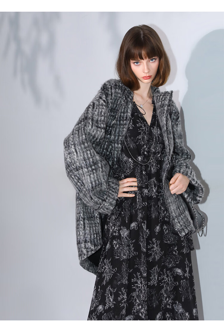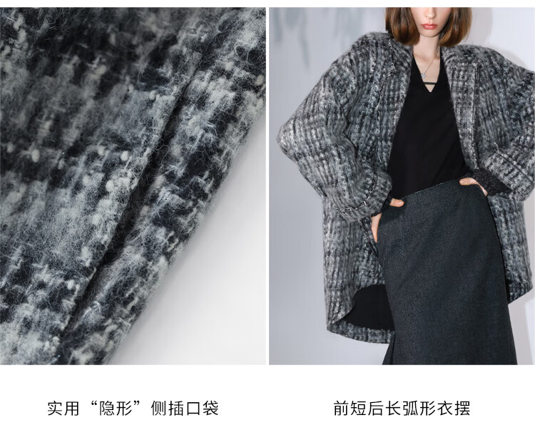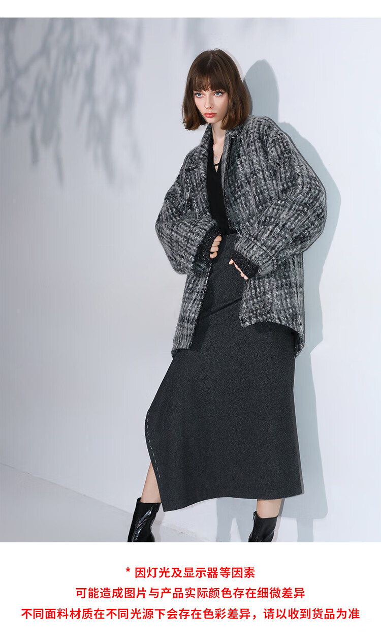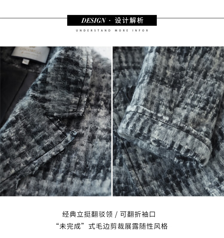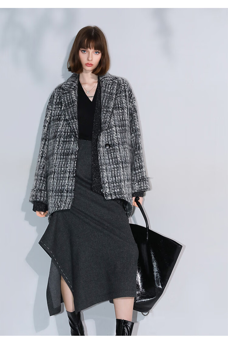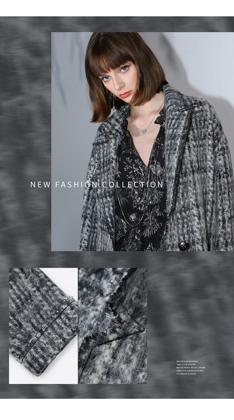 COCOBELLA[MIU系穿搭]毛绒格纹羊毛大衣女秋冬毛呢外套WL3005