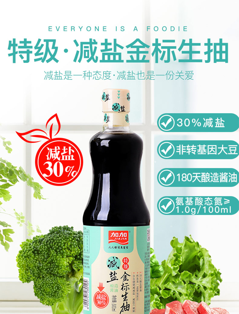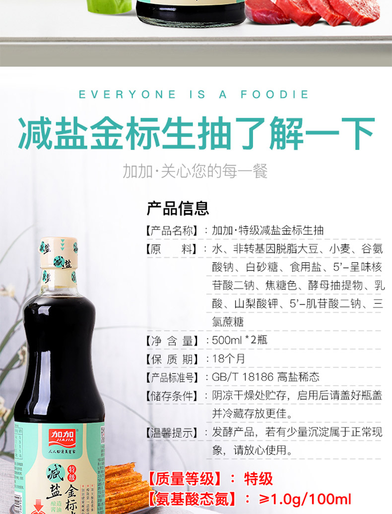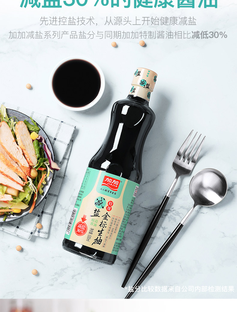 加加 减盐金标生抽 特级酿造黄豆薄盐酱油调味品 500ML*2瓶