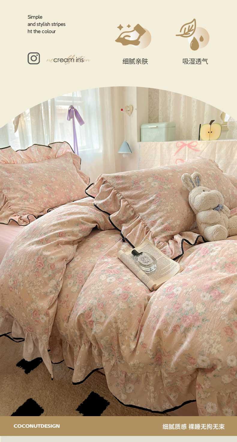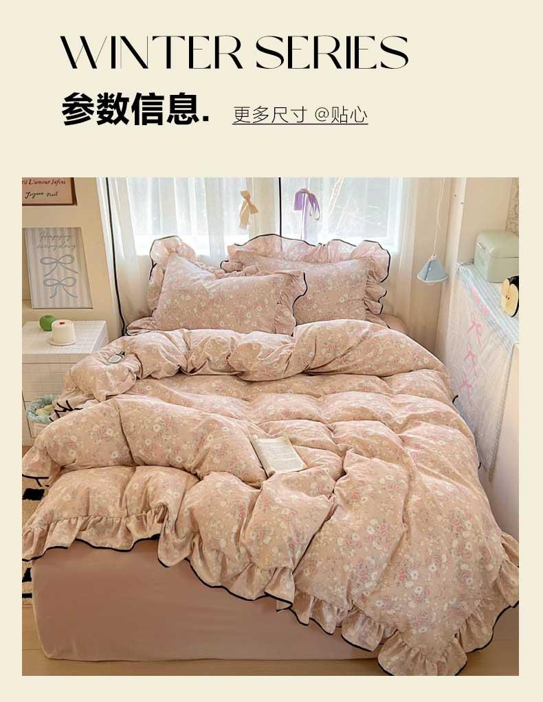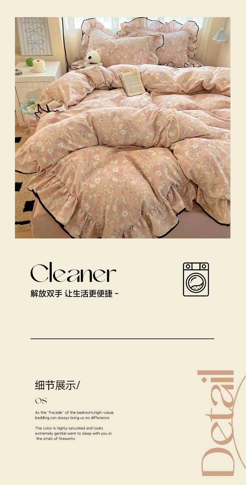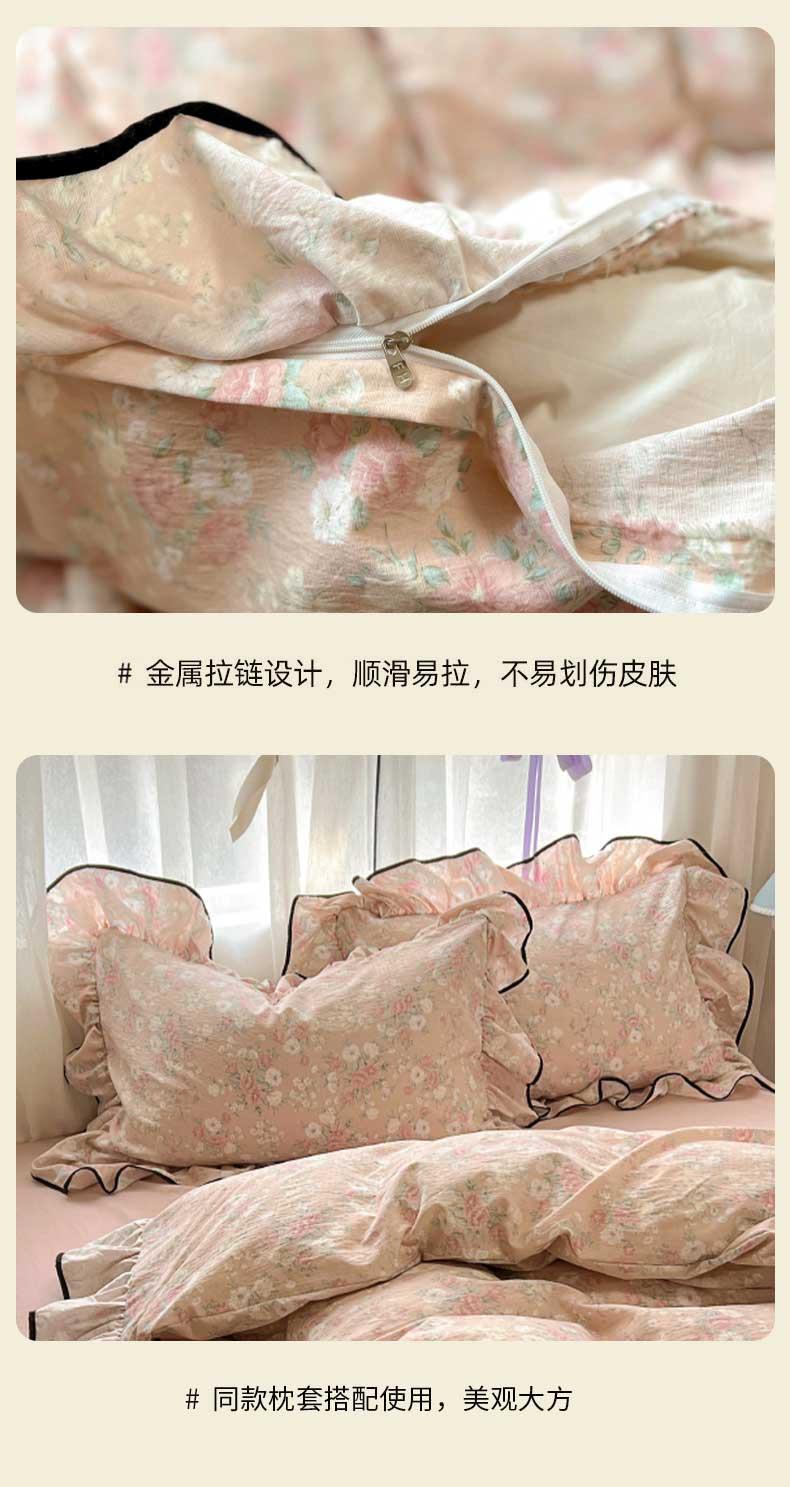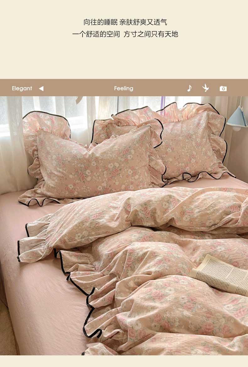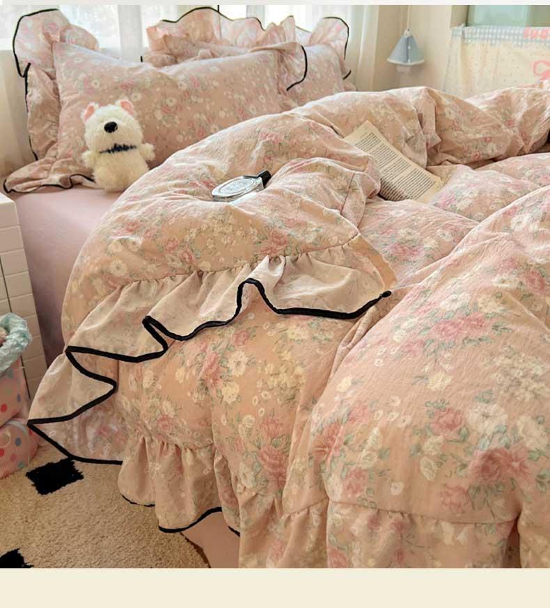 奶油花边少女粉格韩版床上四件套水洗棉双层纱被套宿舍三件套床笠