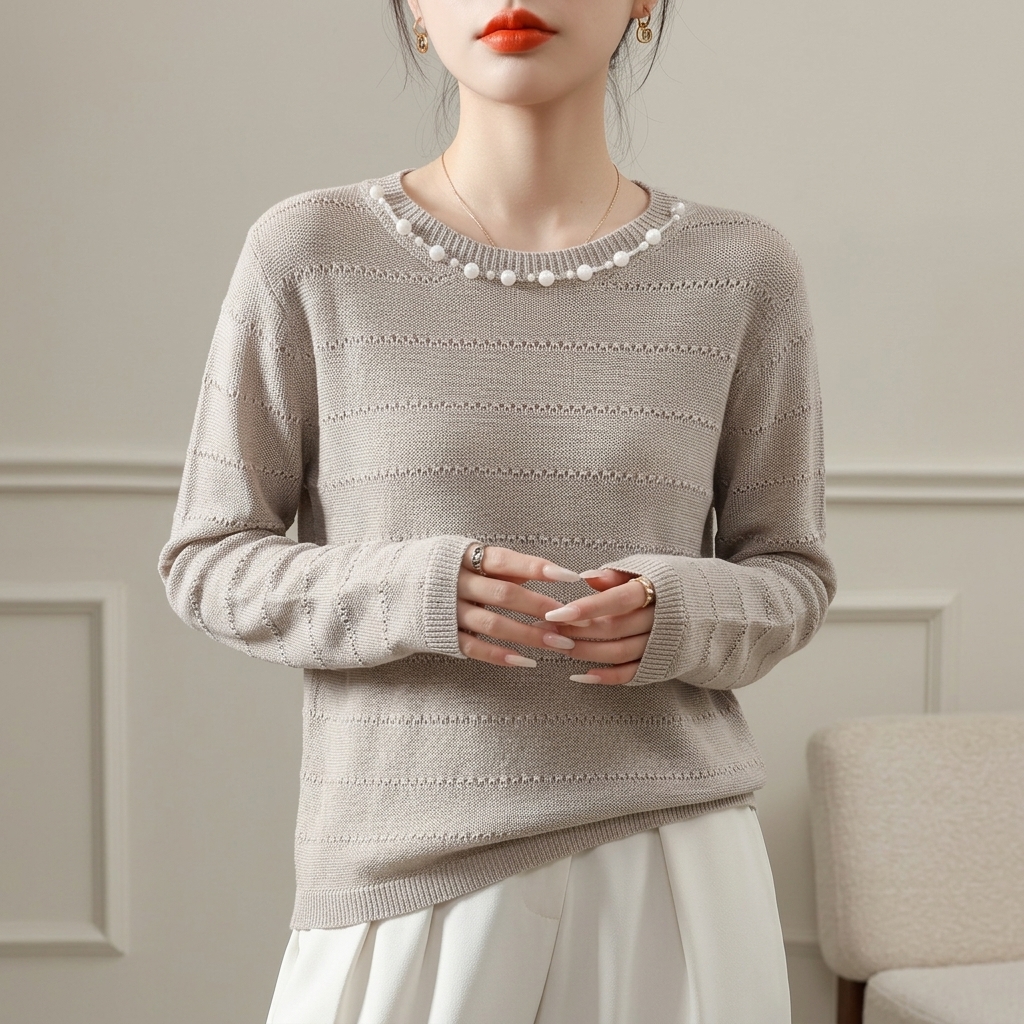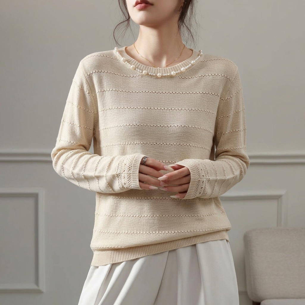 浅浅晚风~法式珍珠圆领针织衫女真丝镂空条纹长袖上衣