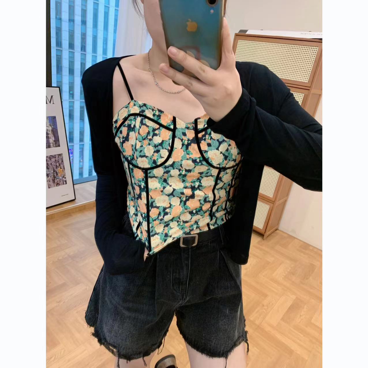 纯欲辣妹 纯色百搭短款开衫+碎花吊带印花v领小众内搭