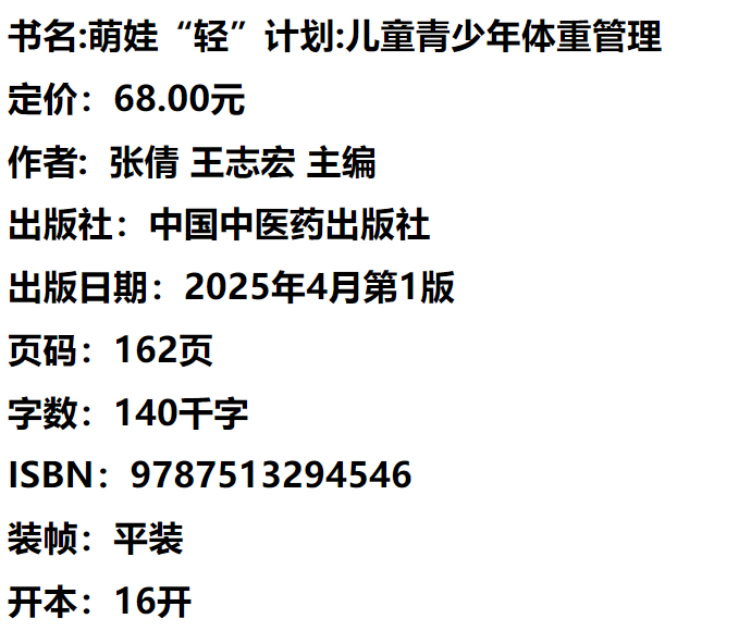 萌娃“轻”计划:儿童青少年体重管理 张倩 王志宏 主编 中国疾病预防控制中心营养与健康所 编 中国中医药出版社