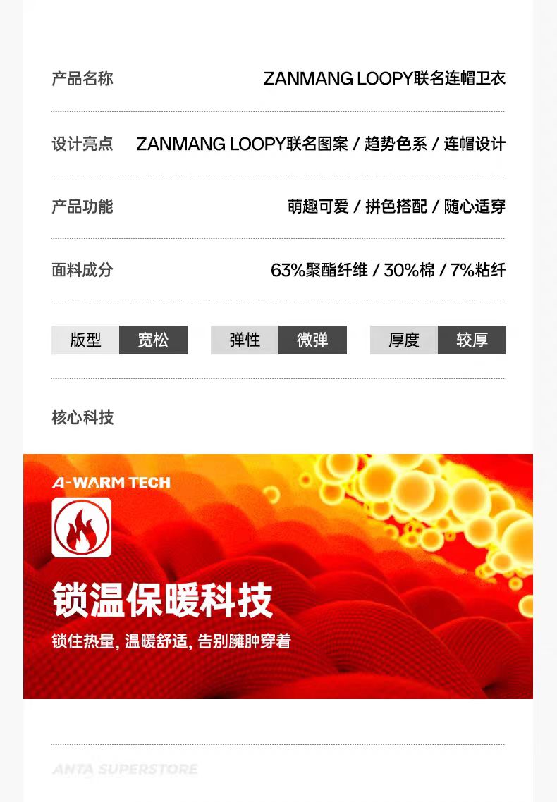 超级安踏ZANMANG LOOPY联名丨连帽卫衣女士秋冬加绒时尚套头衫162548727U