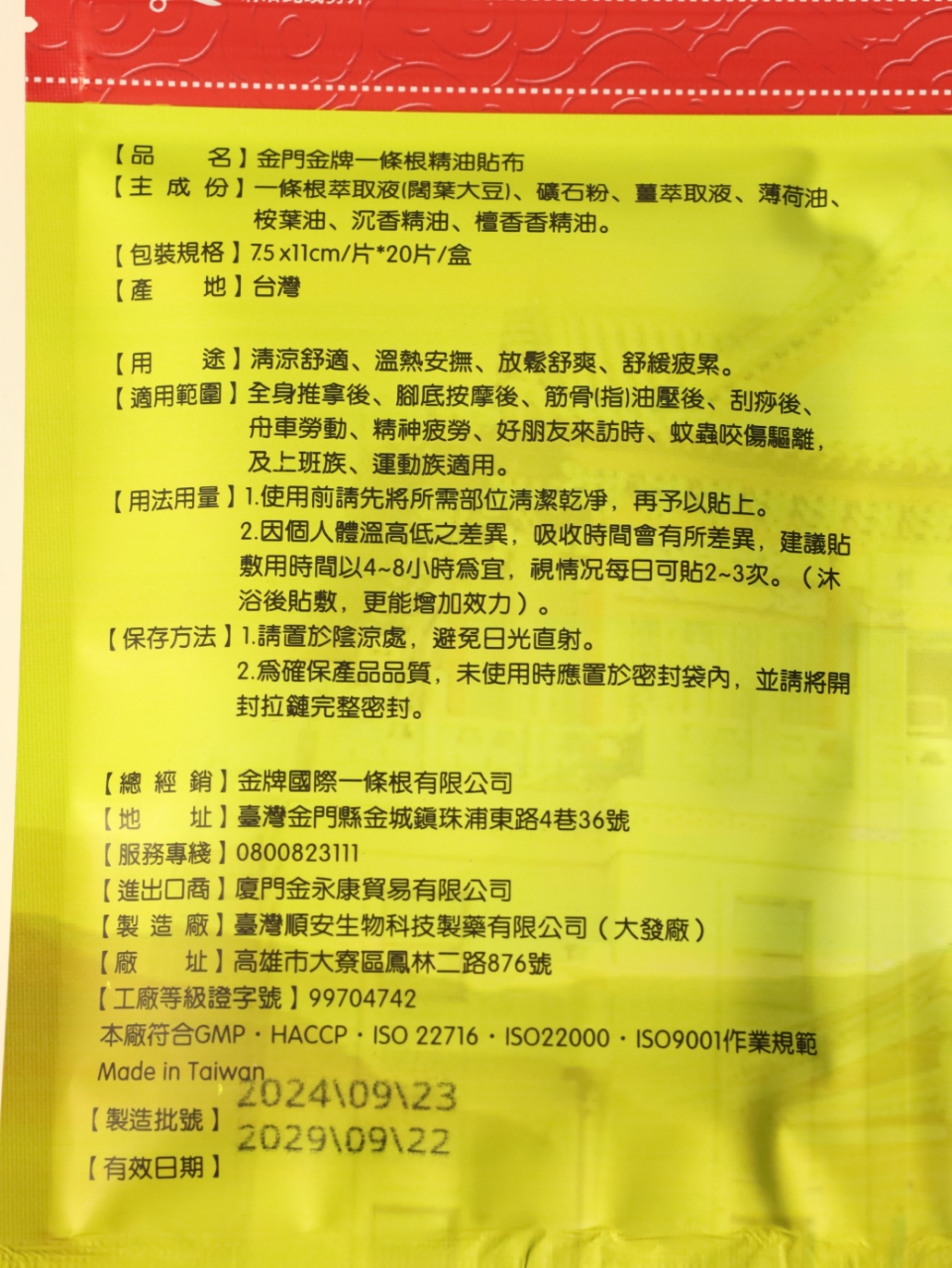 品名:金門金牌一條根精油貼布