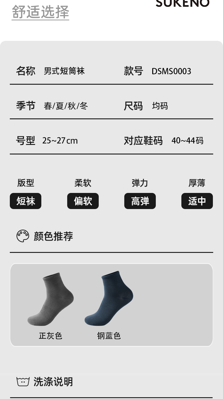 SUKENO夏季透气短筒男袜亲肤弹性支撑短袜