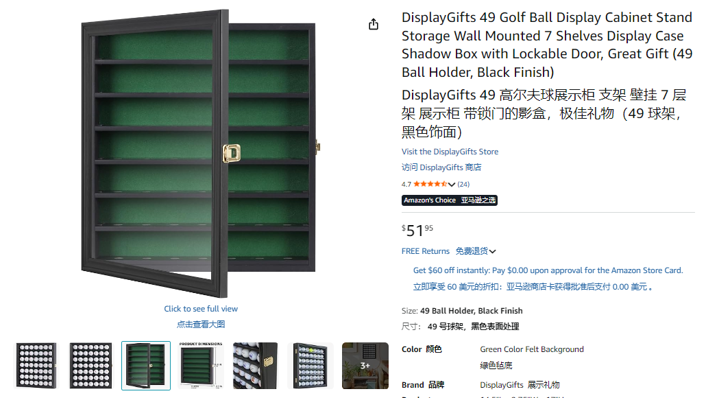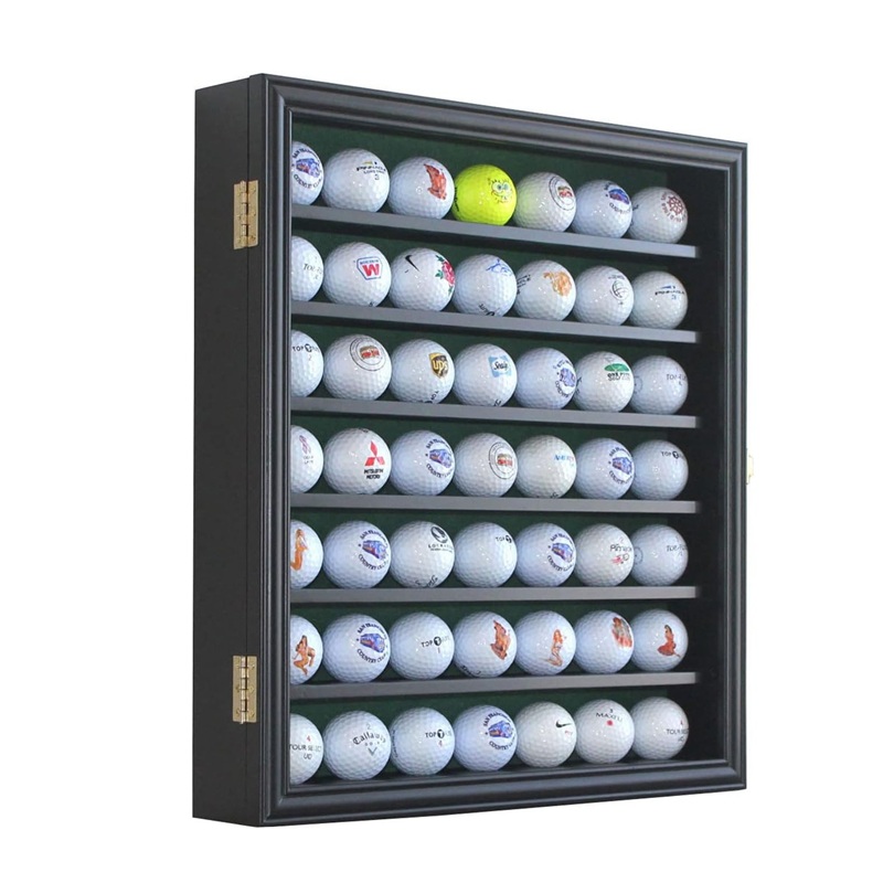 高尔夫球展示架有7个架子,可放置49个高尔夫球,架上有凹槽以防止高尔夫球滚动。优雅的高尔夫球柜,用来存放你曾打过的比赛、活动、比赛和球场的纪念品和奖杯球。高尔夫球盒表面有类似天鹅绒毡的黑色内衬。