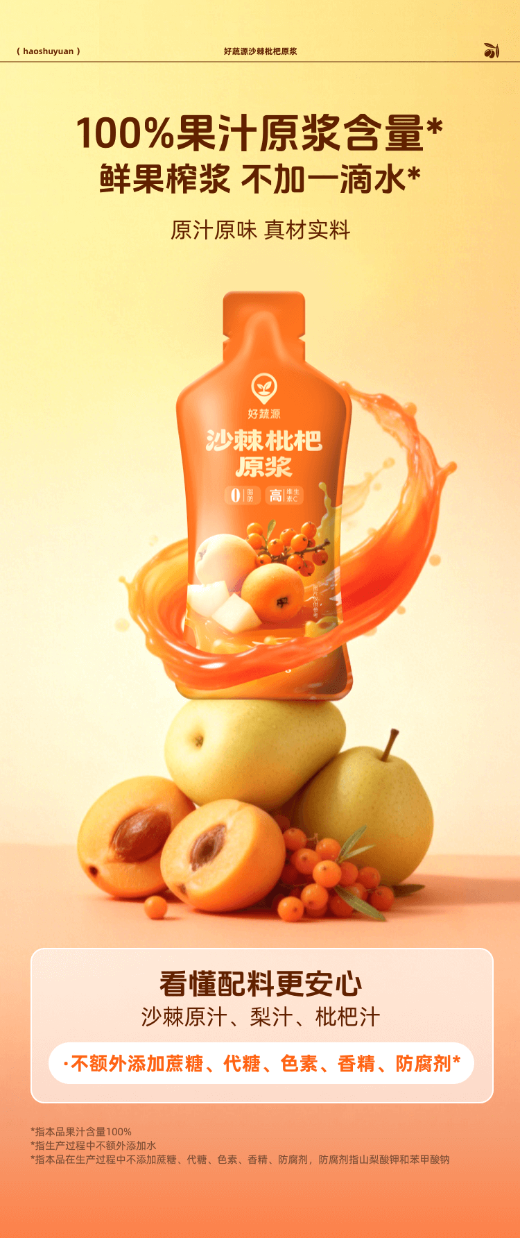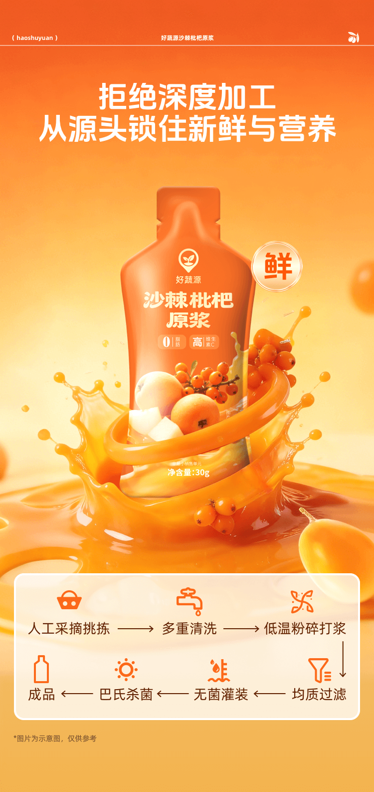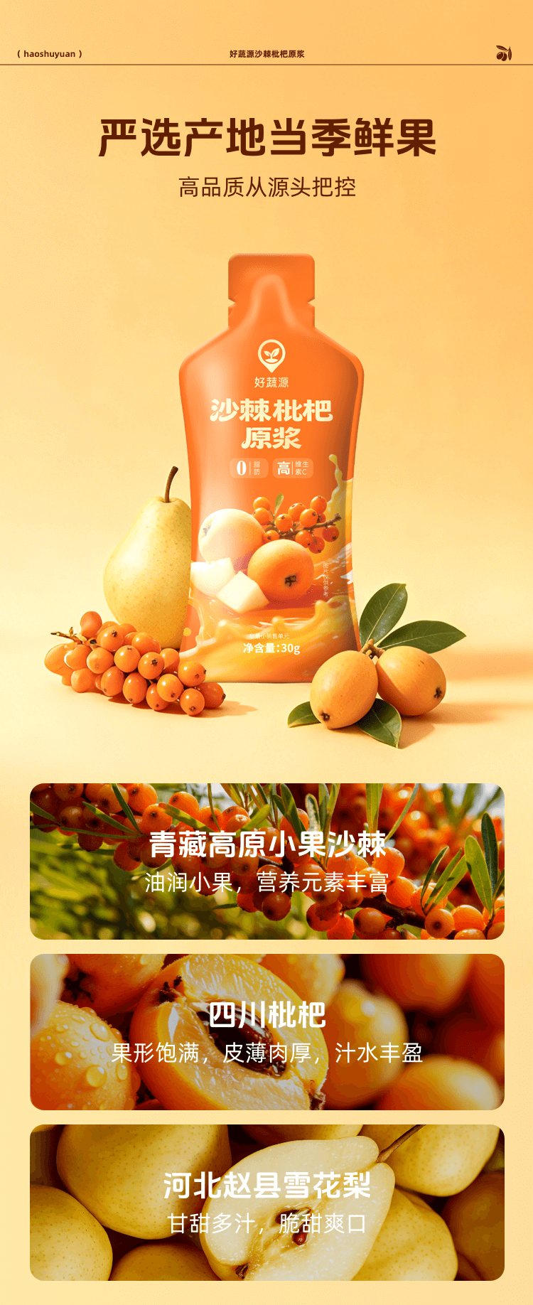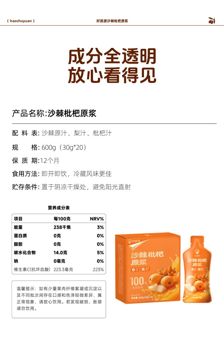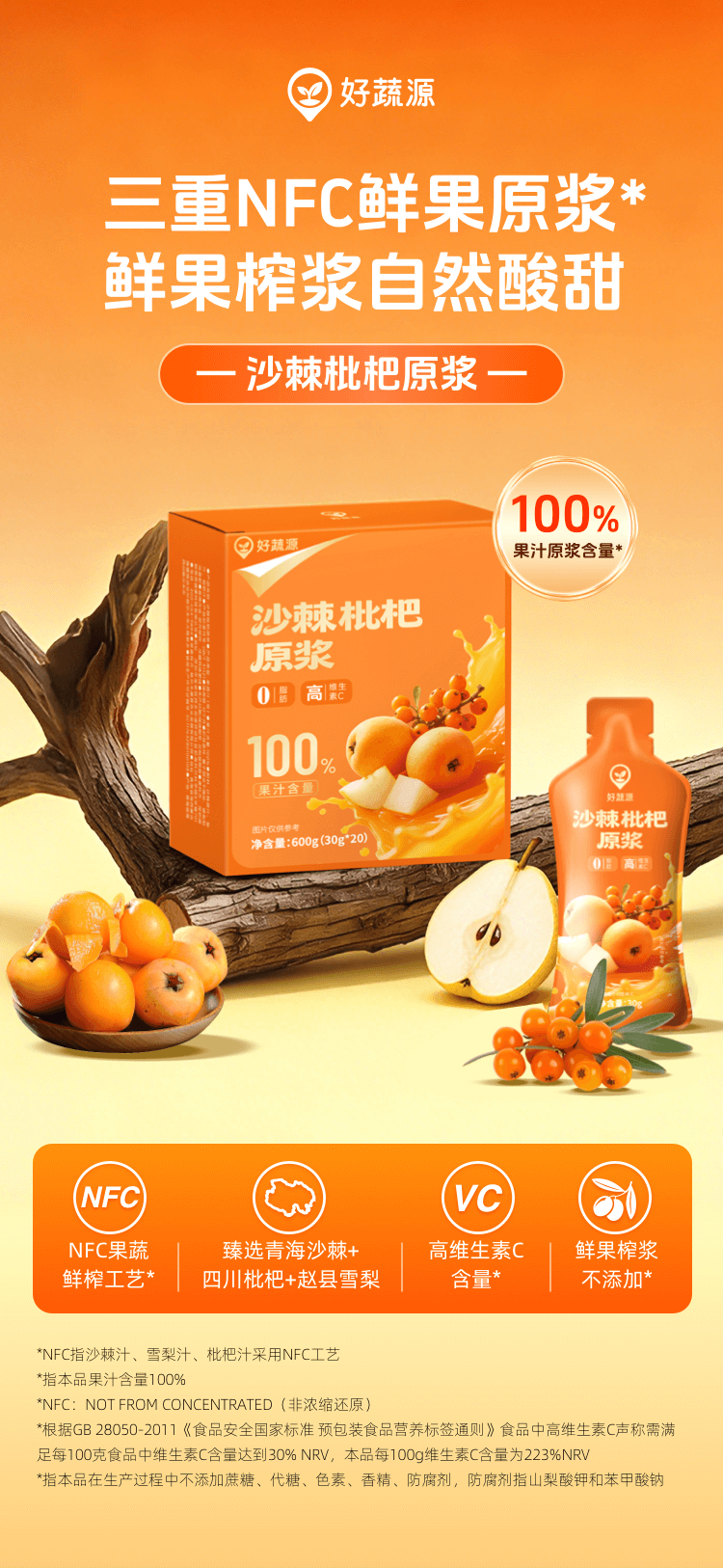 【三重NFC】好蔬源 沙棘枇杷原浆 30g*20袋/盒 鲜果榨浆自然酸甜