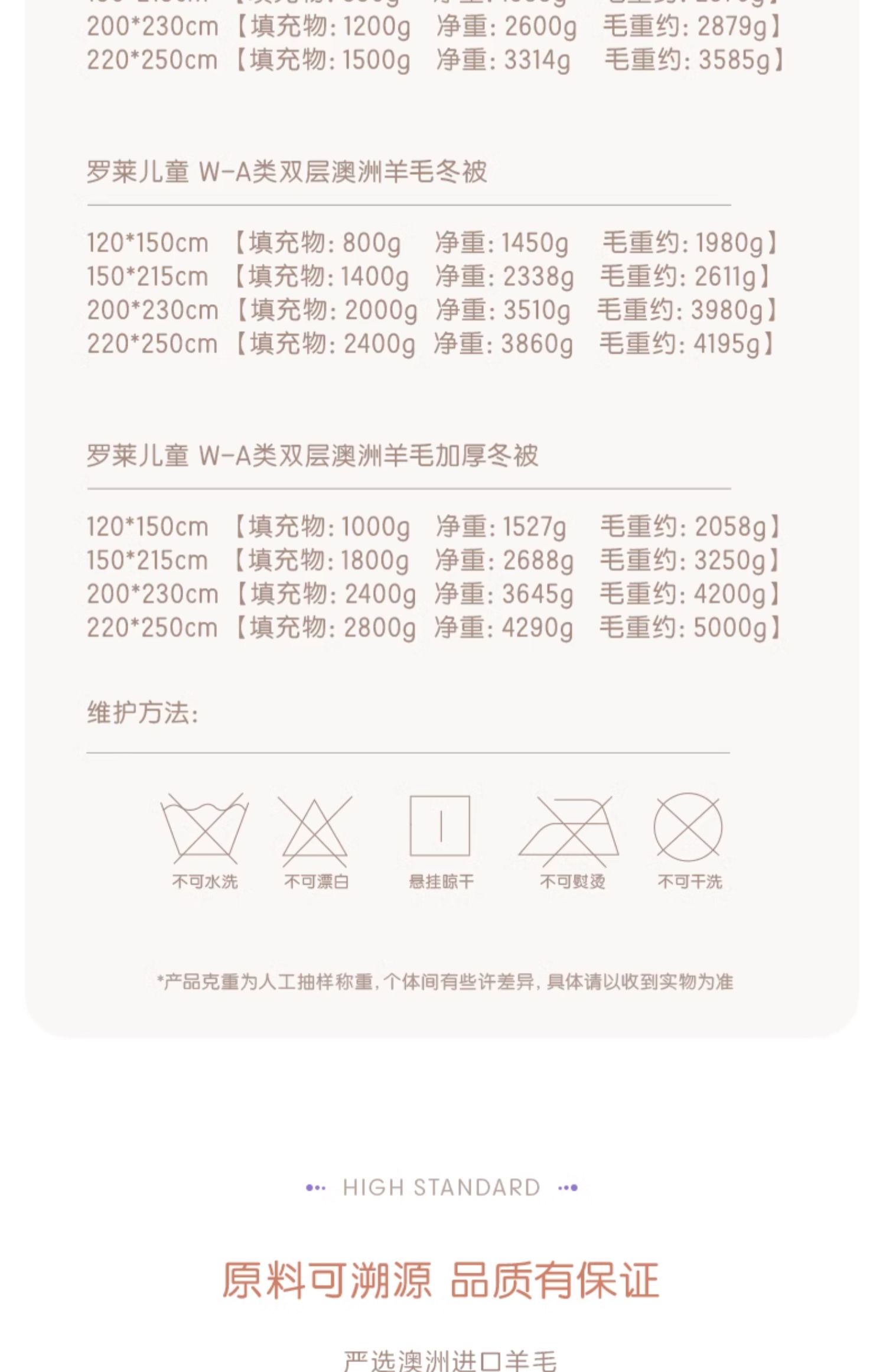 罗莱儿童XS W-A类双层澳洲羊毛冬被 150×215cm