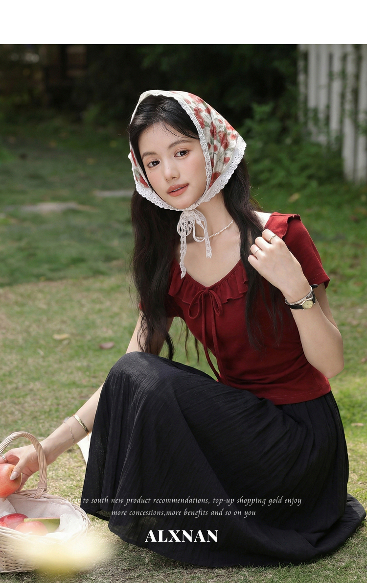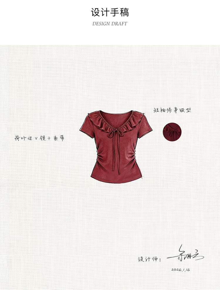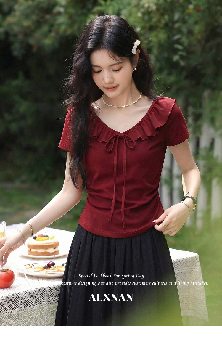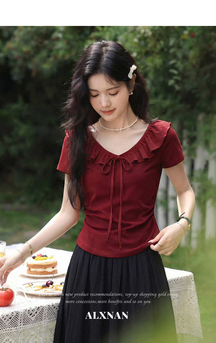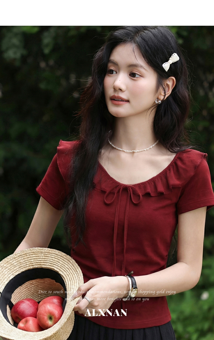 鹿向南「樱桃信笺」酒红色短袖T恤春季新款时尚设计感百搭上衣女