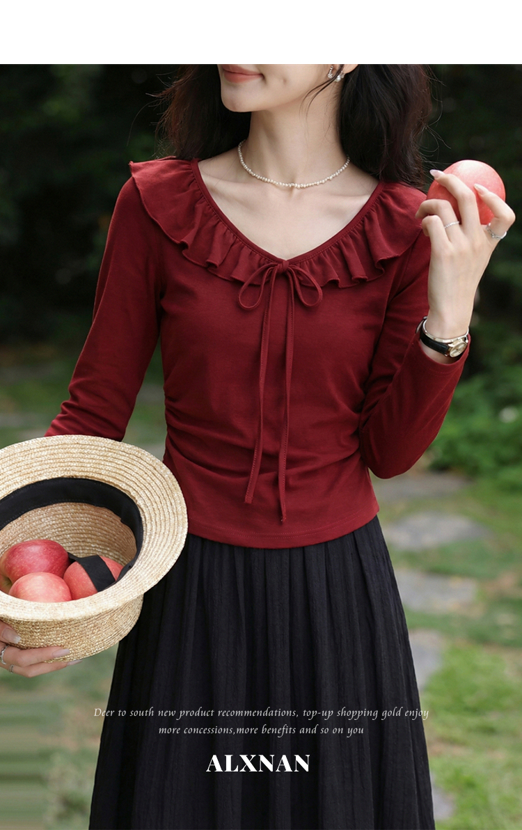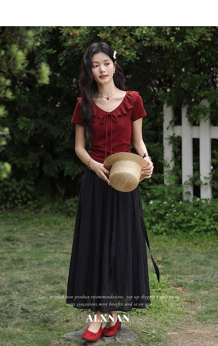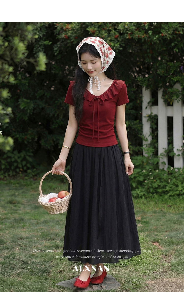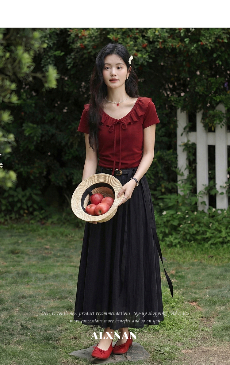 鹿向南「樱桃信笺」酒红色短袖T恤春季新款时尚设计感百搭上衣女