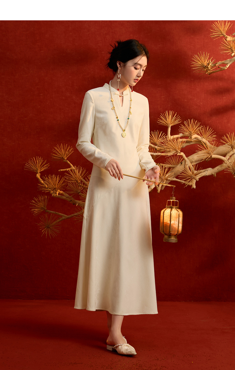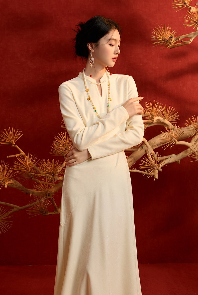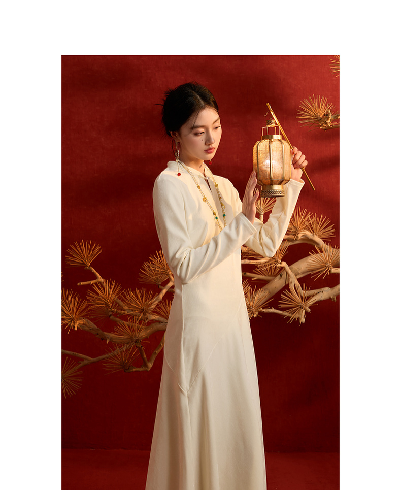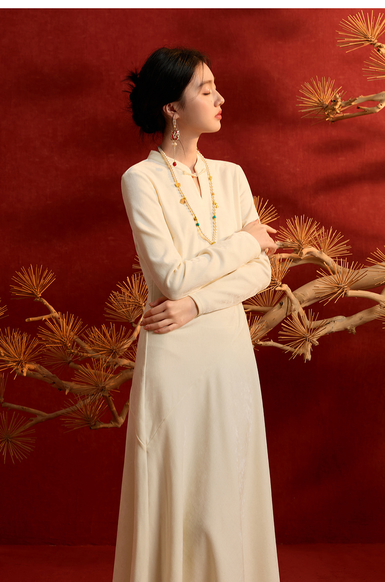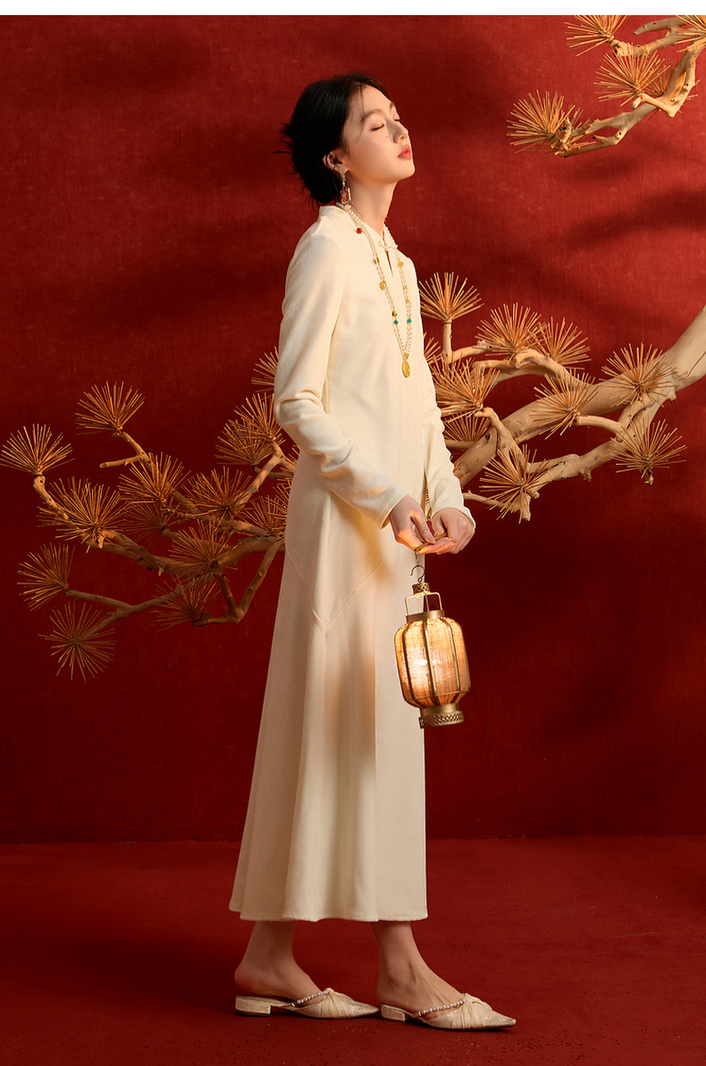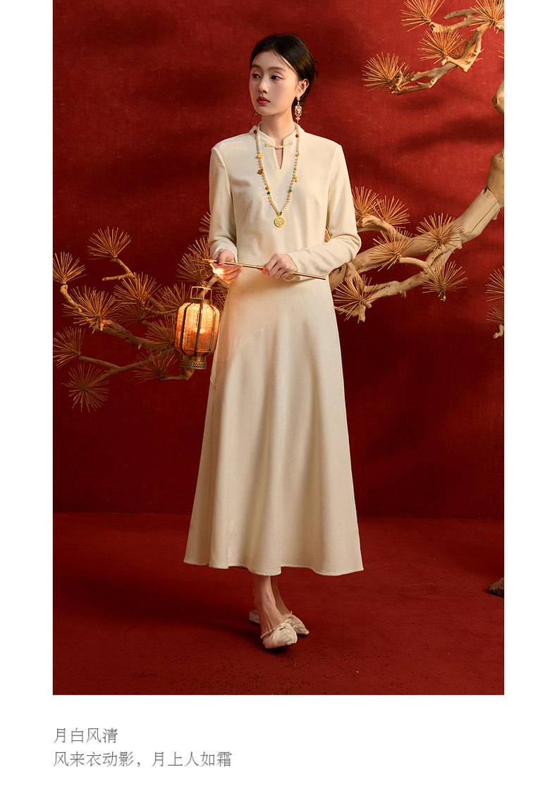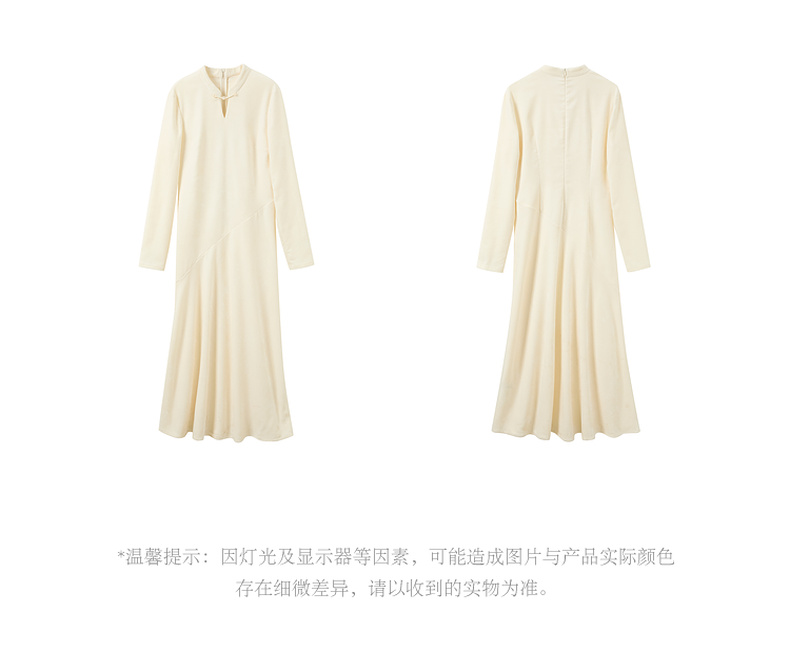 三彩【月白风清】2026春季新款雪尼尔立领连衣裙收腰A字鱼尾裙C