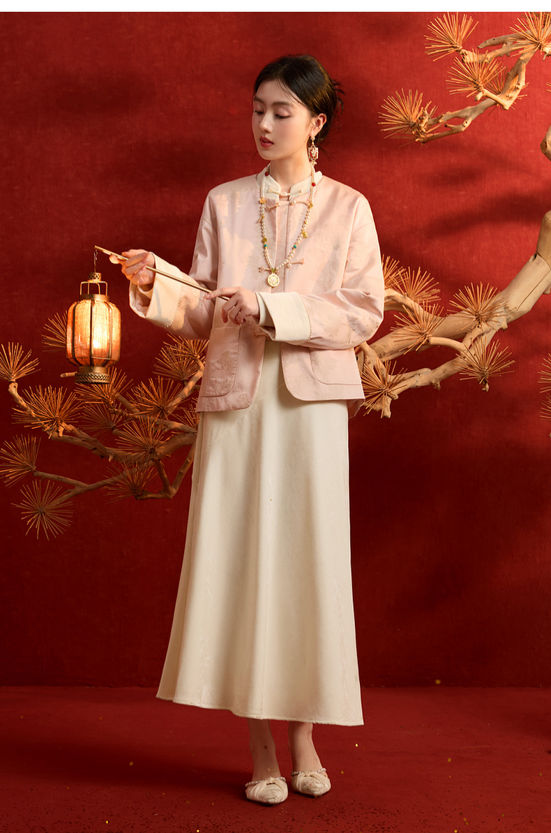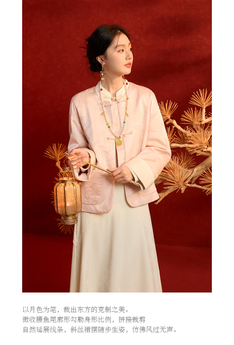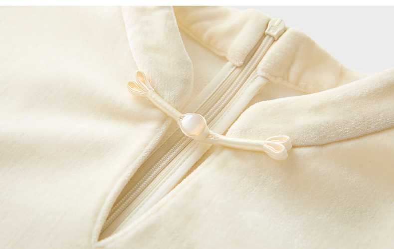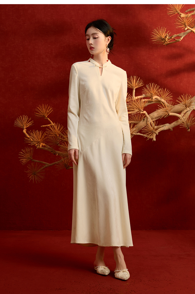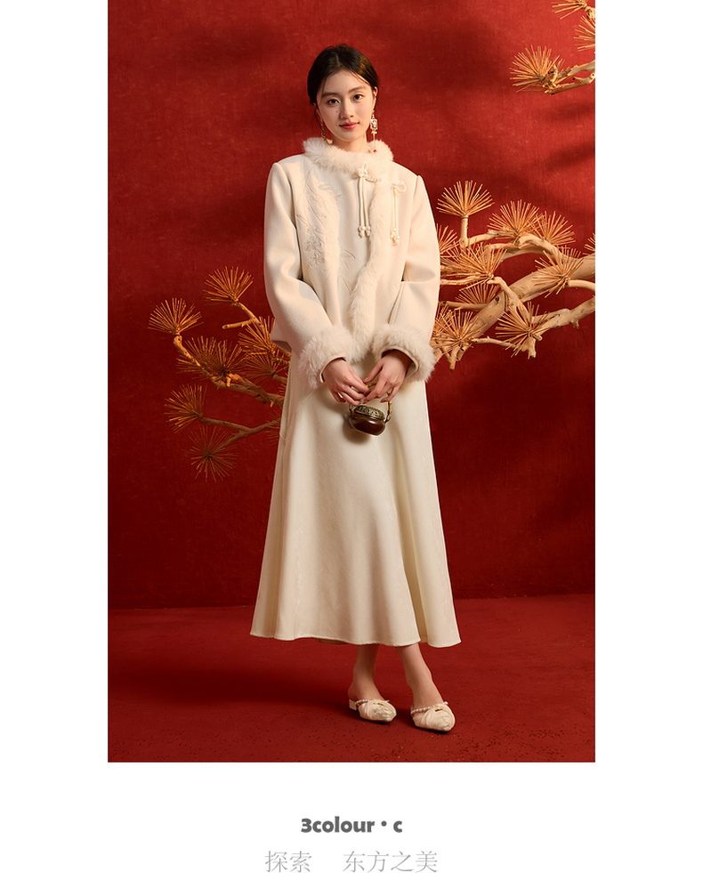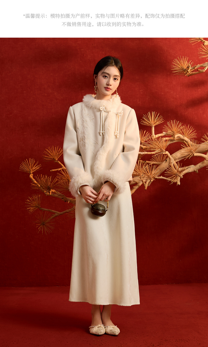 三彩【月白风清】2026春季新款雪尼尔立领连衣裙收腰A字鱼尾裙C