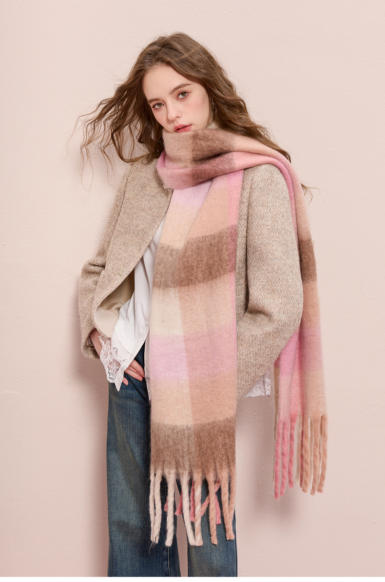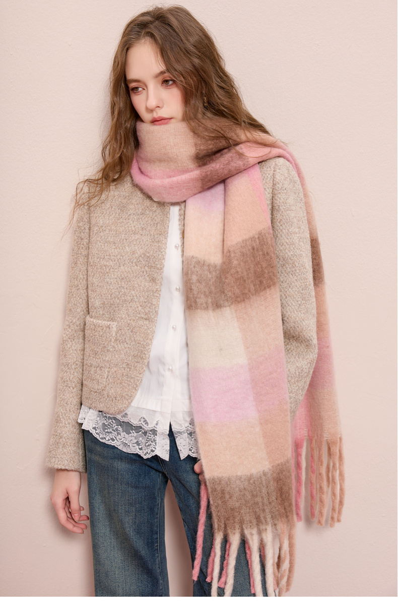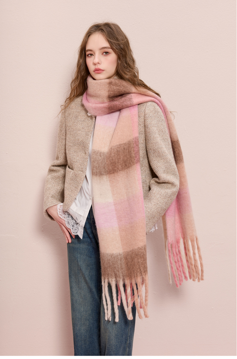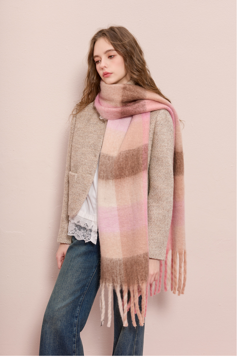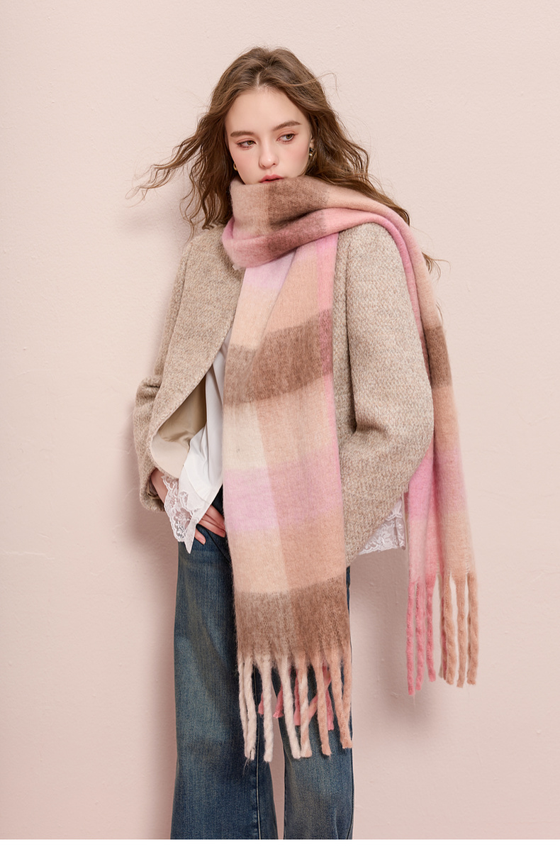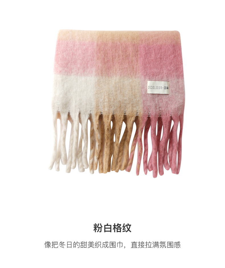 【臻暖围巾】三彩2025新款温柔系粉白浅格纹流苏拉毛保暖松弛女
