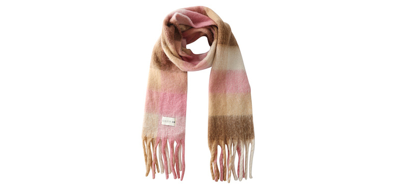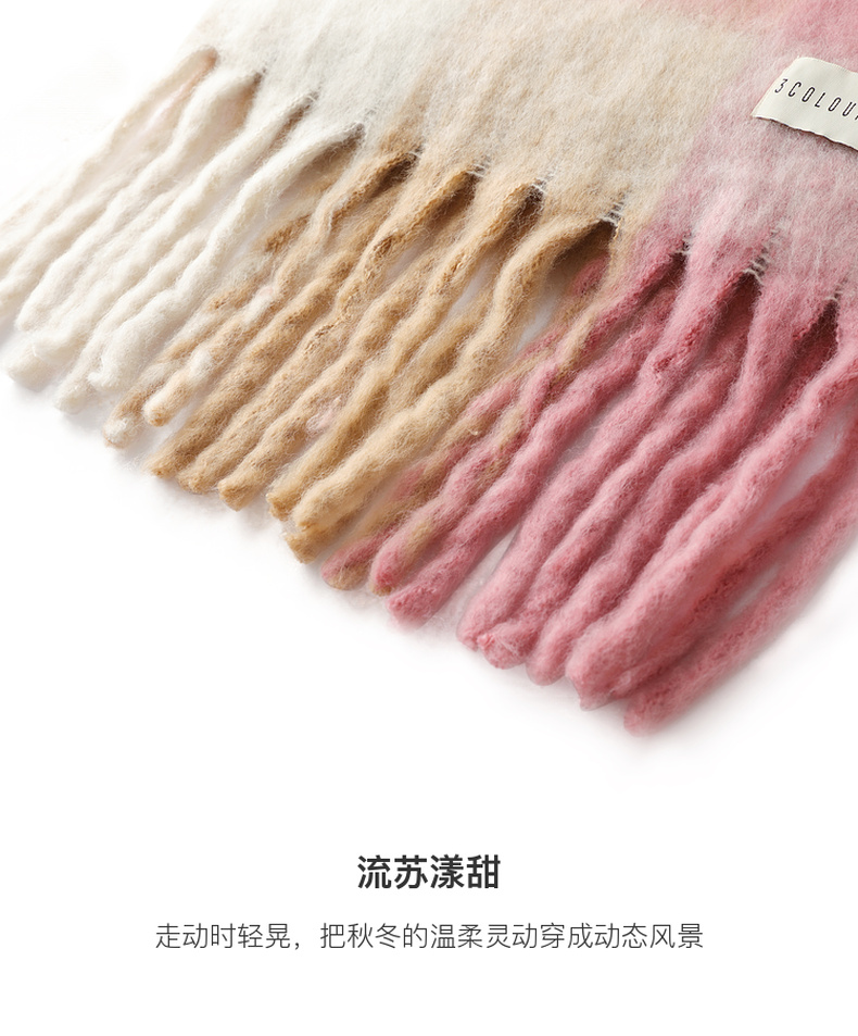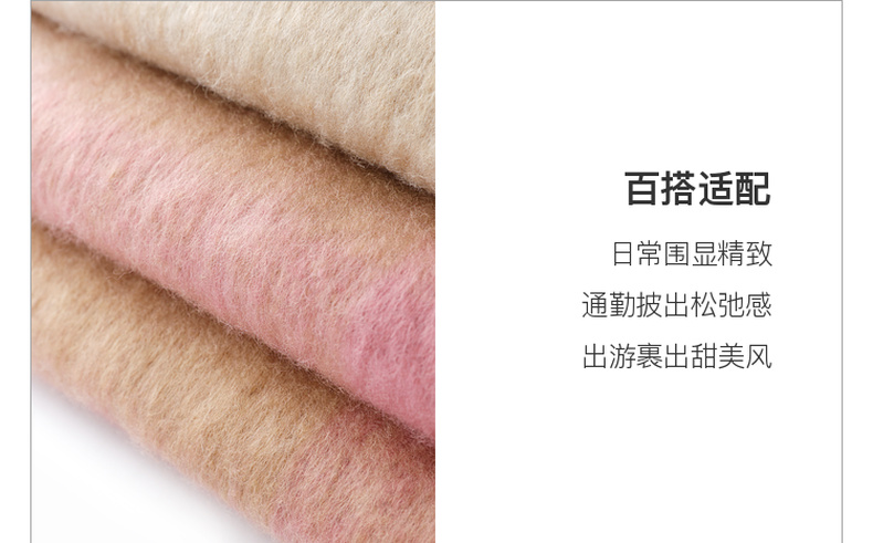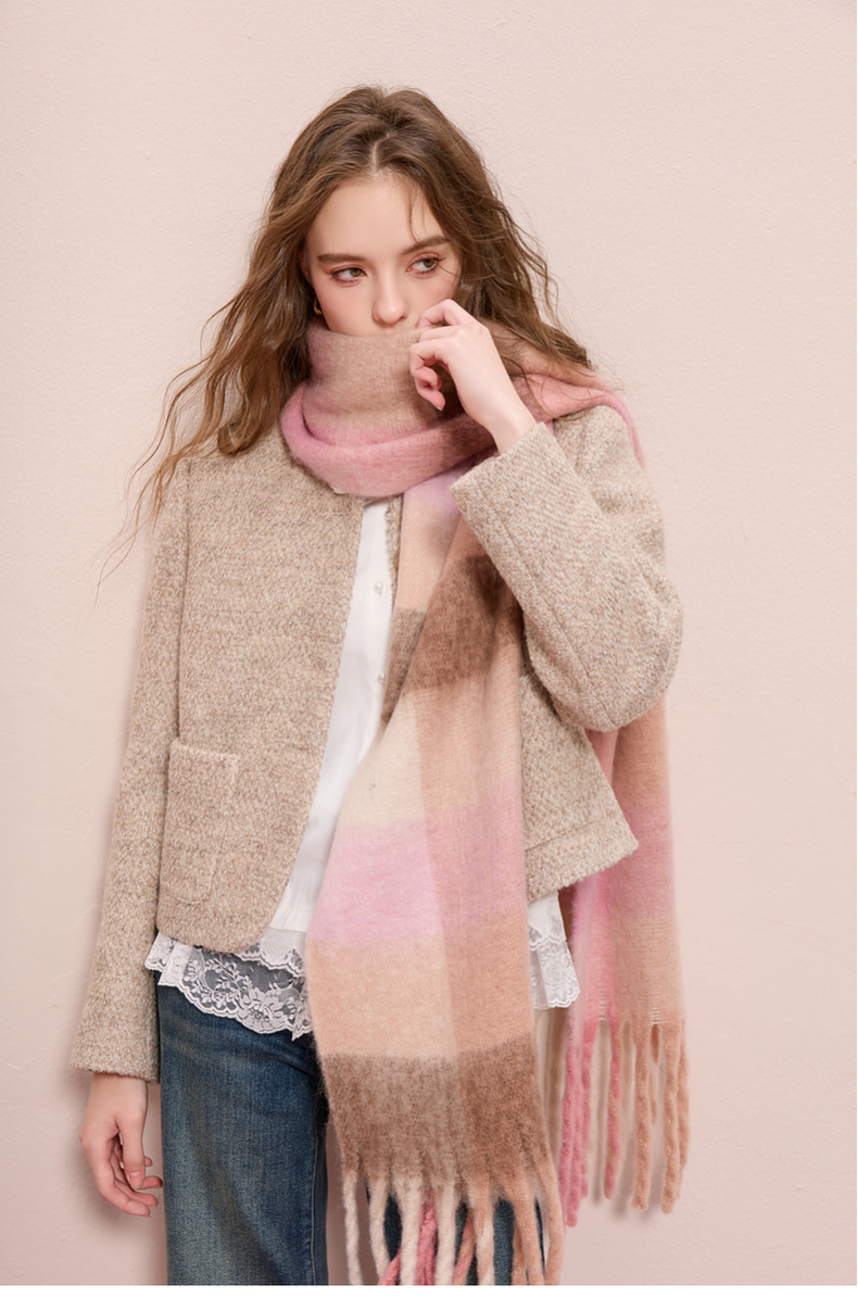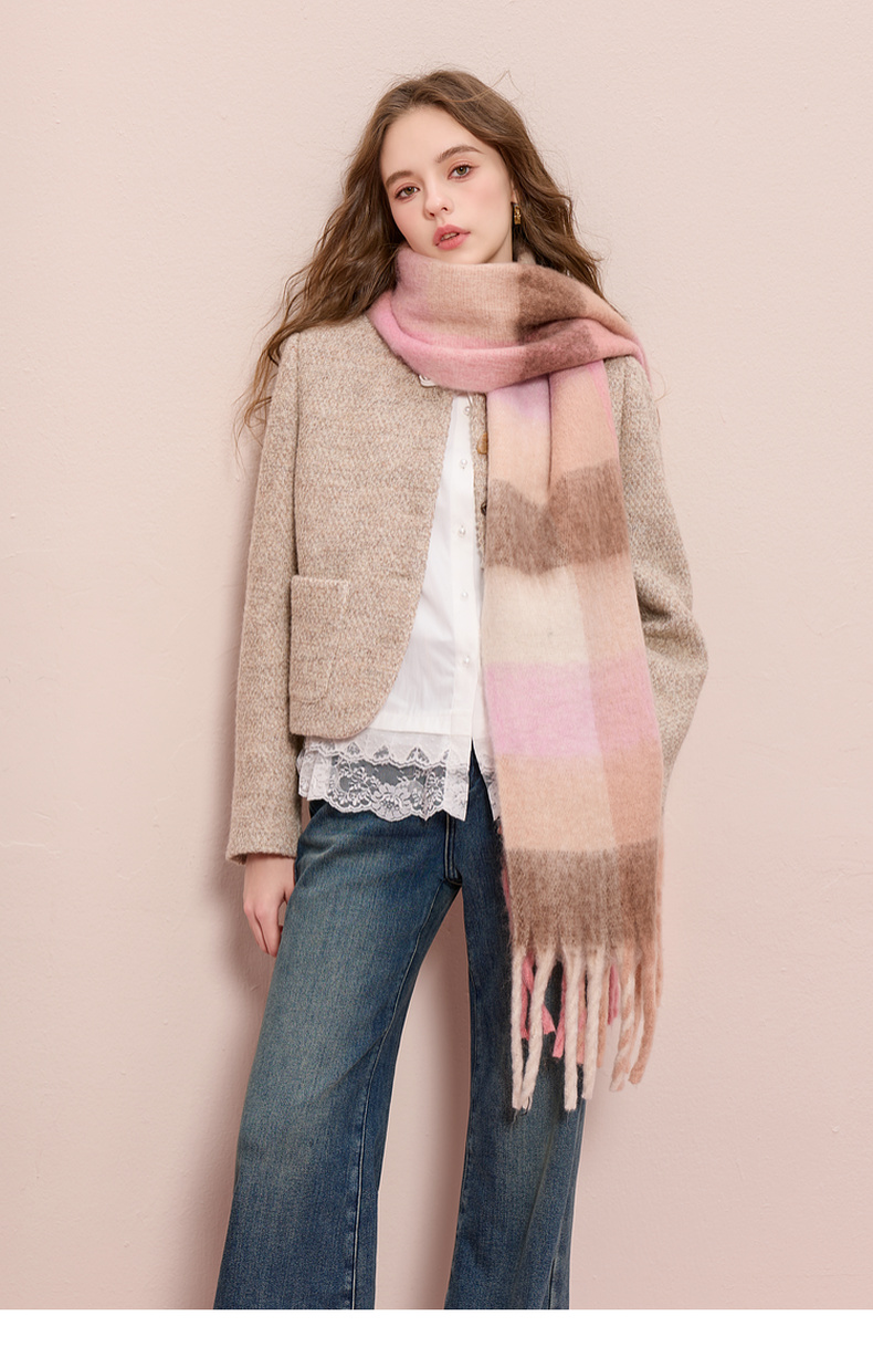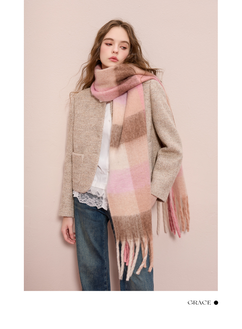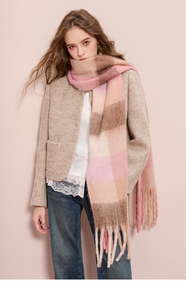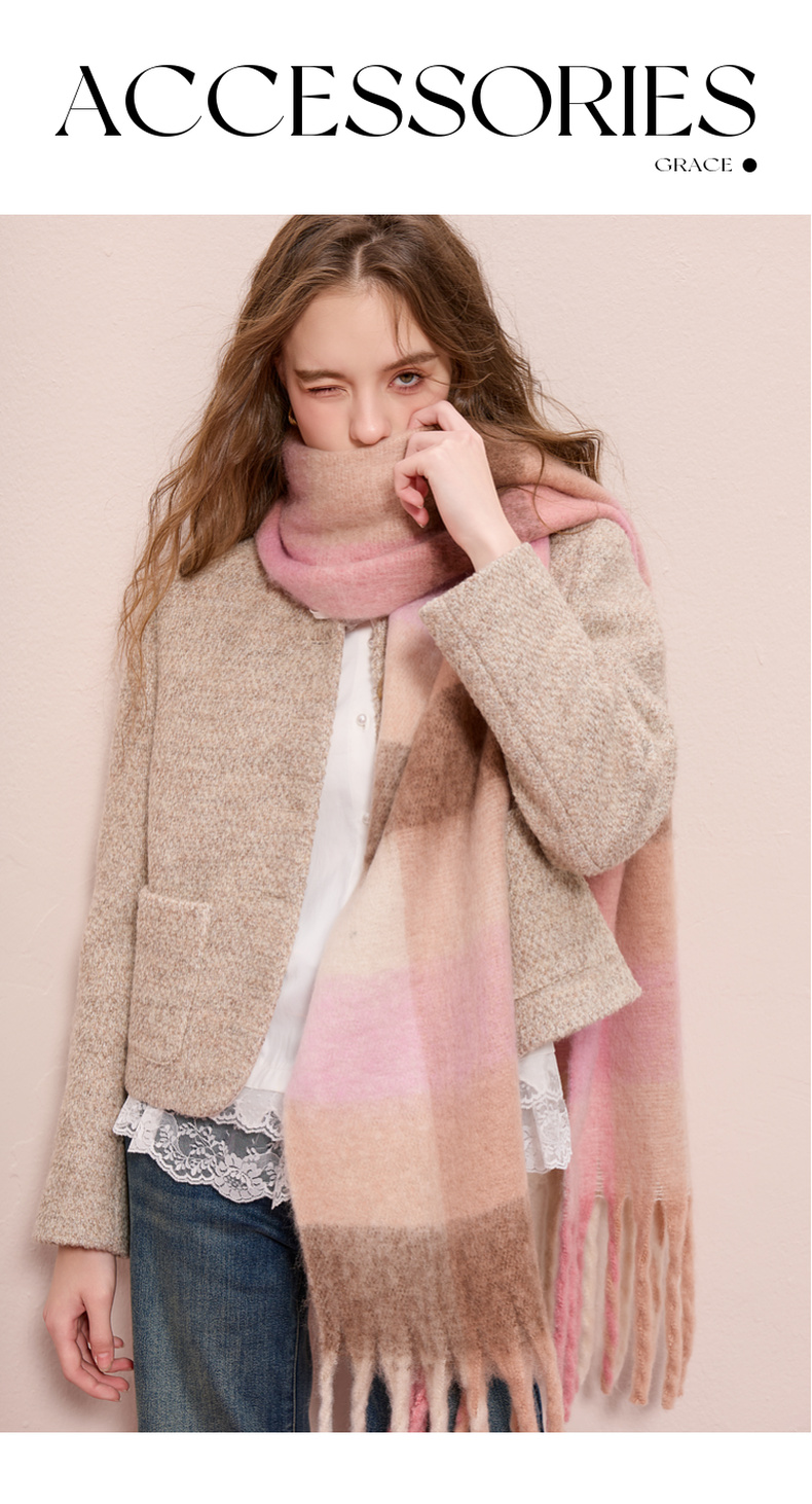 【臻暖围巾】三彩2025新款温柔系粉白浅格纹流苏拉毛保暖松弛女