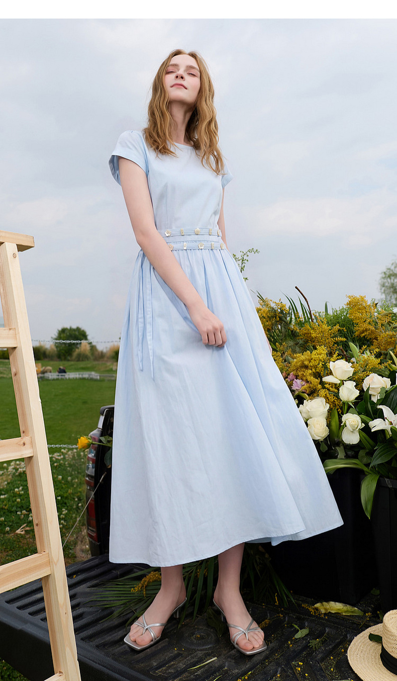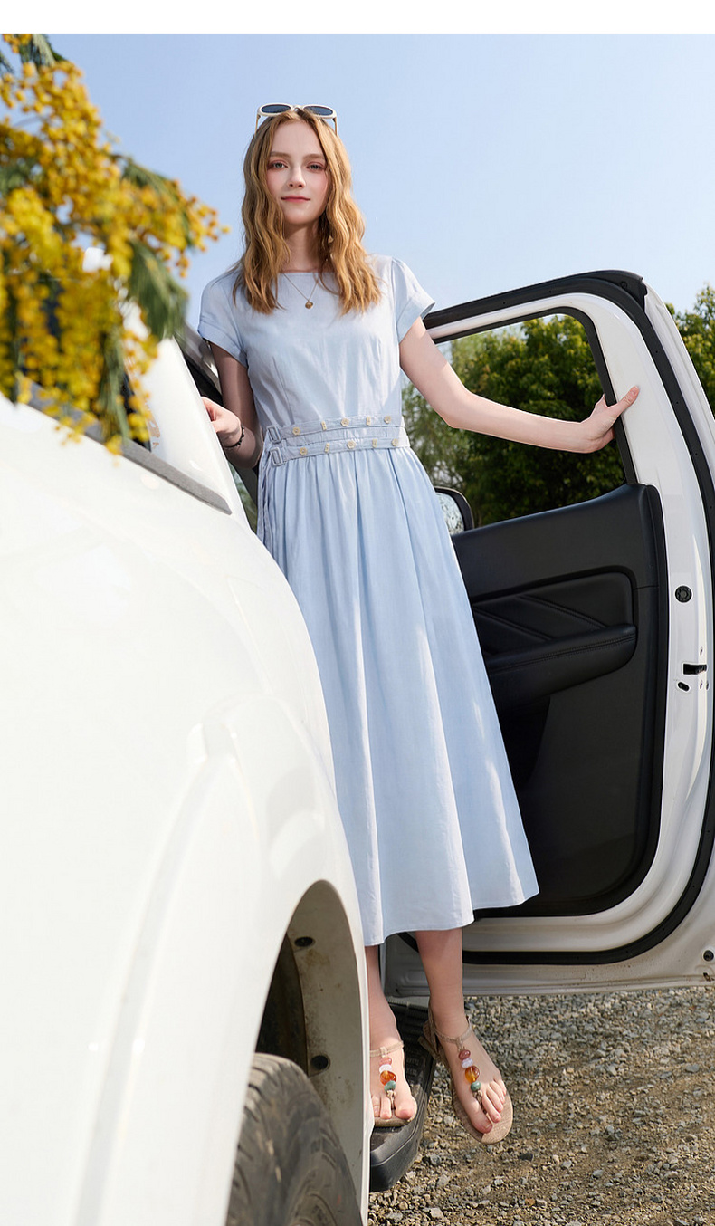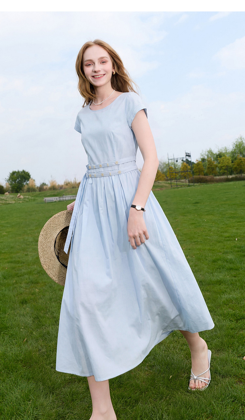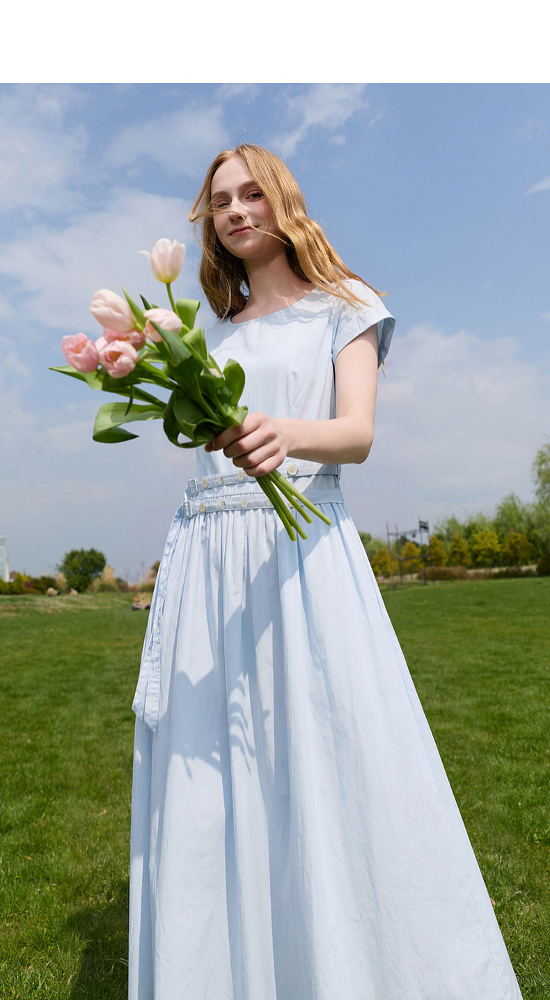 三彩2026夏季新款纯色连衣裙圆领收腰A字裙长裙简约M