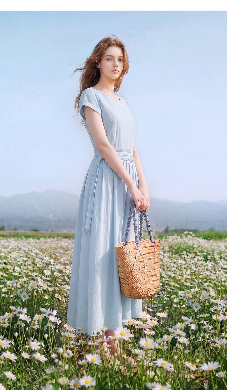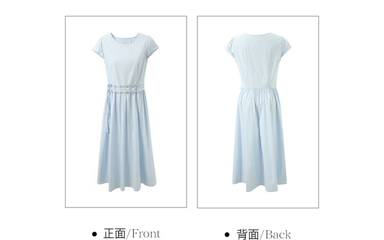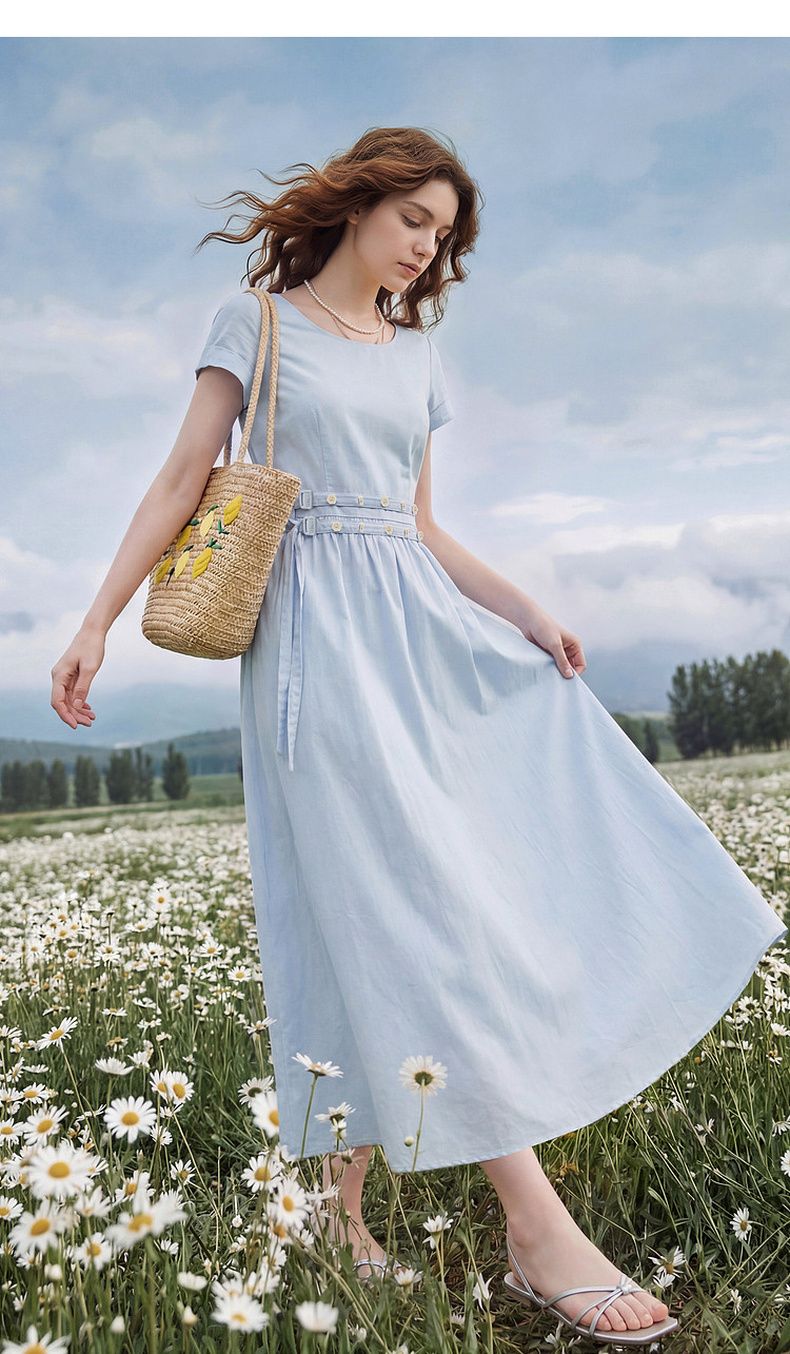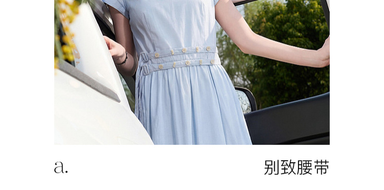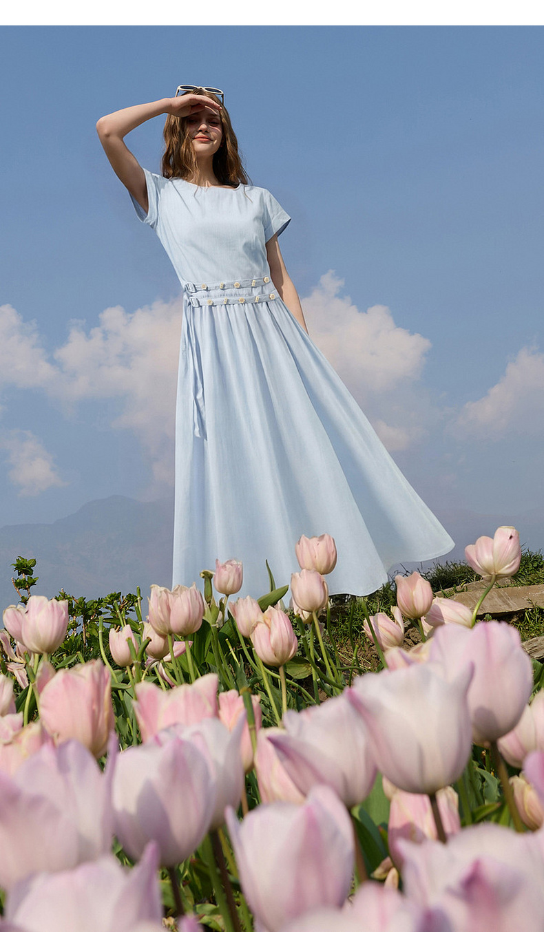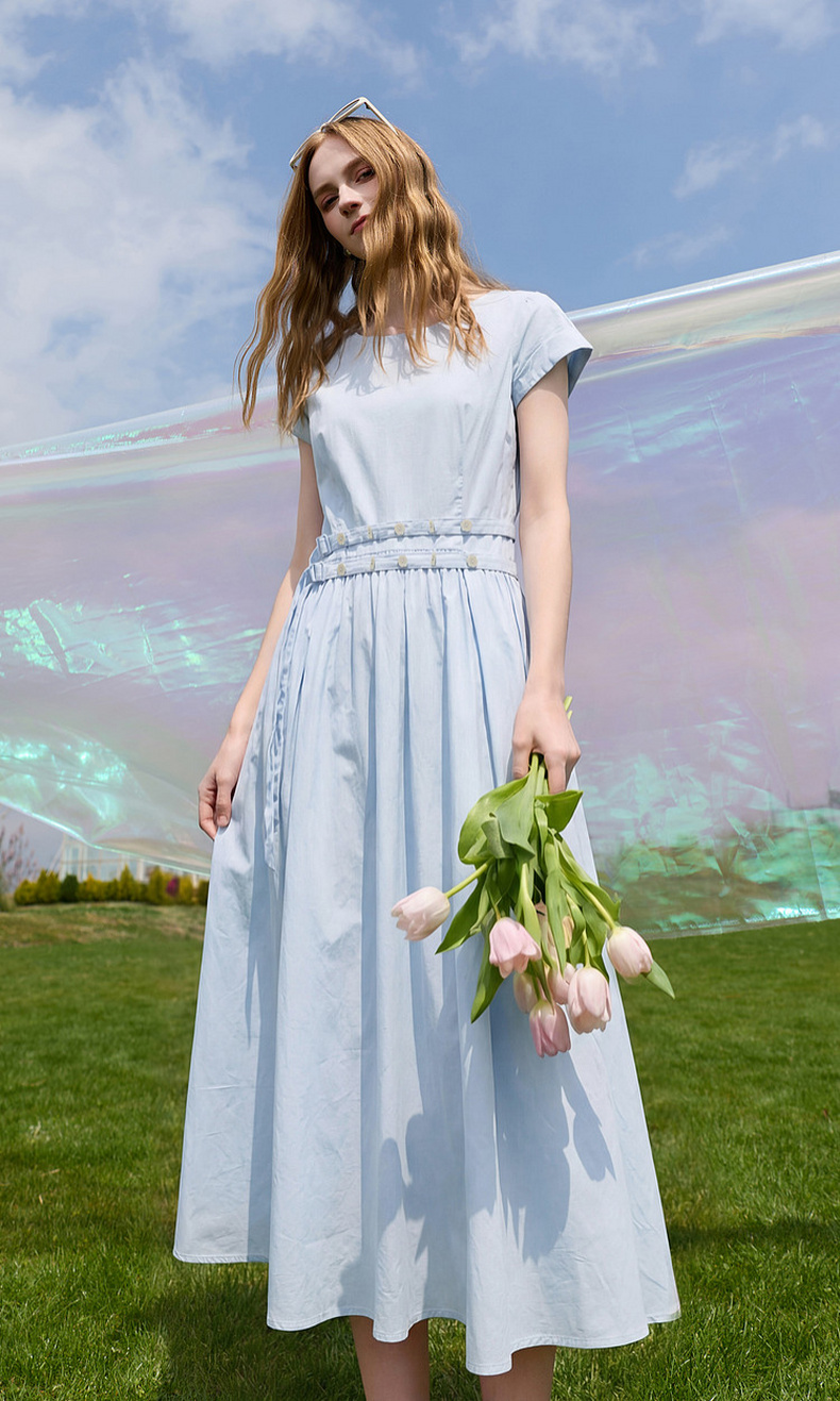 三彩2026夏季新款纯色连衣裙圆领收腰A字裙长裙简约M