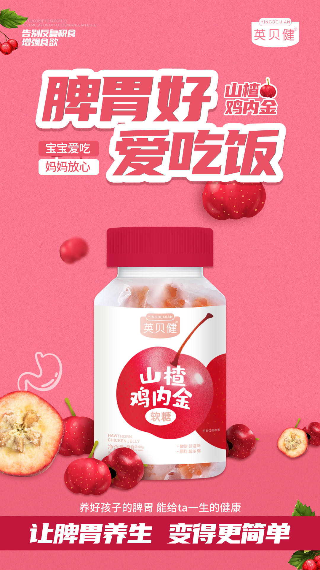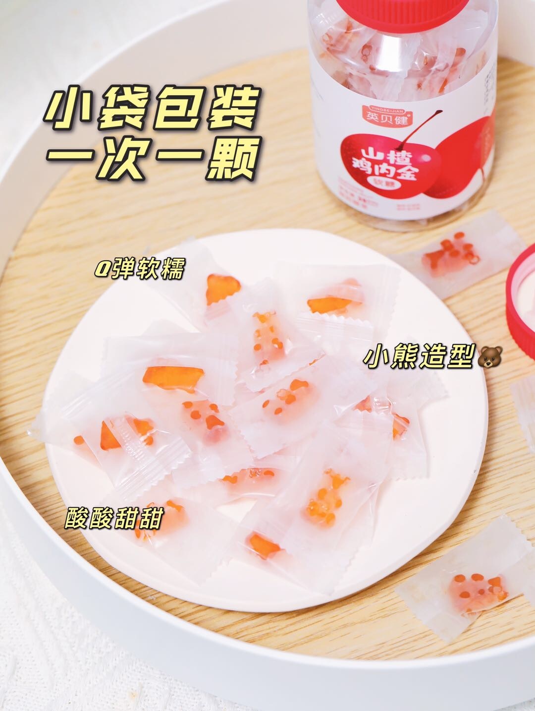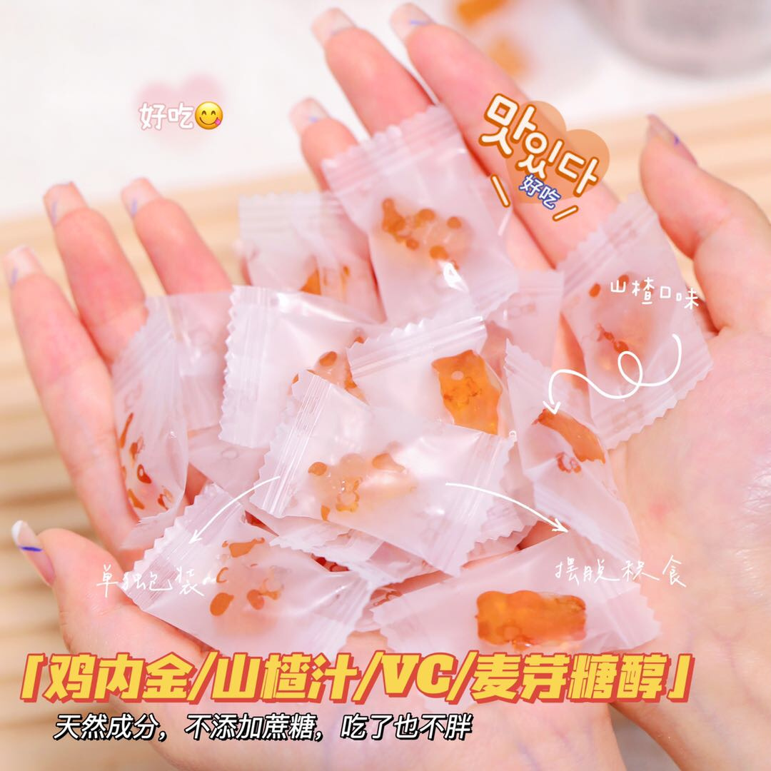【品名】山楂鸡内金软糖 【品牌】英贝健 【规格】60g(2g*30粒)/盒*4 【保质期】18个月 【贮藏方法】密封,置阴凉、通风、干燥处 2. 儿童需在成人监护下食用 3. 本品储存温度大于40°c时可能致个别糖体变形或部分溶解,属正常情况,不影响食用