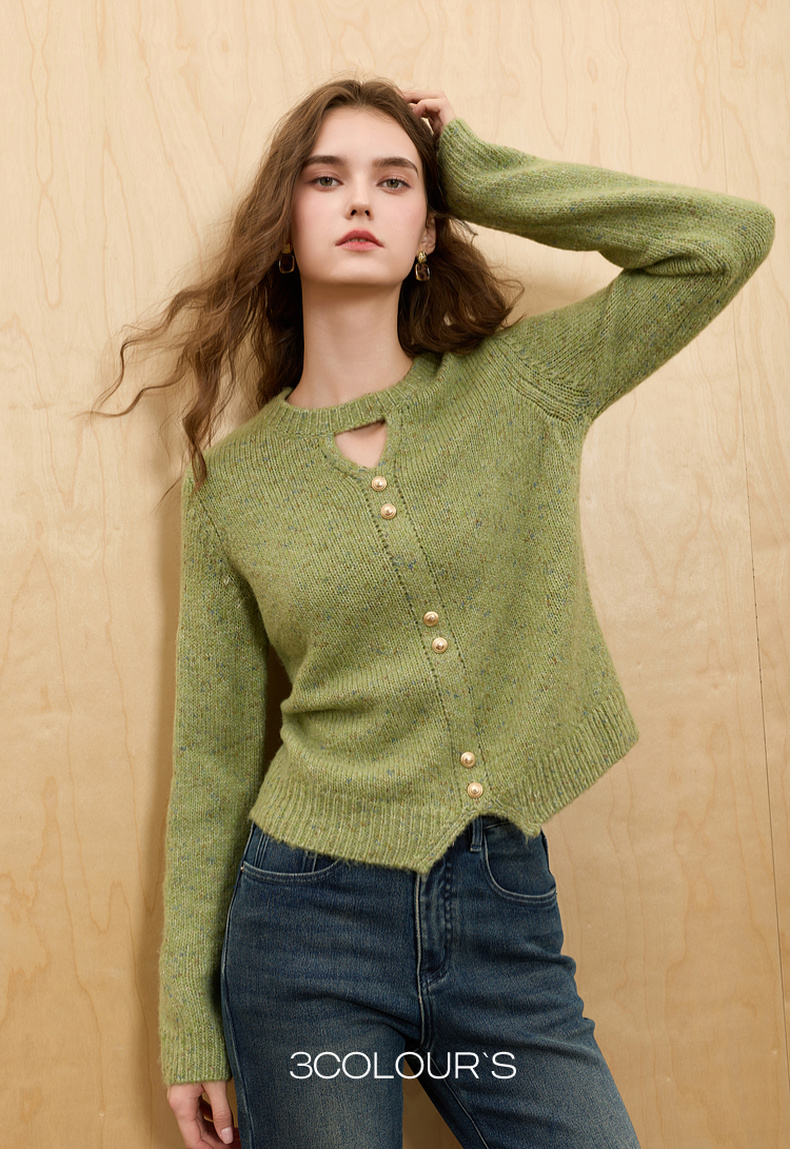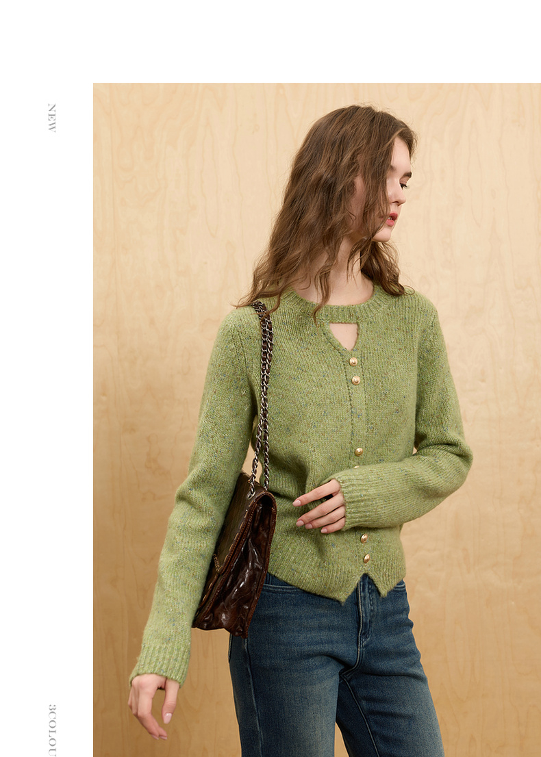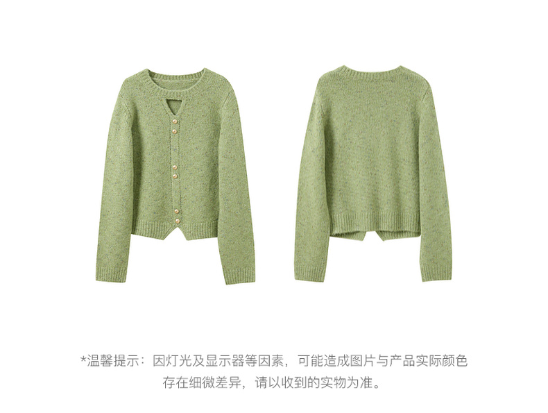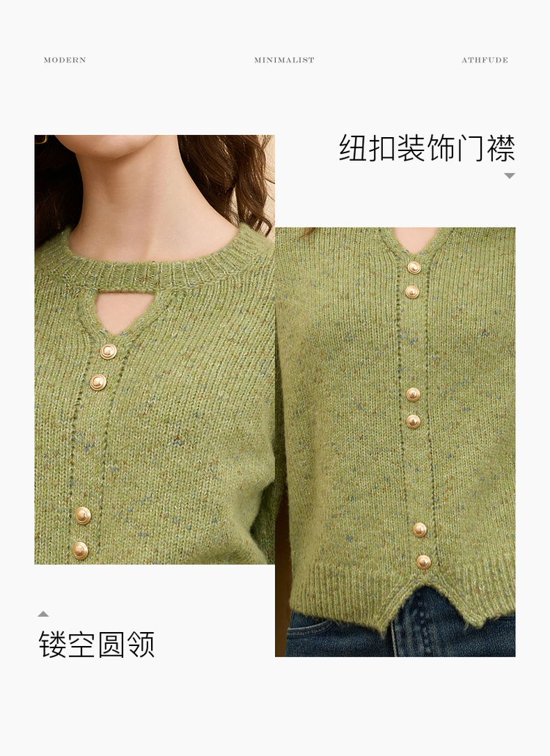 三彩2025冬季新款镂空圆领针织衫长袖套头上衣慵懒休闲简约气质S