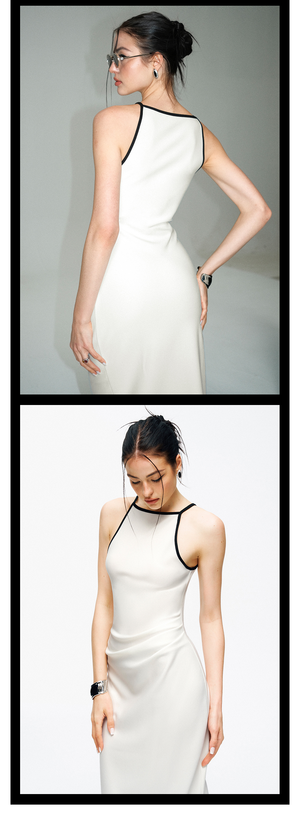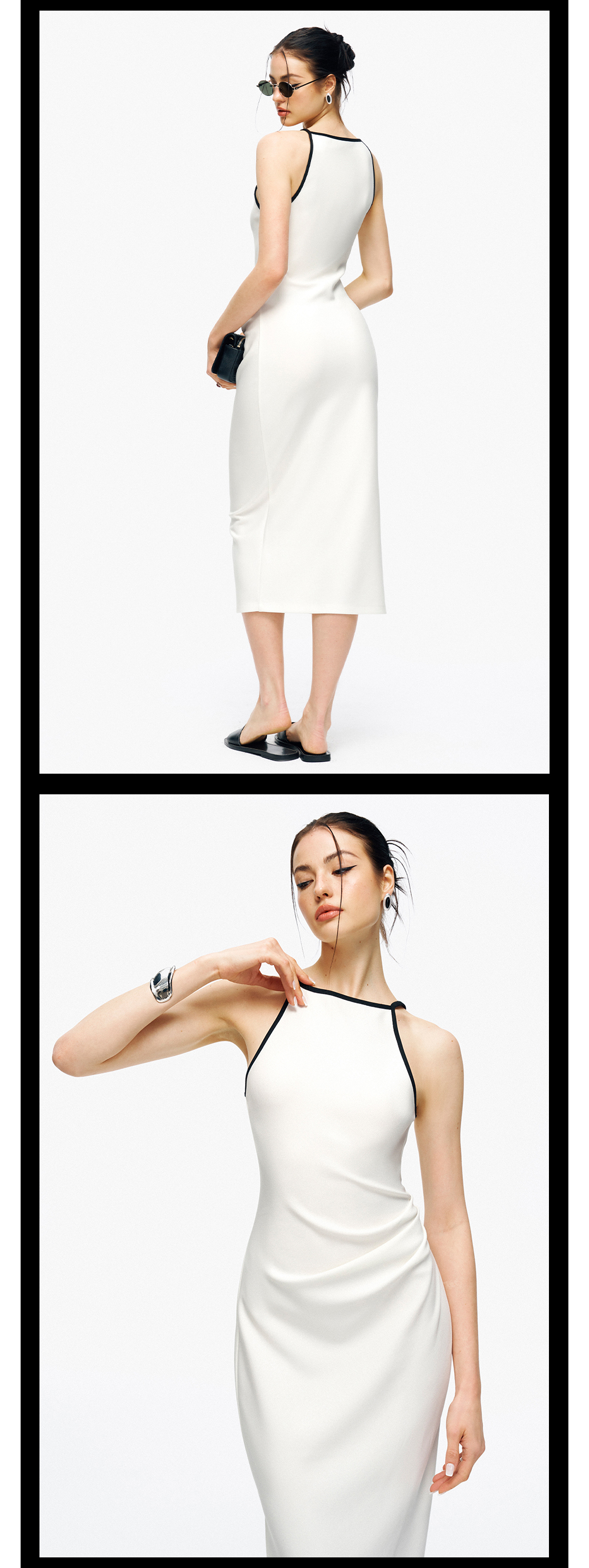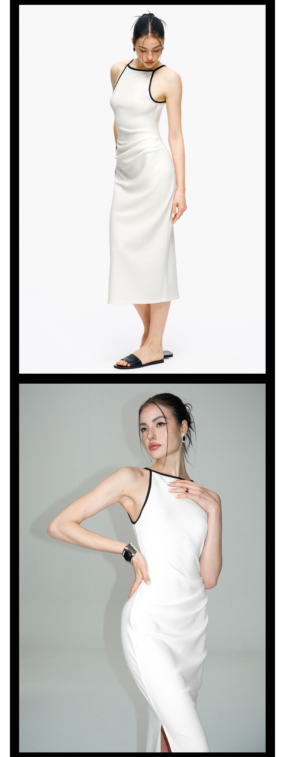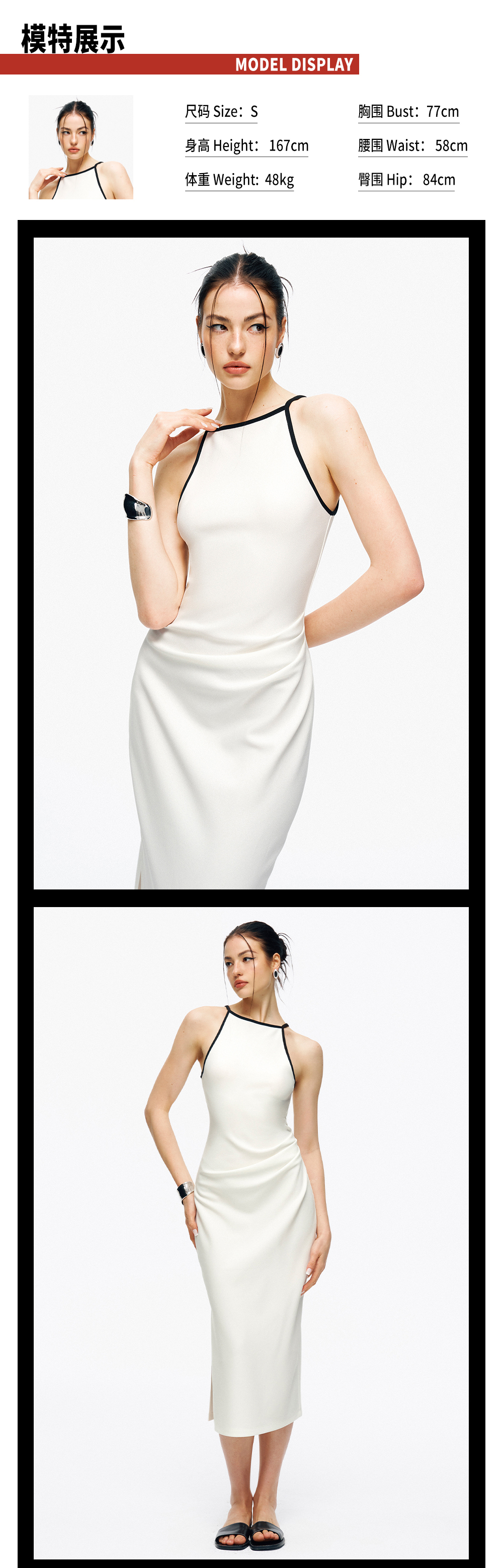 TR她热 情定罗马 黑白撞色拼接修身复古显瘦收腰抽褶开叉连衣裙