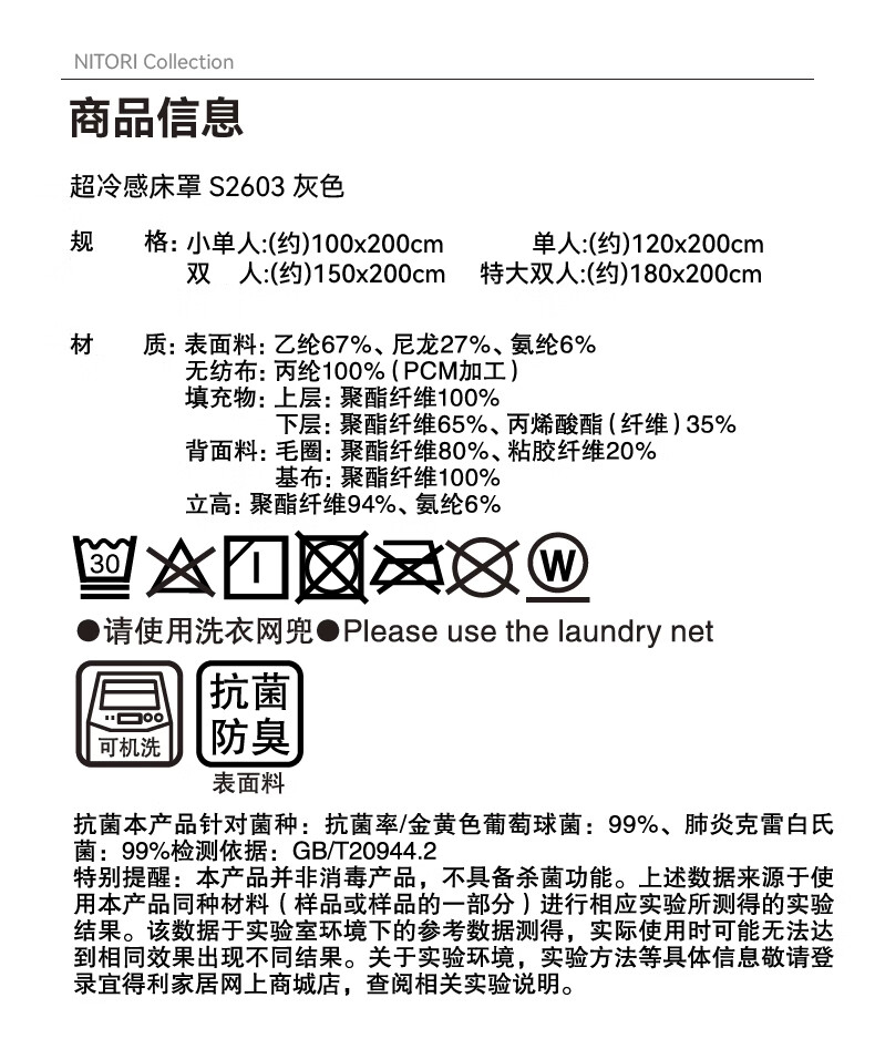 NITORI宜得利家居 夏天超凉感软垫抗菌防臭床罩超冷感床罩保护罩 S2603