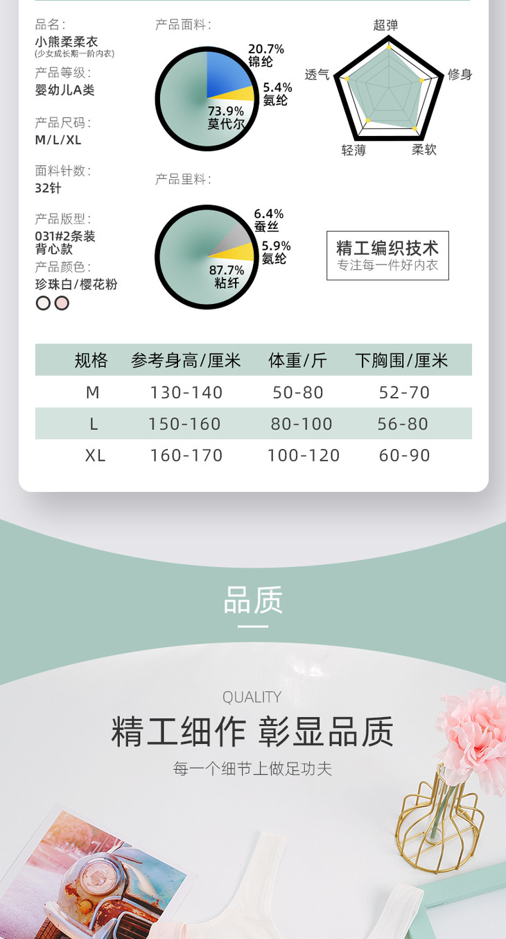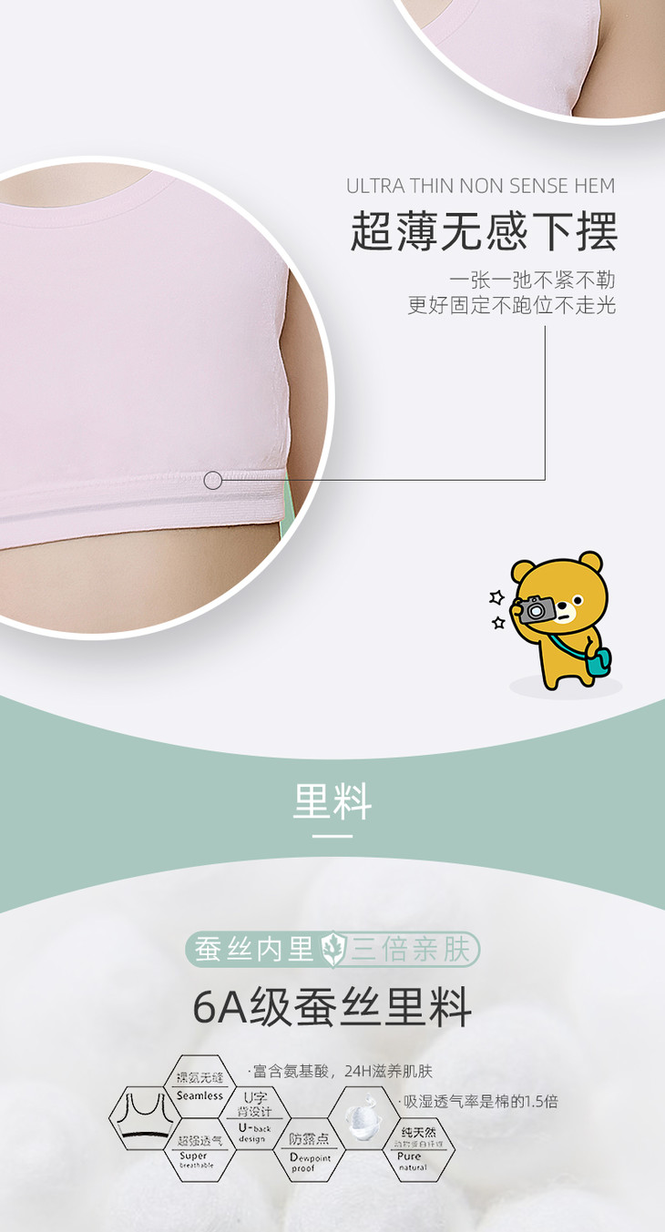 采用柔软双层丝棉,轻薄透气;按照胸型设计八字棉,小小一片, 防凸点,不闷热;固定胸棉做法,不跑位,自信健康,拒绝小尴尬;裸氨无缝弹力非常大,能给发育更大 空间,更适合成长期少女