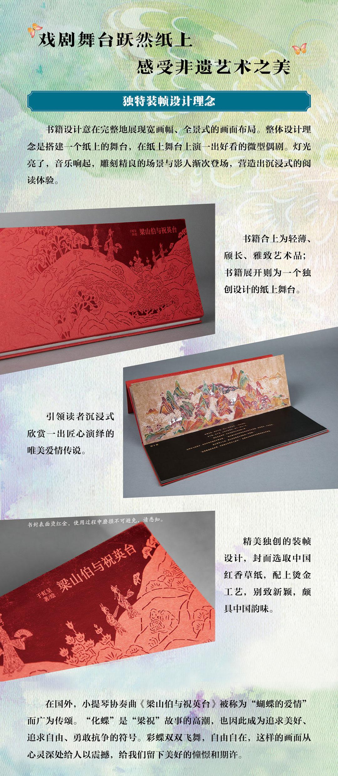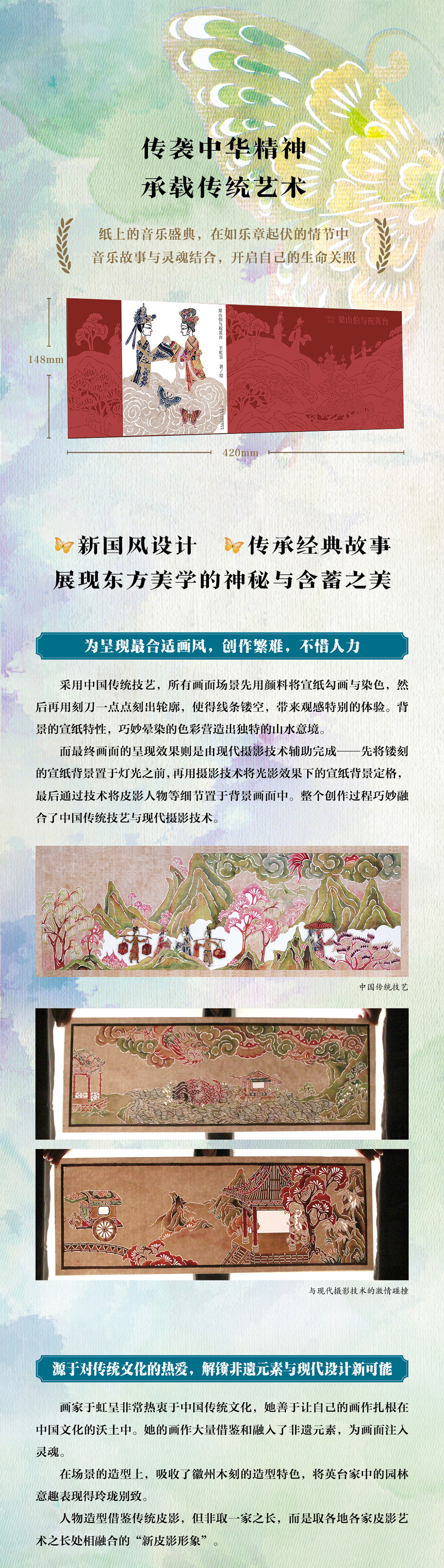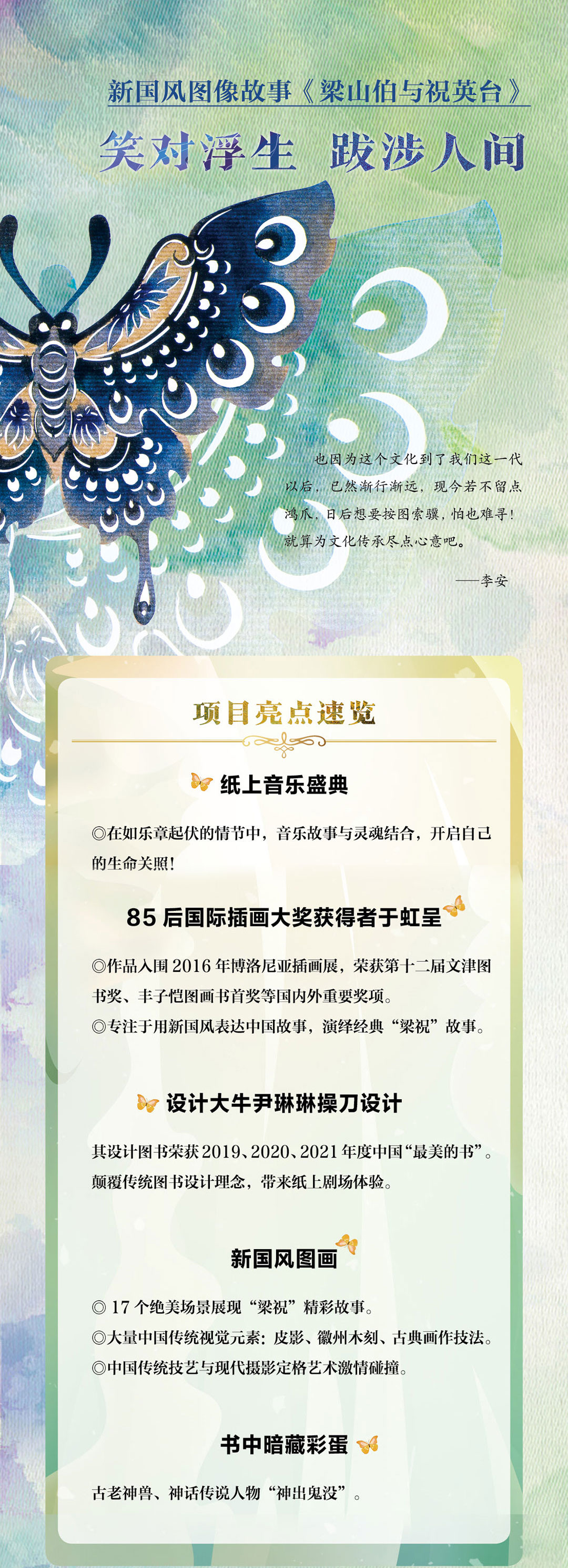 九神鹿绘本馆——梁山伯与祝英台 国际大奖获得者于虹呈新国风力作,作品融入大量中国传统技艺元素:皮影、徽州木刻、古典画作技法;画面元素暗藏彩蛋,古老神兽、神话传说,耳目一新;全景式展现东方非遗艺术之美。
