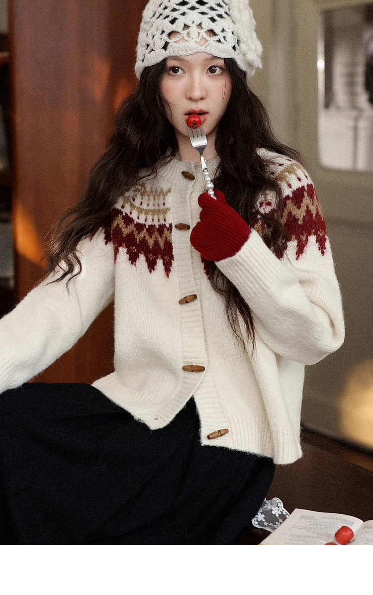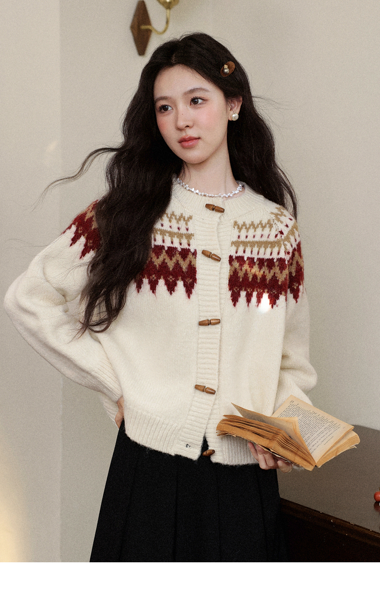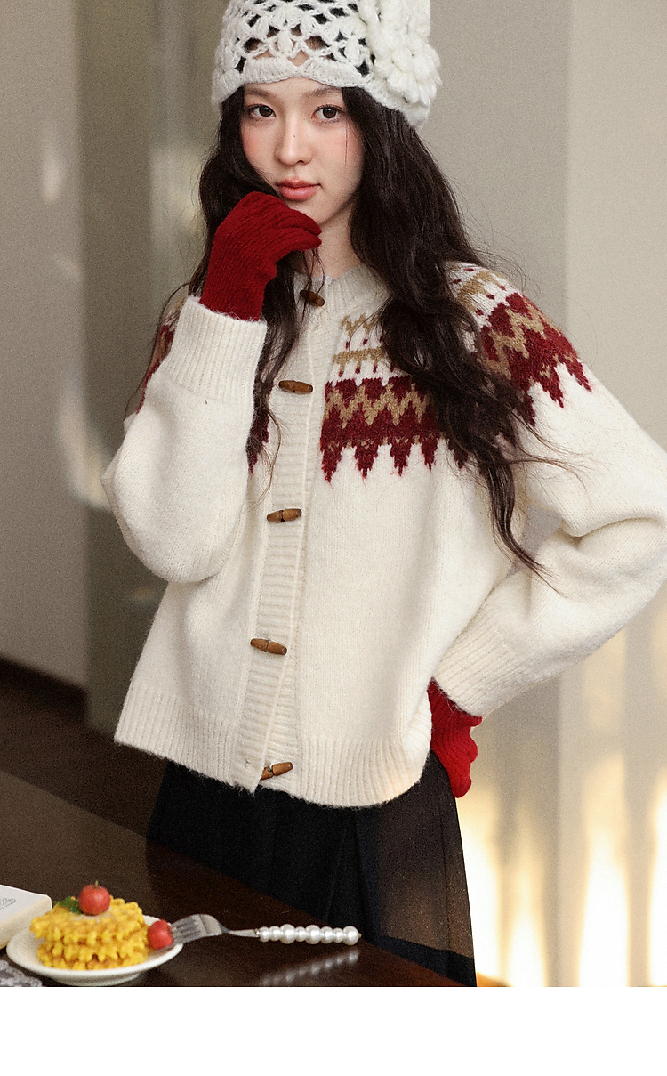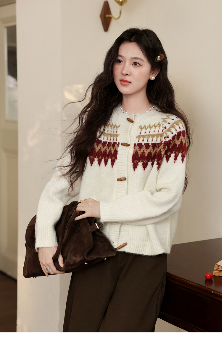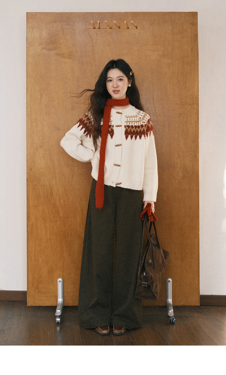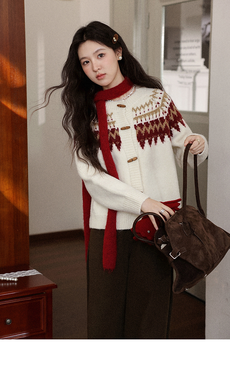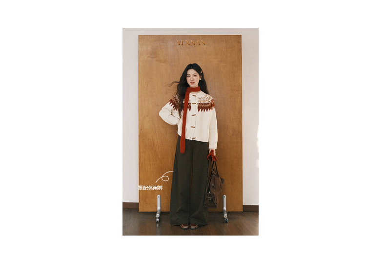鹿向南「费尔岛小镇」杏色长袖开衫毛衣秋冬季时尚宽松外搭上衣女