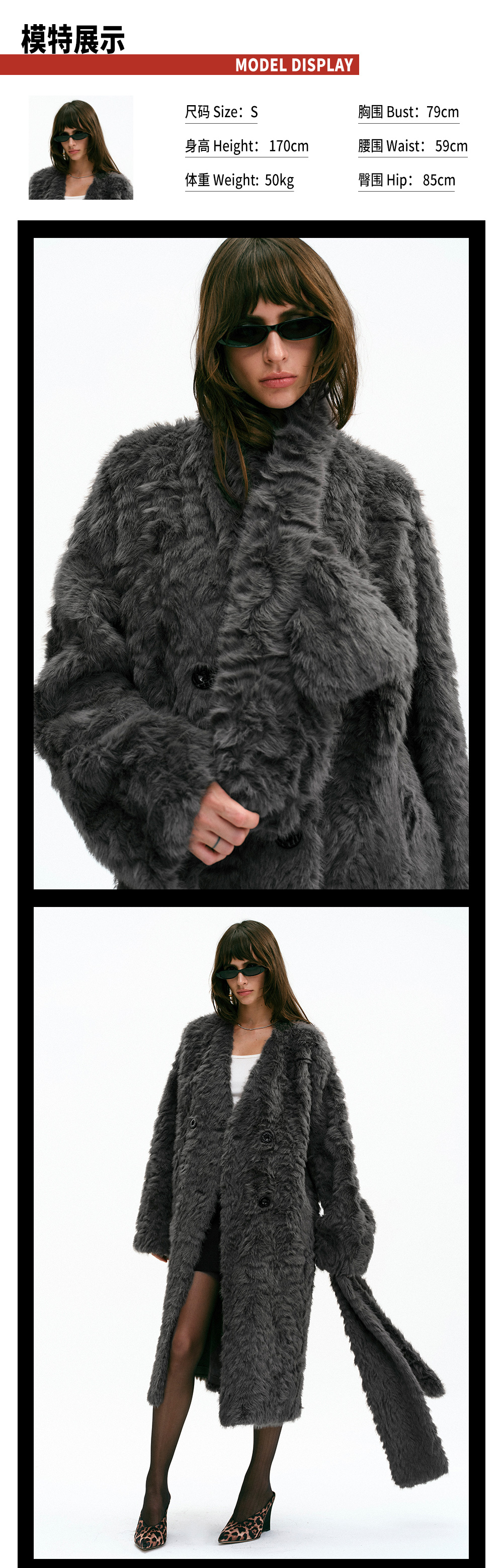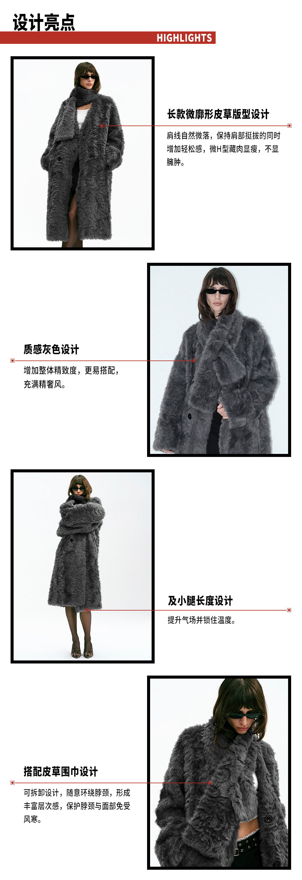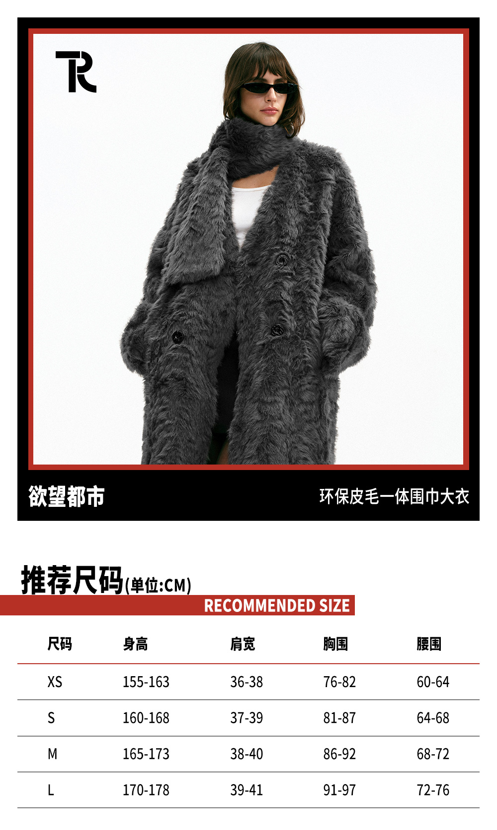 TR她热 欲望都市 灰色可拆卸围巾长款皮毛一体环保皮草大衣外套