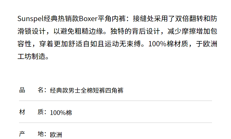 SUNSPEL男士经典款Boxer中高腰全棉四角内裤舒适透气柔软