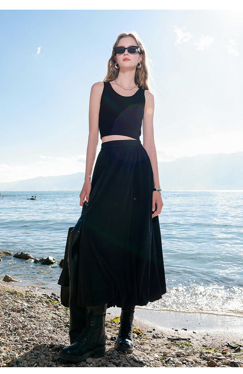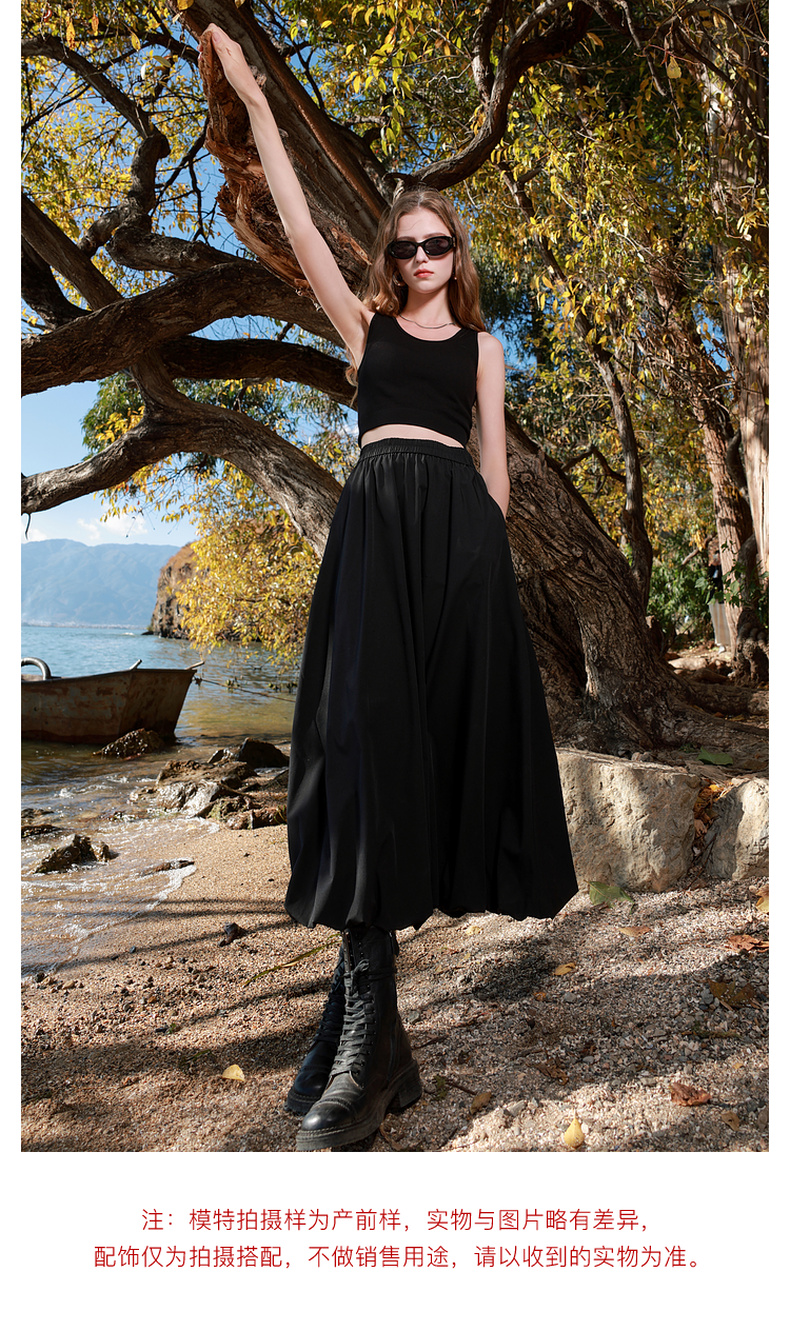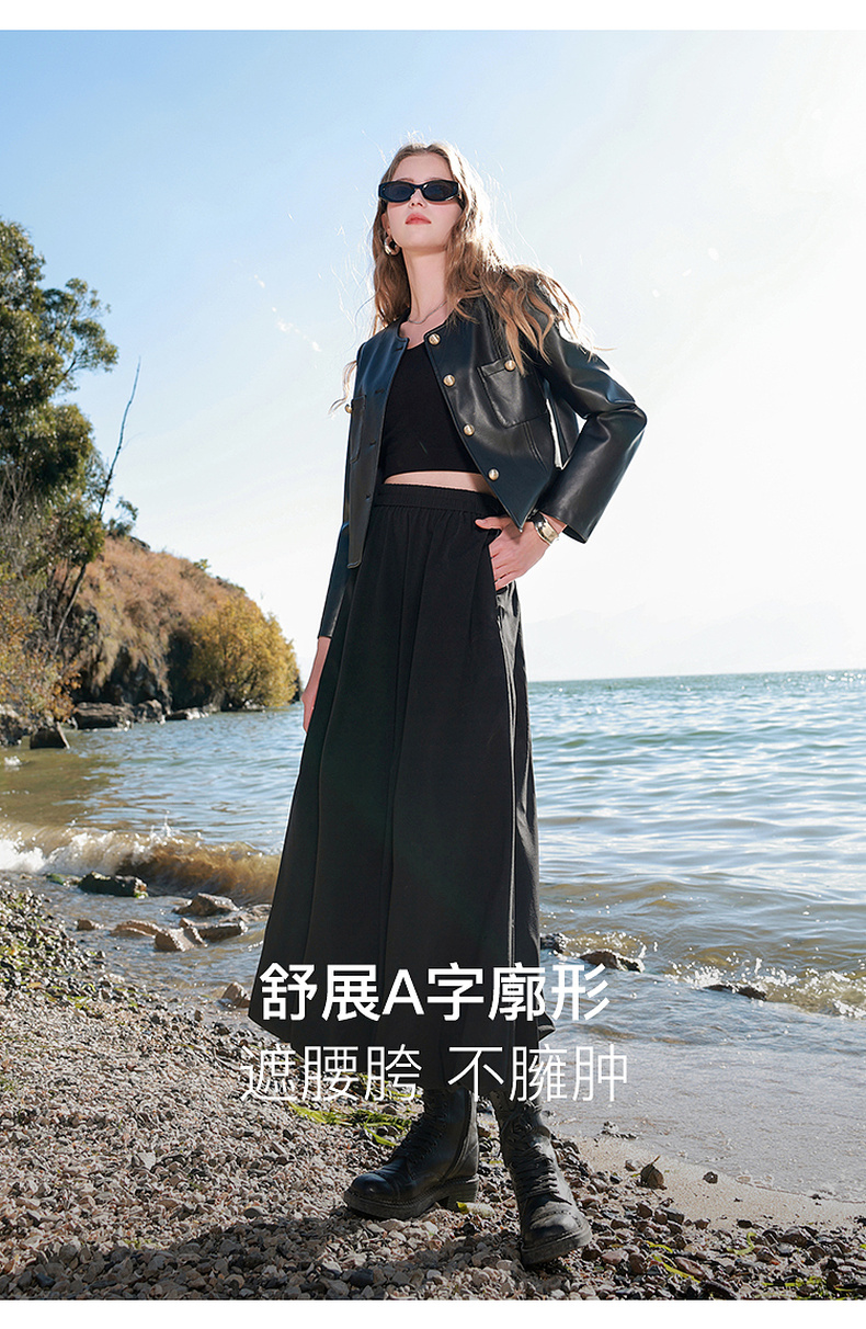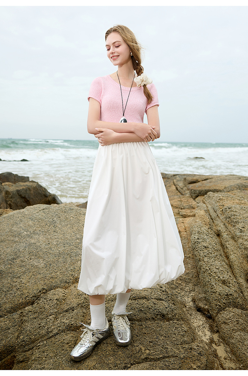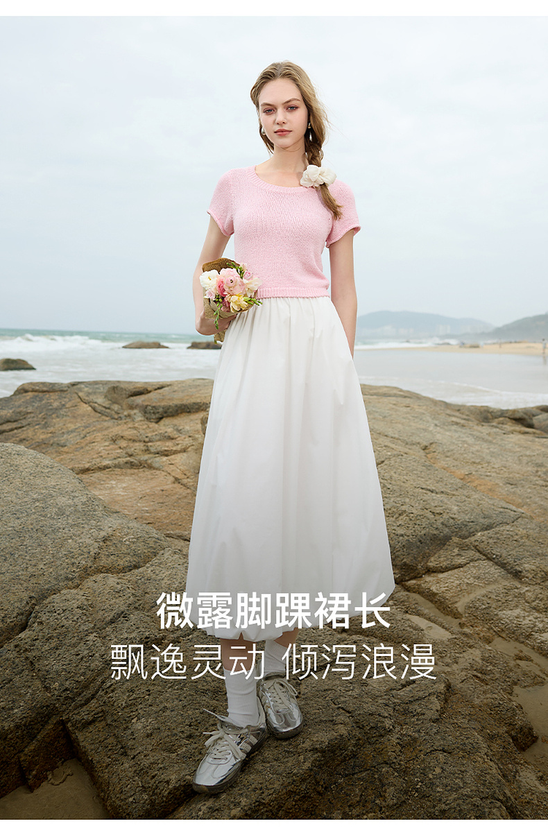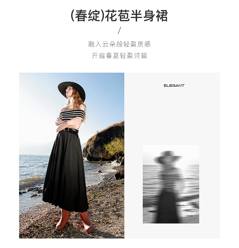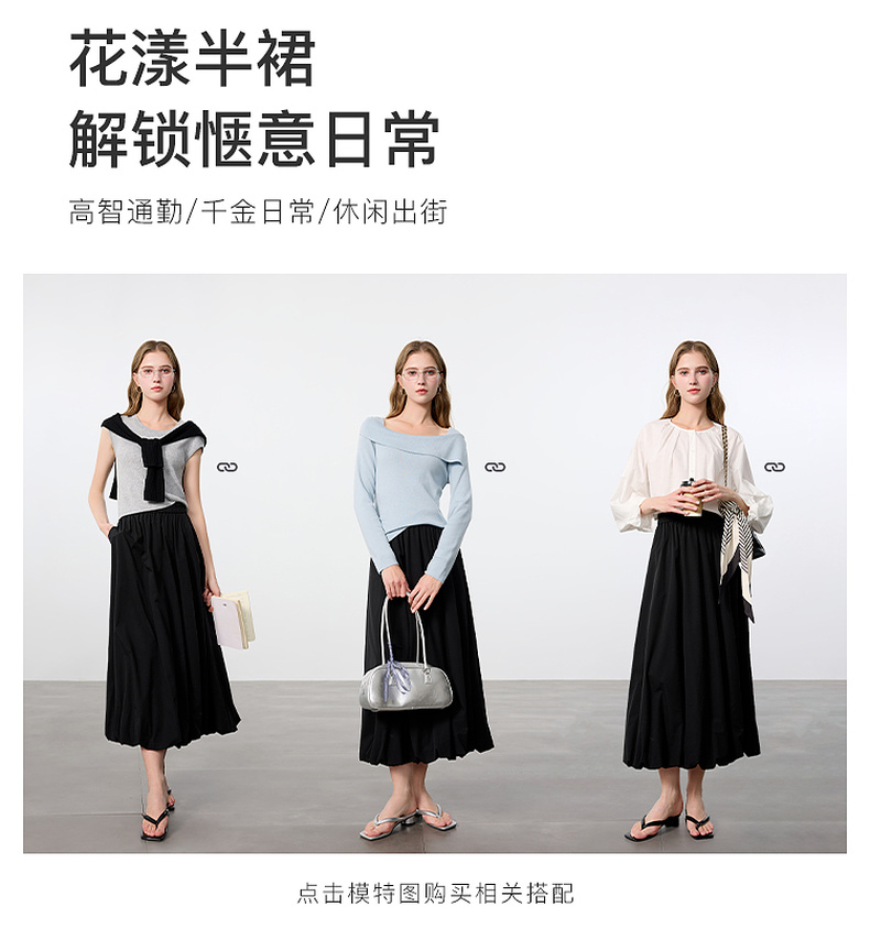 三彩2025春季新款花苞半身裙松紧腰A字裙显瘦长裙简约M