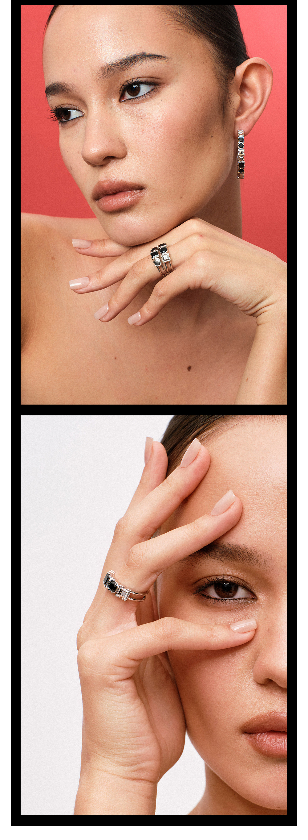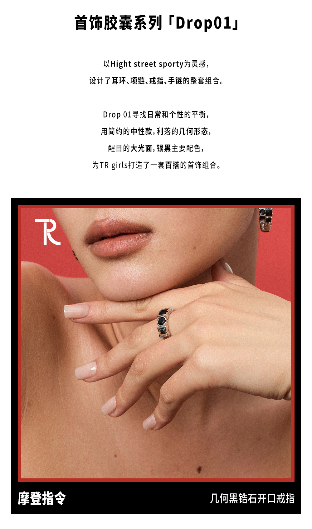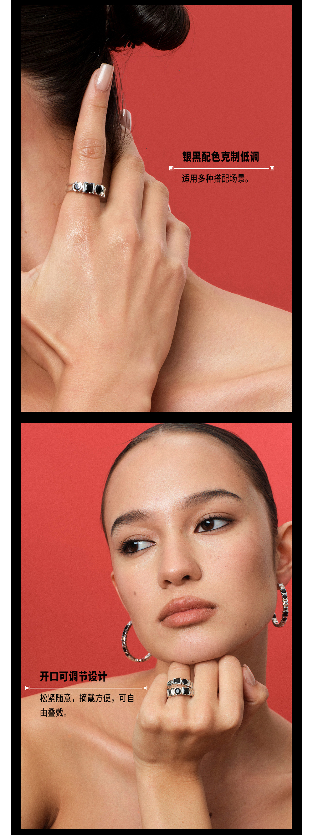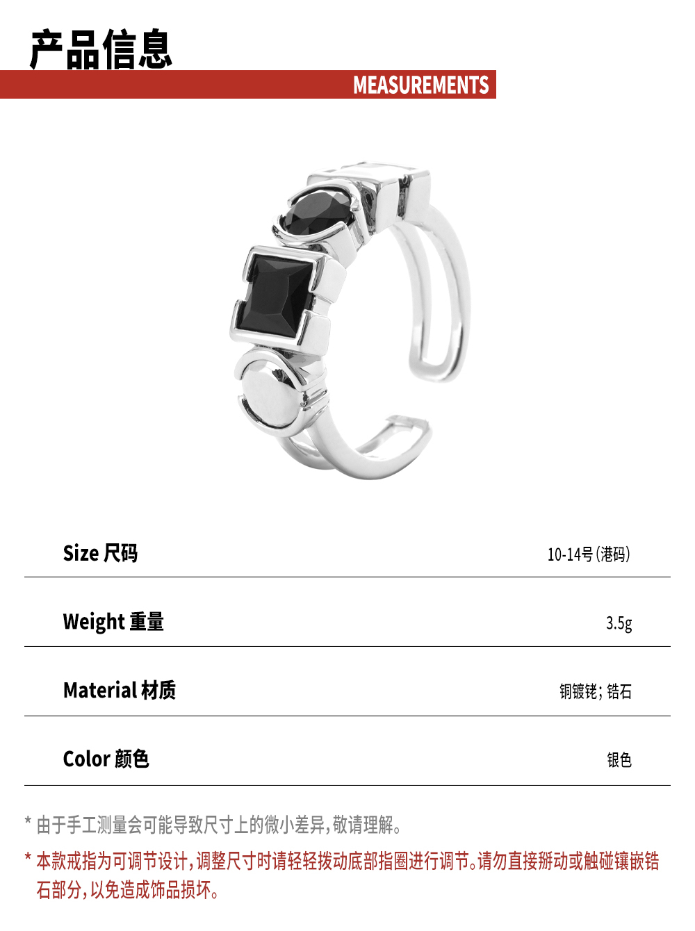 TR她热 摩登指令 银色黑锆石拼接百搭高级设计感叠戴可调节开口戒指