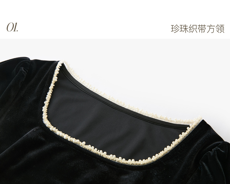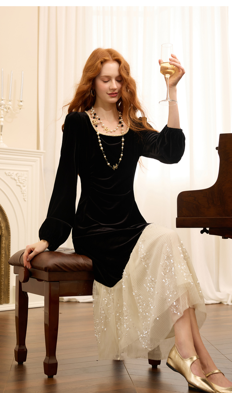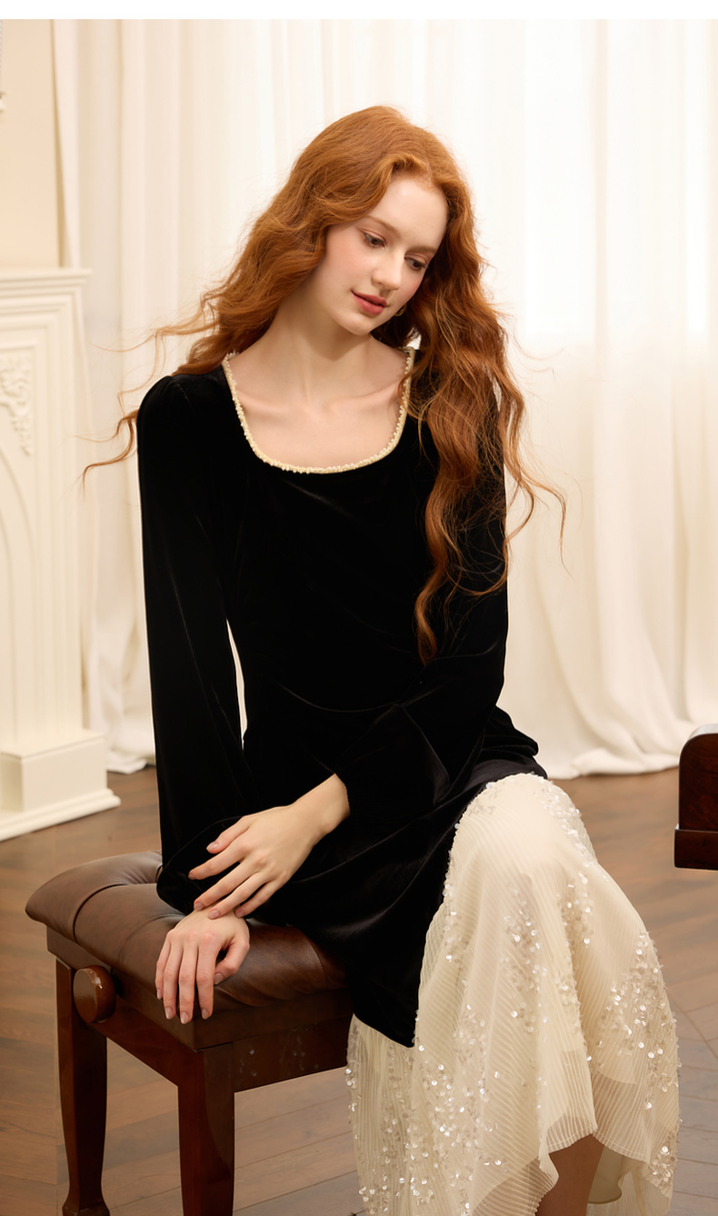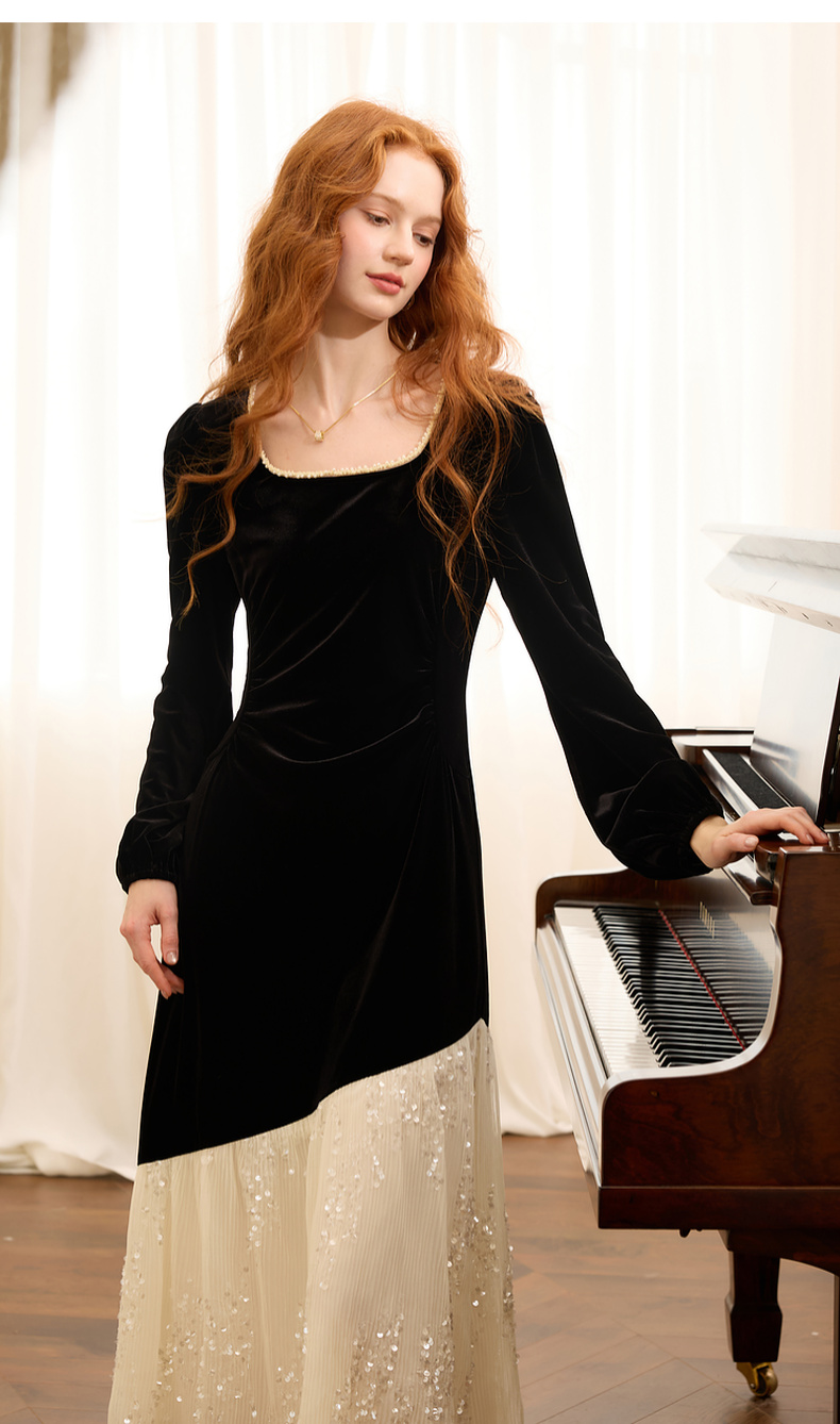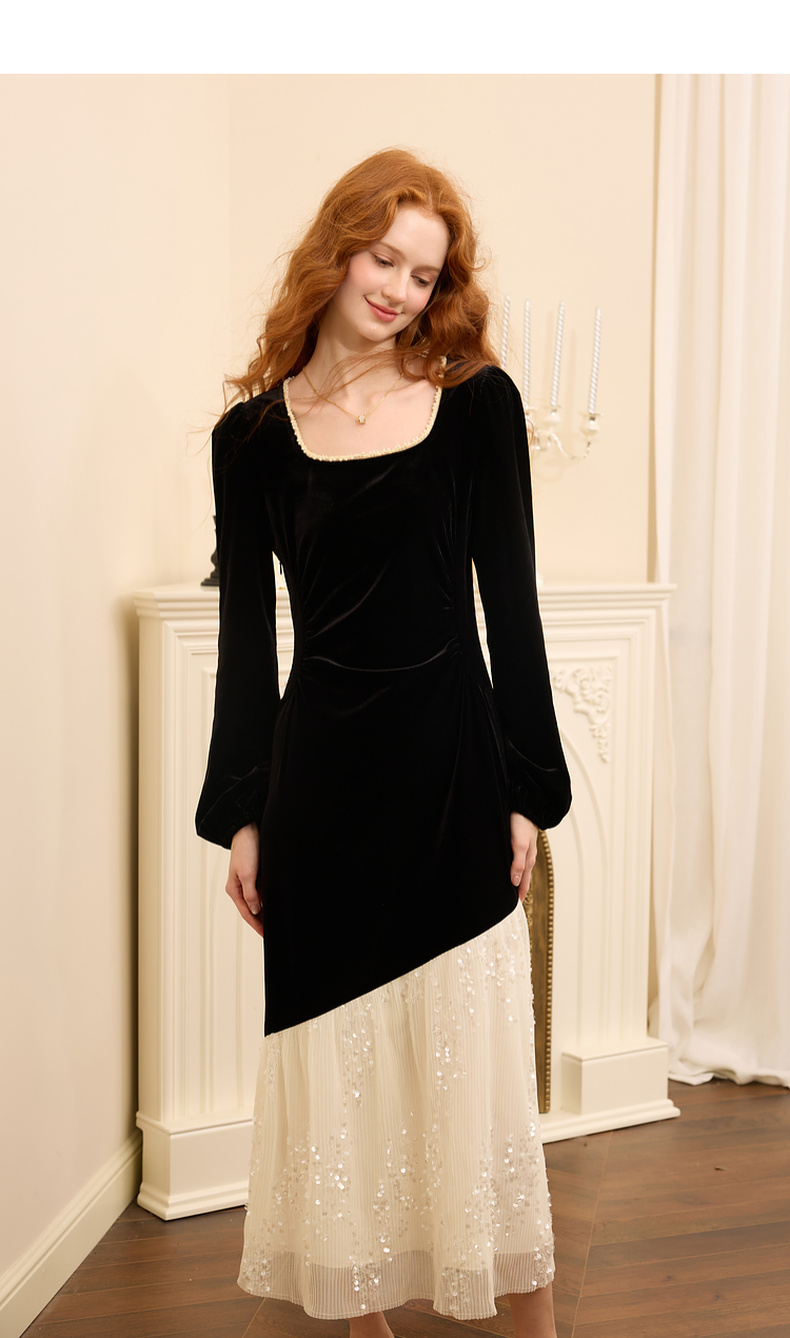 三彩2025冬季新款法式方领长袖收腰连衣裙假两件A字裙长裙M