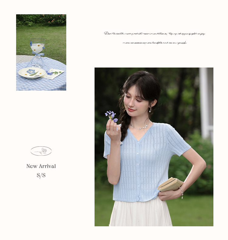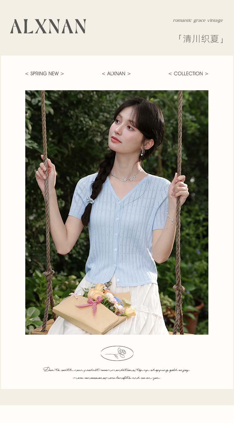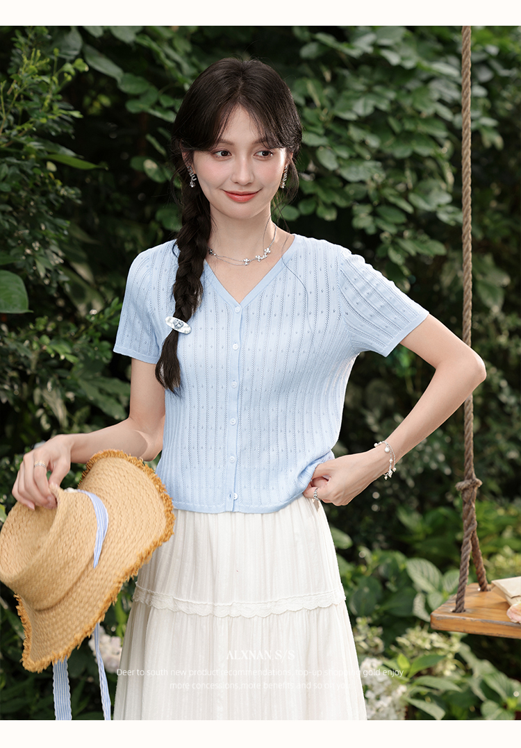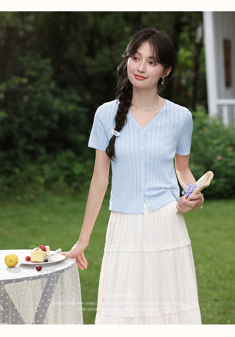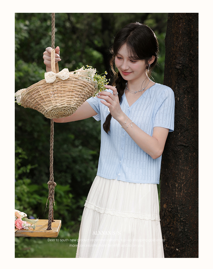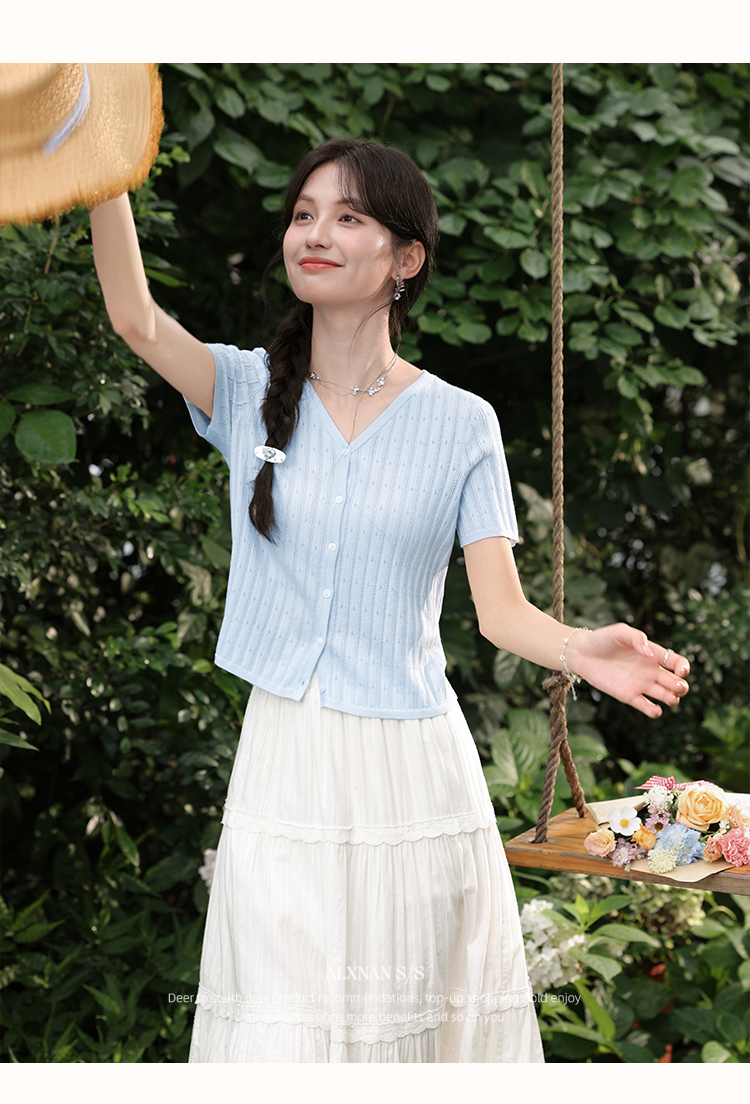 鹿向南「清川织夏」浅蓝色韩系V领针织衫女夏薄款设计感短袖上衣