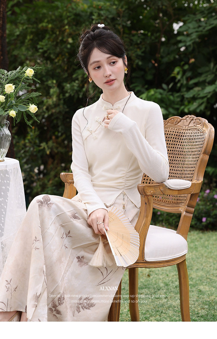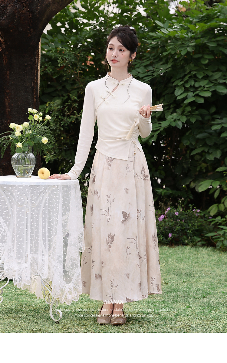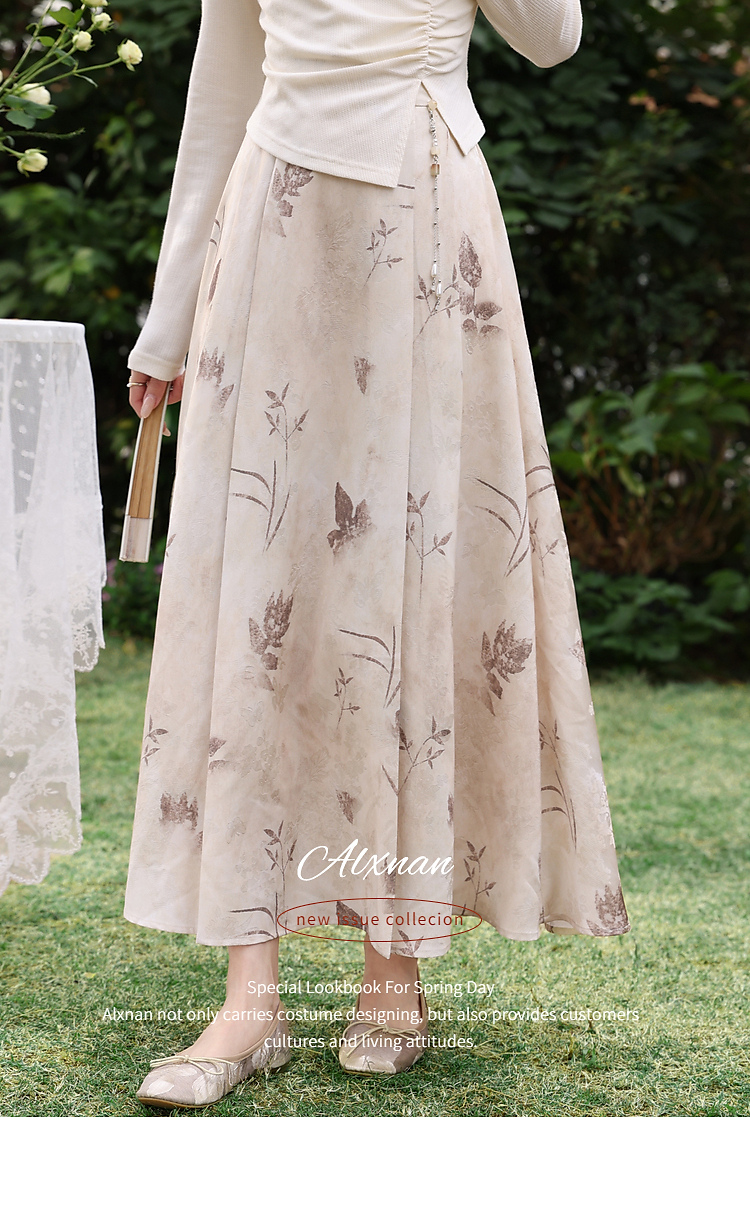 鹿向南「枯蝶逸境」新中式国风碎花半身裙女春季新款杏色中长裙子