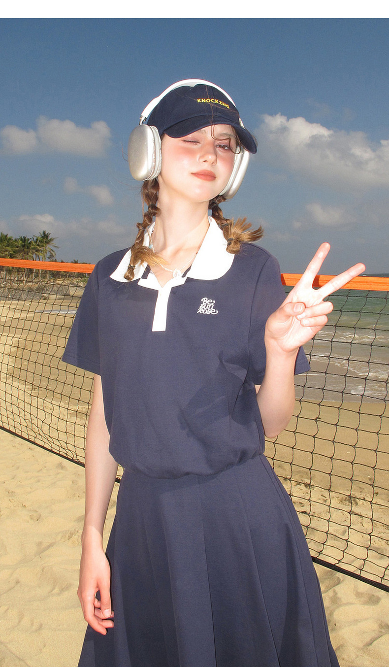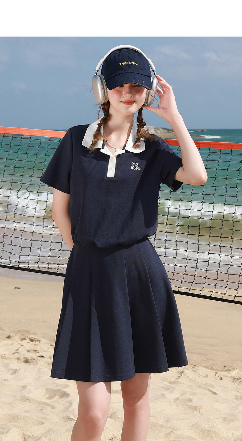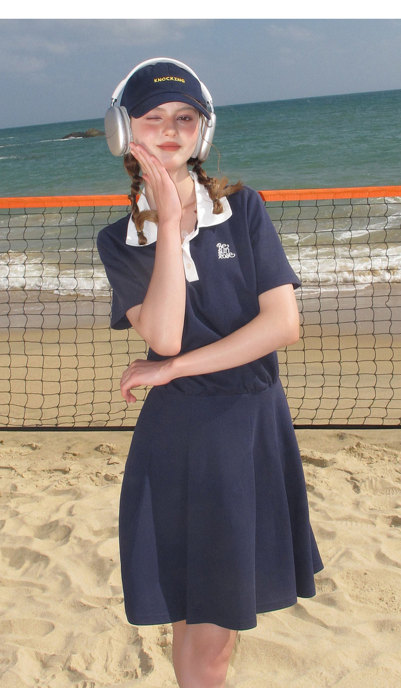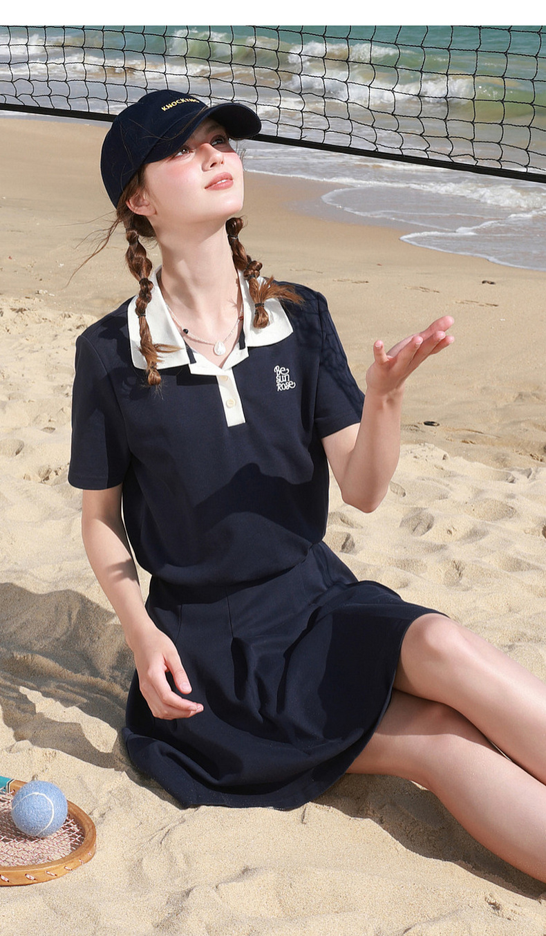 三彩独醒2026夏季新款假两件连衣裙短袖收腰A字裙短裙F
