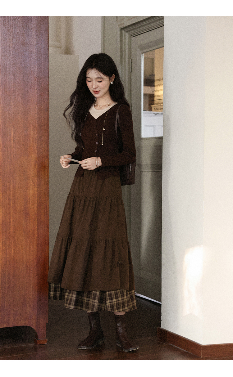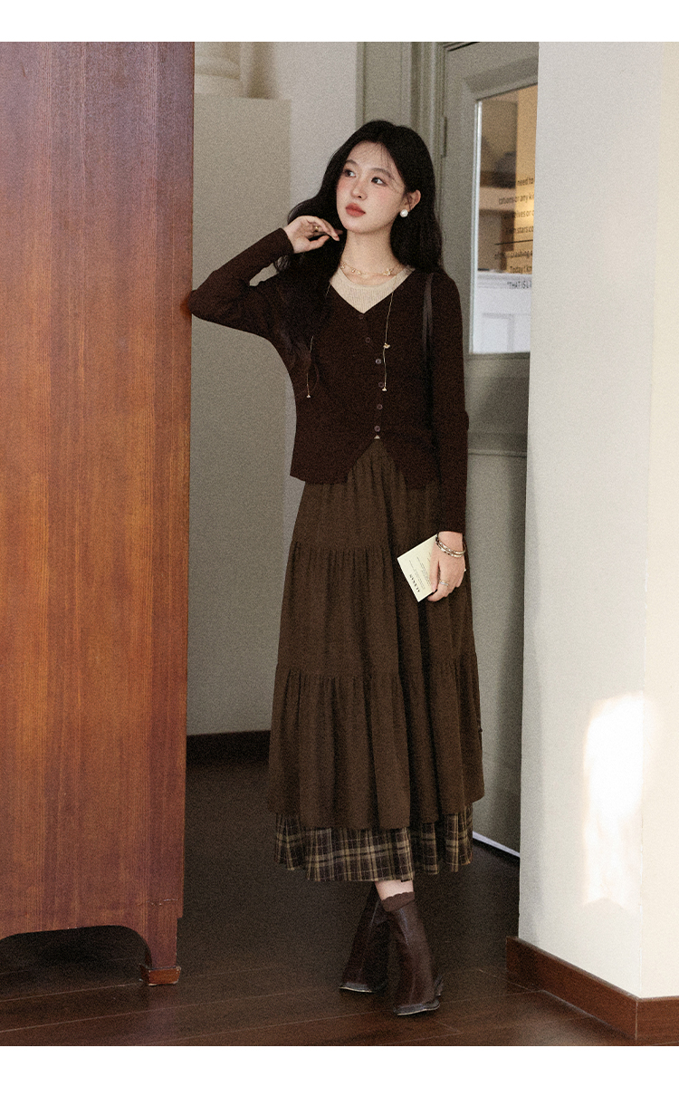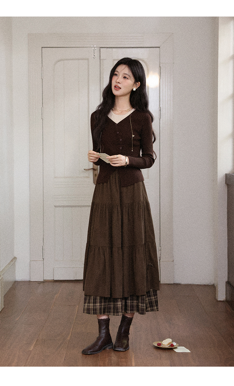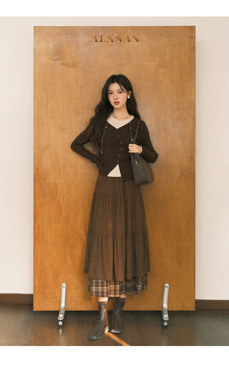 鹿向南「褐咖柔章」咖色拼接格子半身裙早秋新款百搭通勤长裙女款