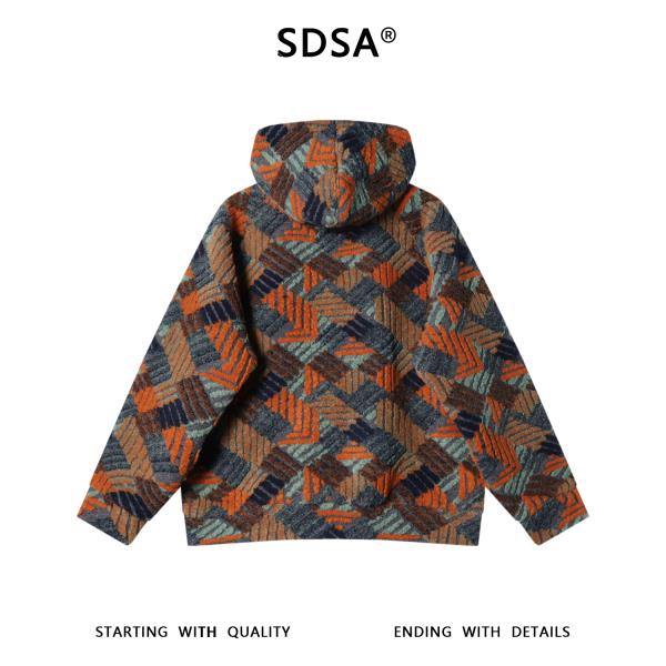 55139秋冬新款复古重工水洗几何图案潮流宽松连帽情侣休闲长袖