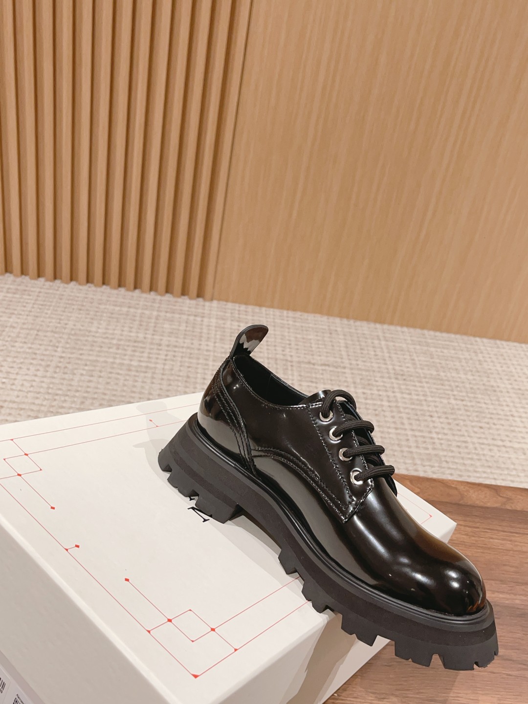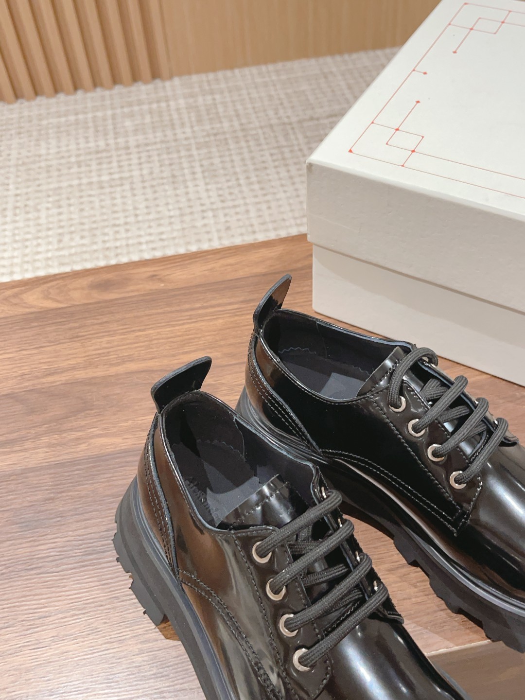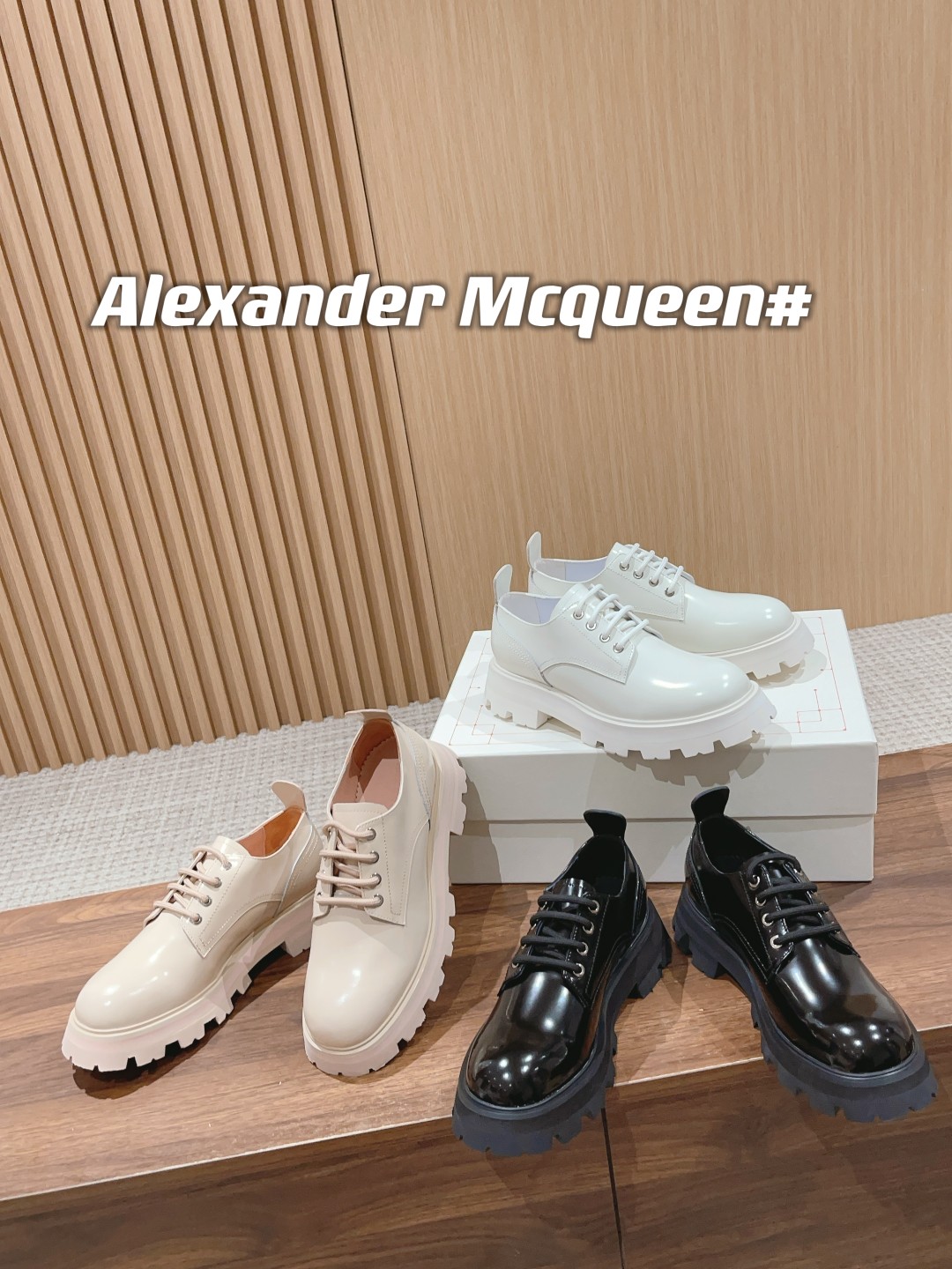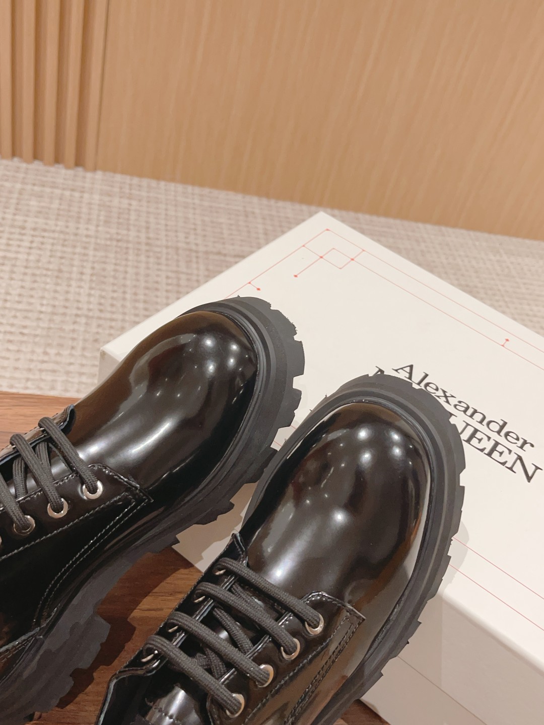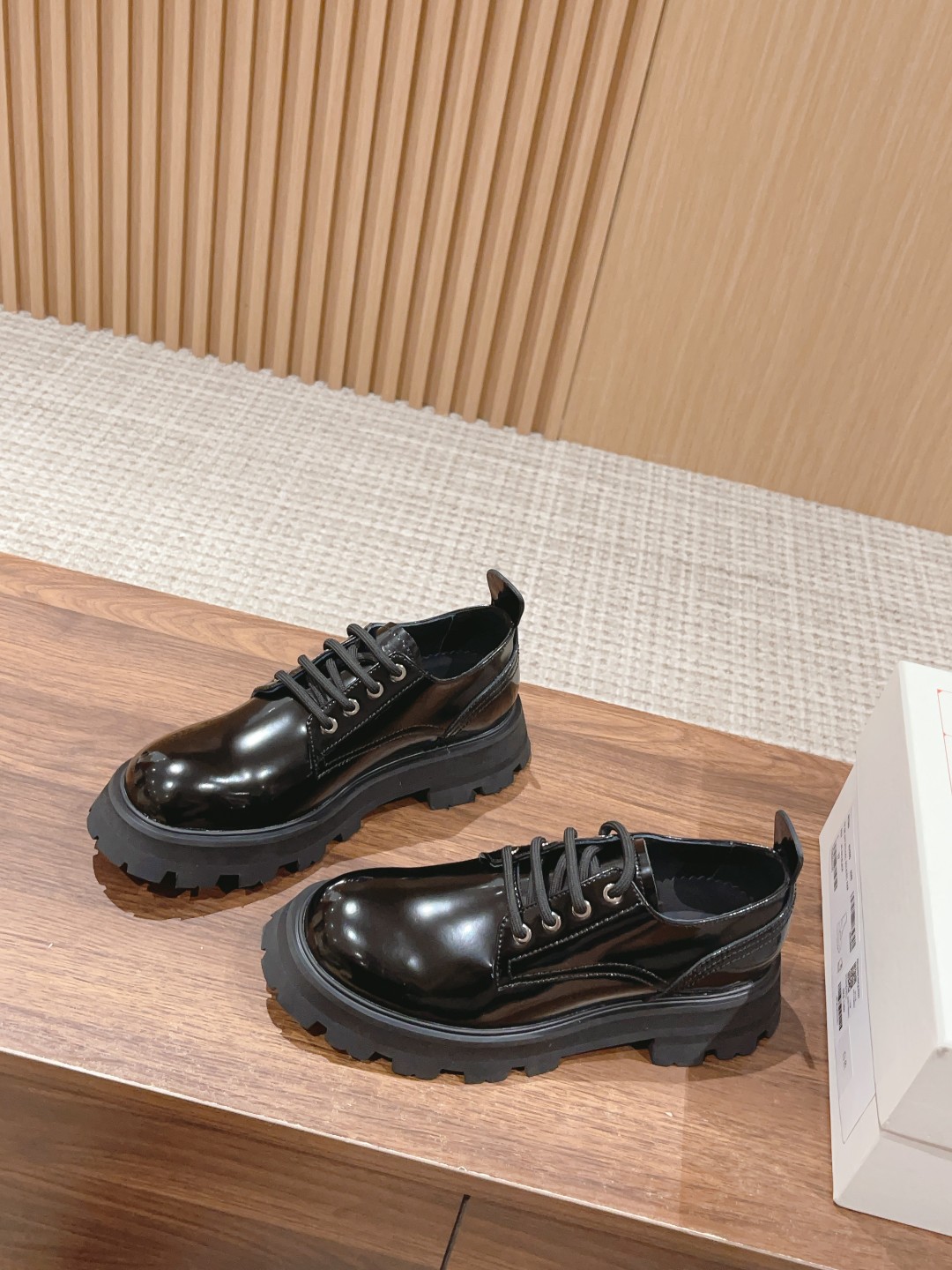 #系列 英伦风乐福鞋 小皮鞋 短靴 当然作为休闲百搭的“王中王”麦昆自然也没有落下风~它来了!经典复古风,鞋型非常秀气,上脚舒服,进口开边珠牛皮,采用明线细节、夸张廓形橡胶沟纹鞋底和圆头造型。 经典的厚底设计它依然还是上脚秒变长腿MM的调性,特别受欢迎颇有一些帅气的范儿,走起路来,明晃晃的质感可以说能够抓足了眼球!
