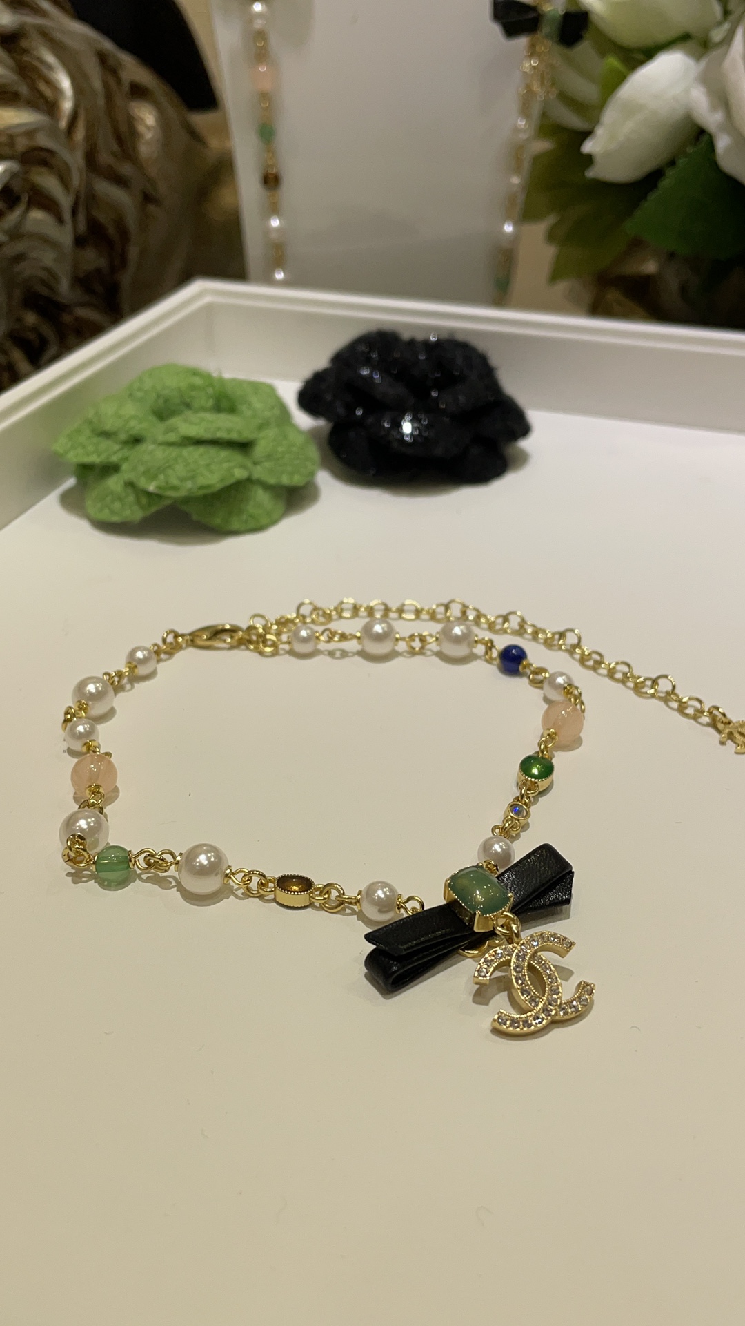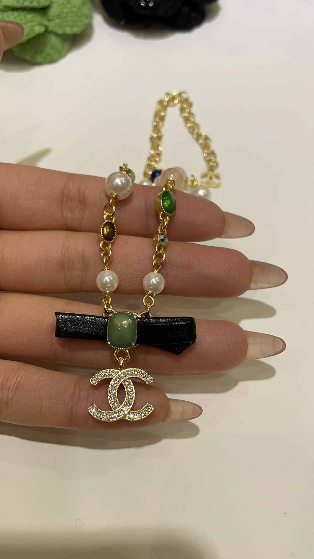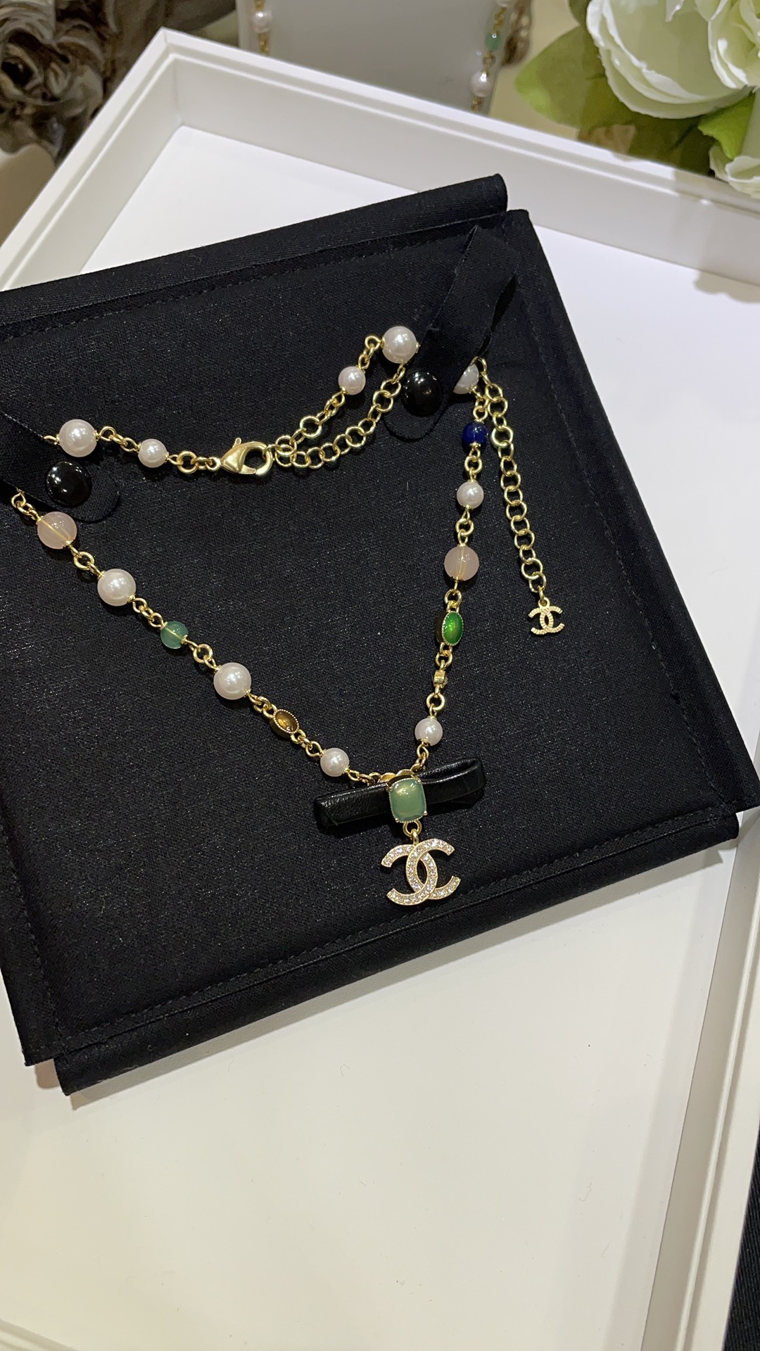 香奶奶 24A新款满钻双C绿色方块宝石黑色蝴蝶结珍珠项链