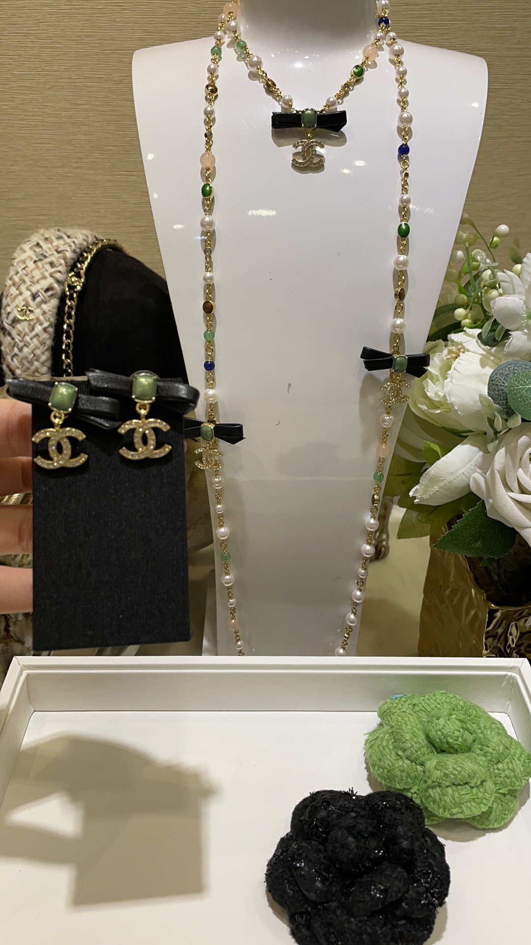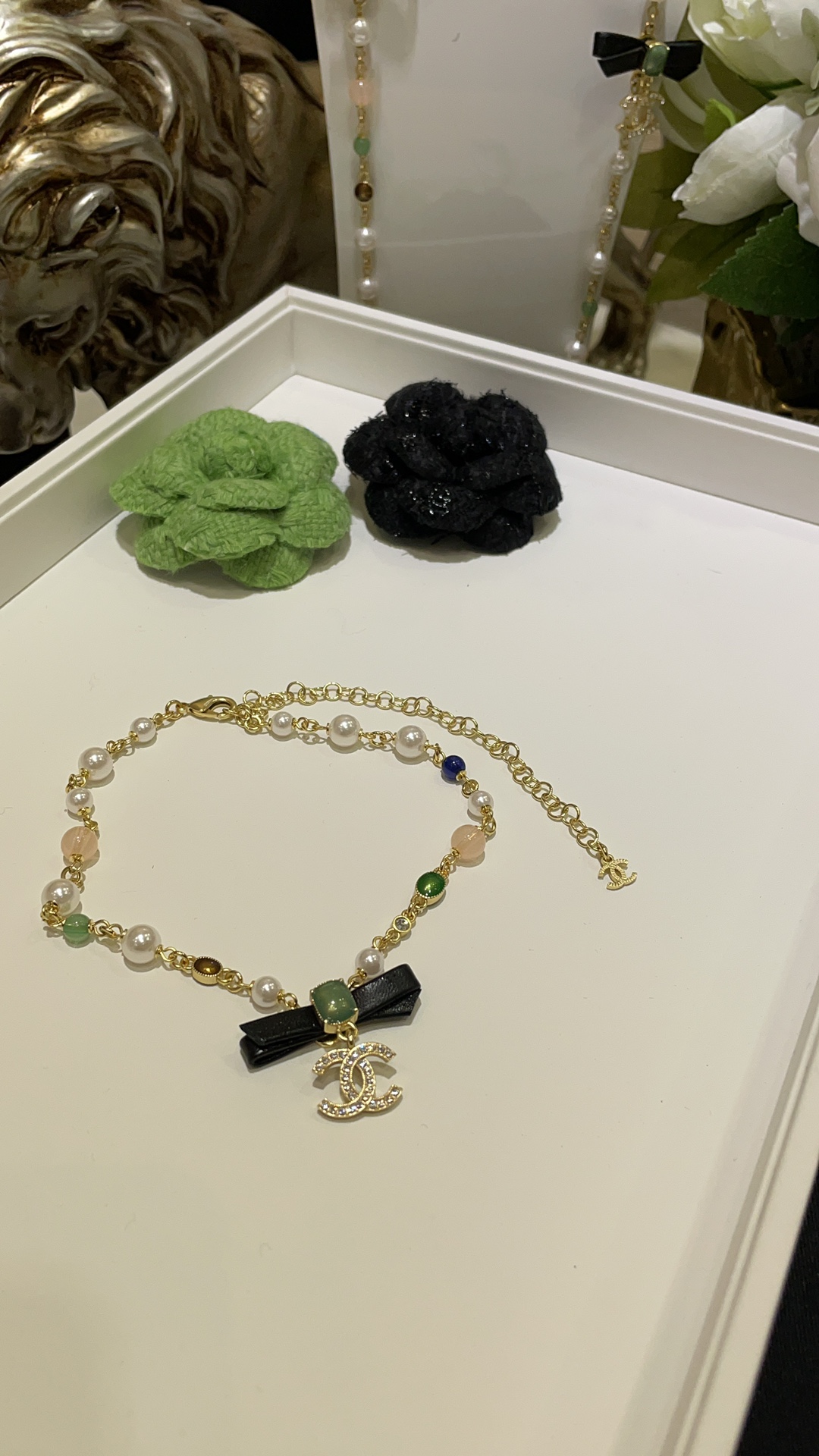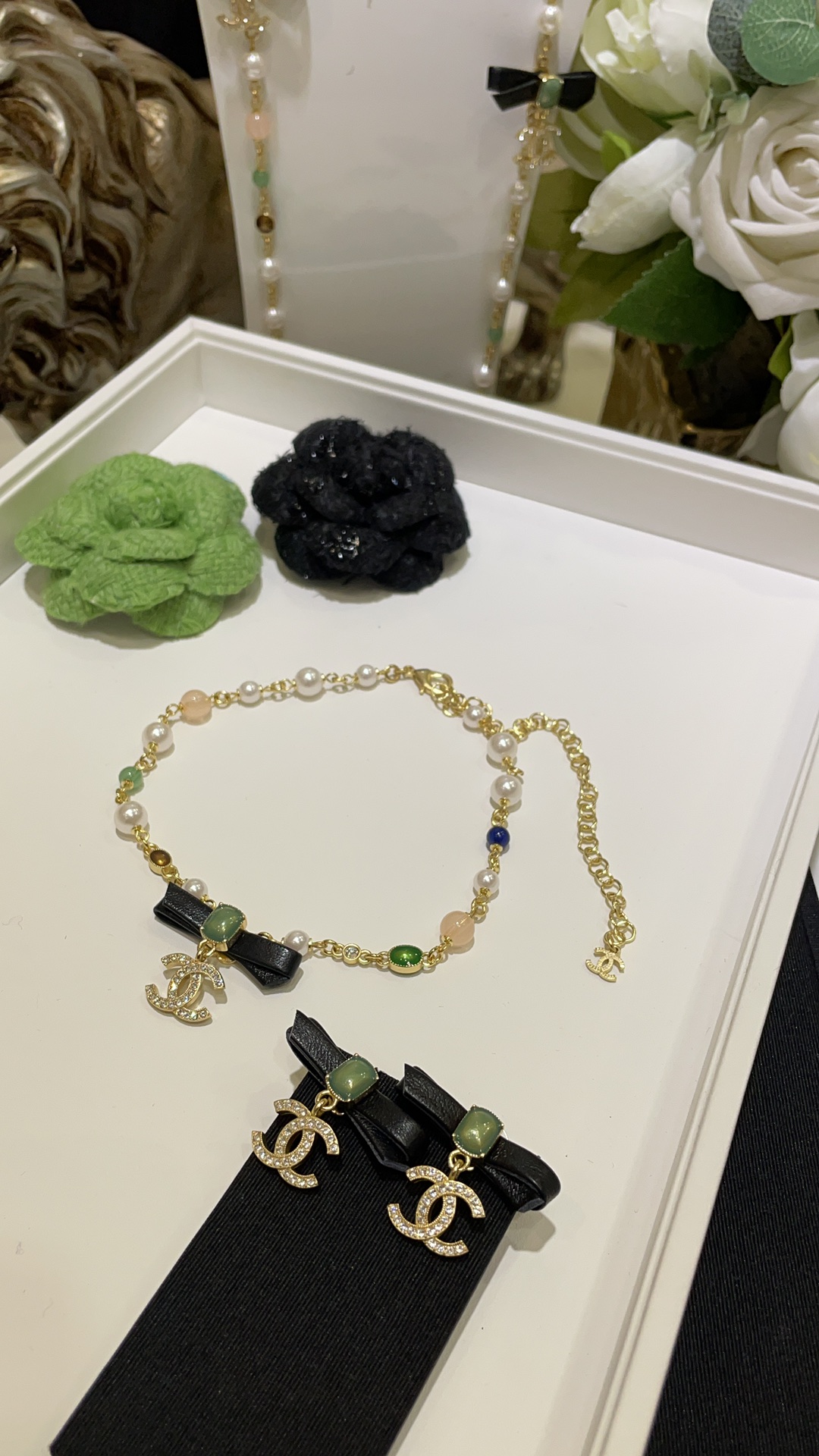 香奶奶 24A新款满钻双C绿色方块宝石黑色蝴蝶结珍珠项链