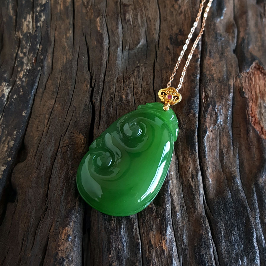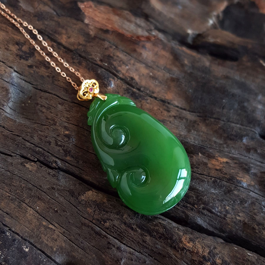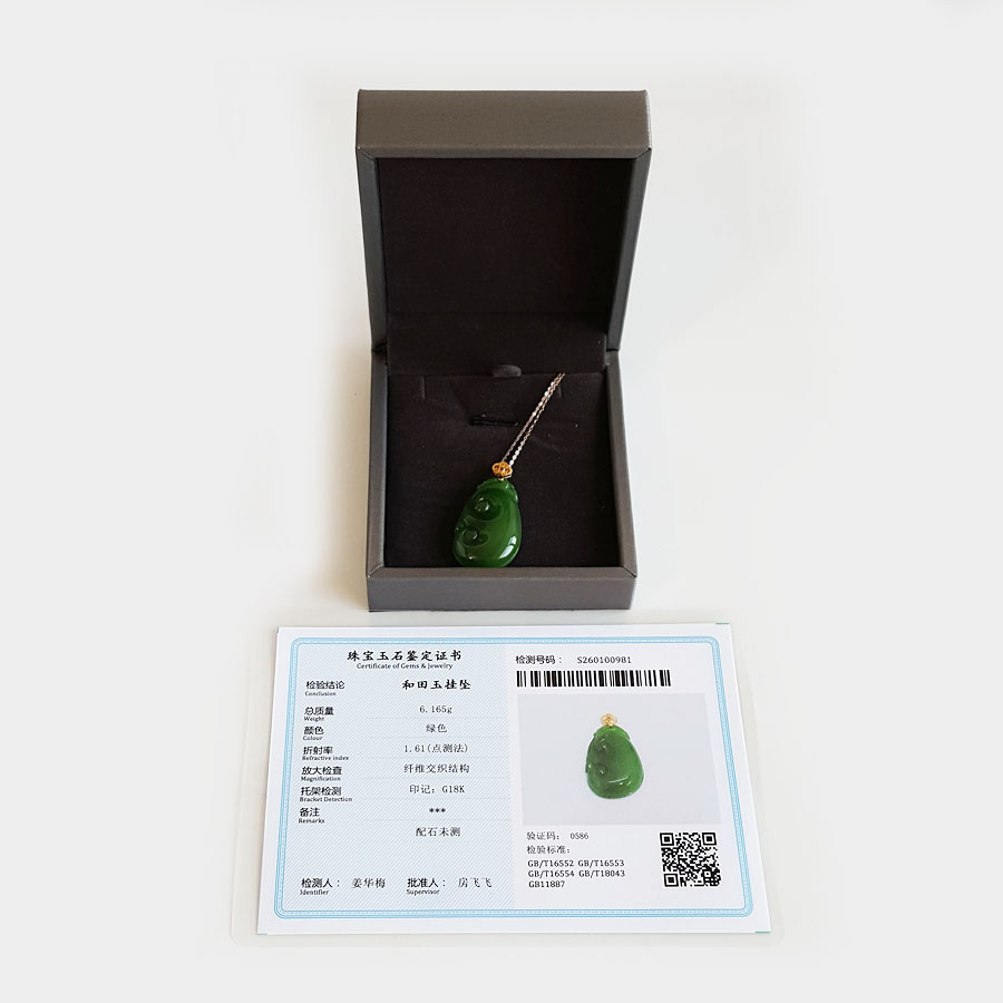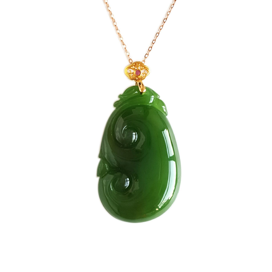 名称 | AU750黄金镶天然细腻菠菜绿无黑点如意(万事如意)和田玉碧玉吊坠项链 |